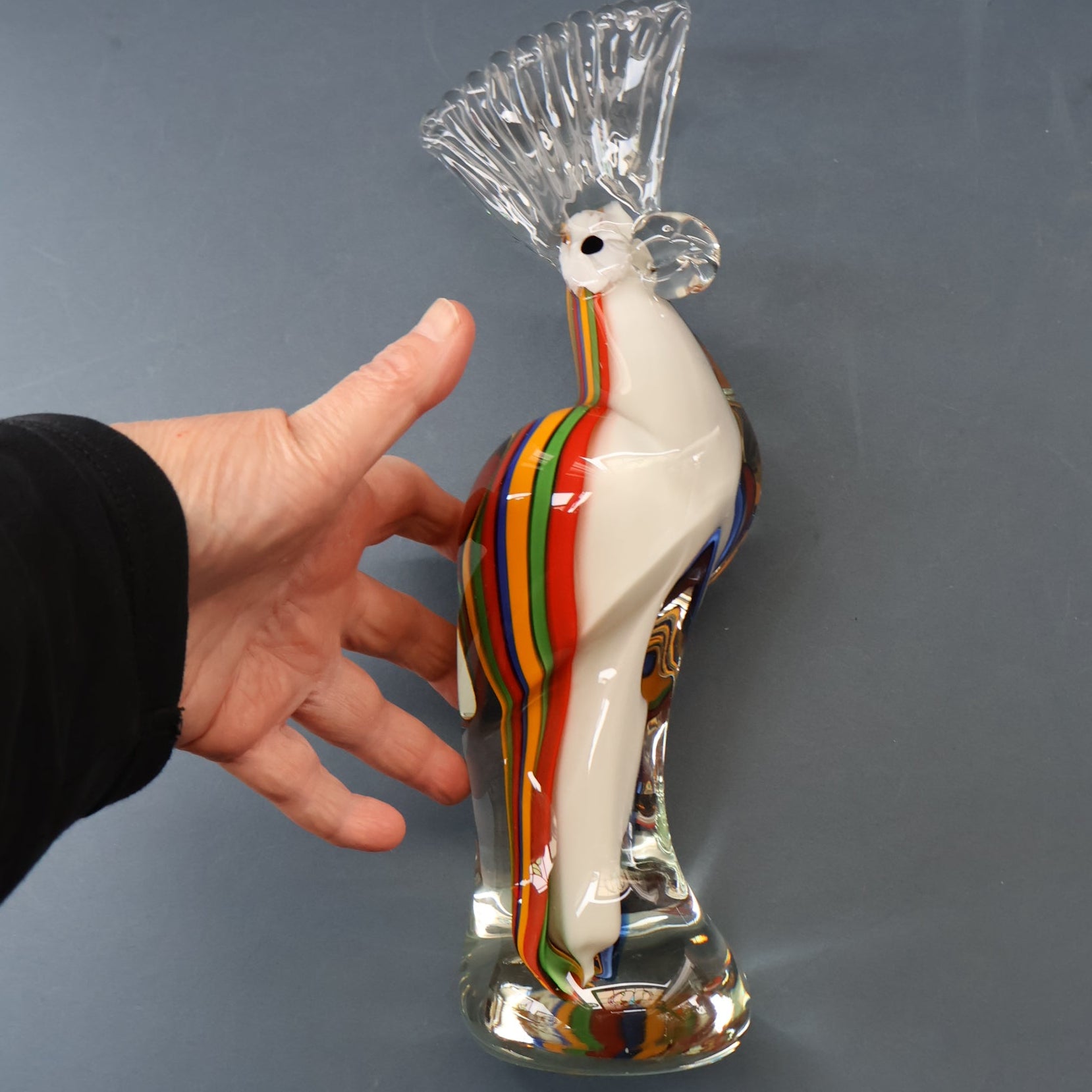 This is a decorative large glass cockatoo. He has possibly been made at Formia Vetri Murano in Italy, but he is definitely Italian in origin. I would image that he dates to around the 1970s / 1980s.
