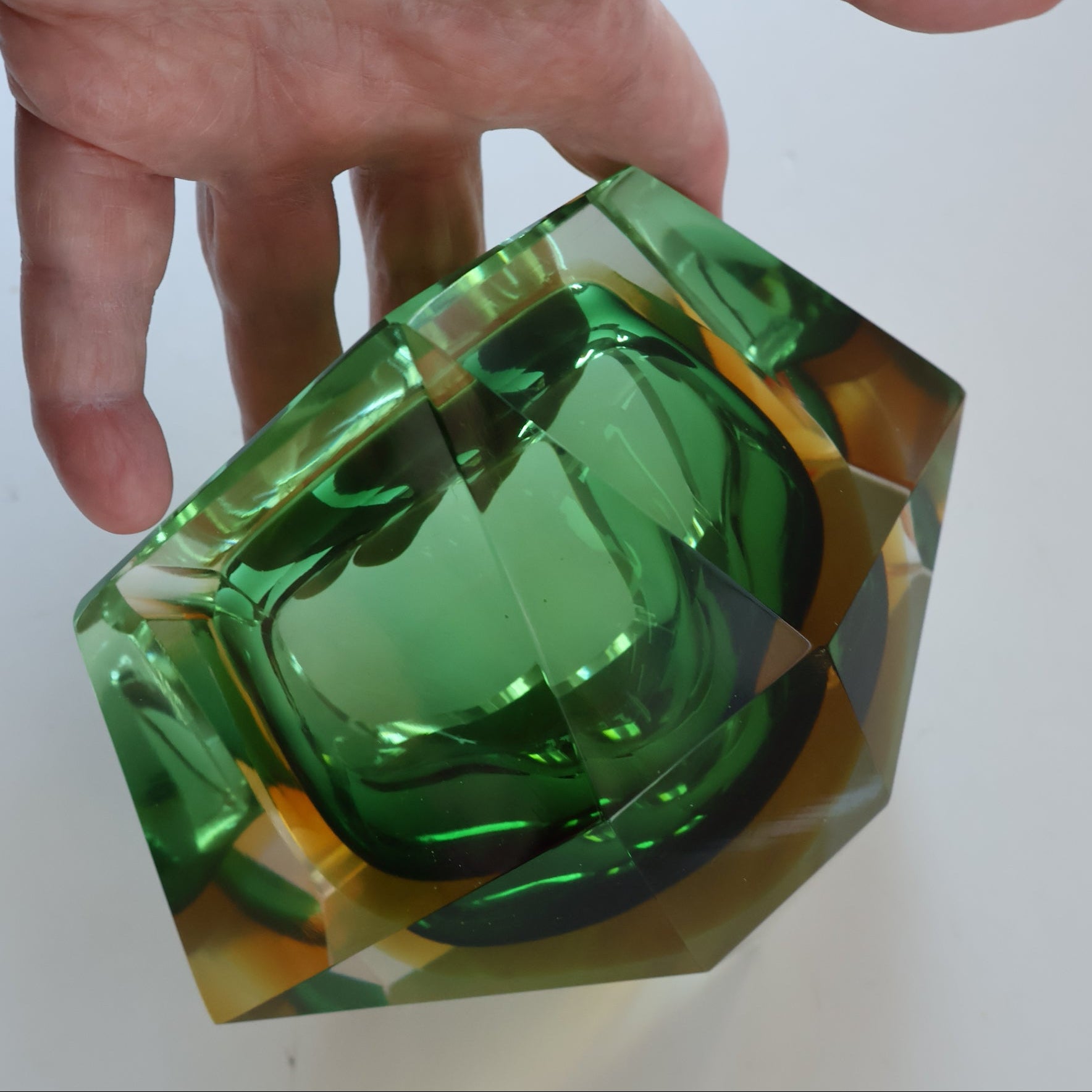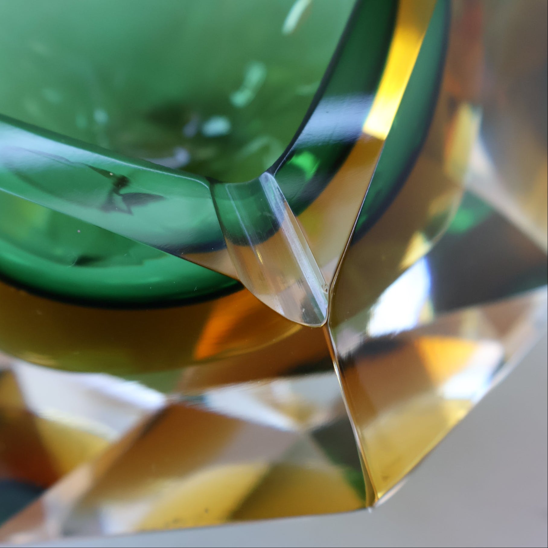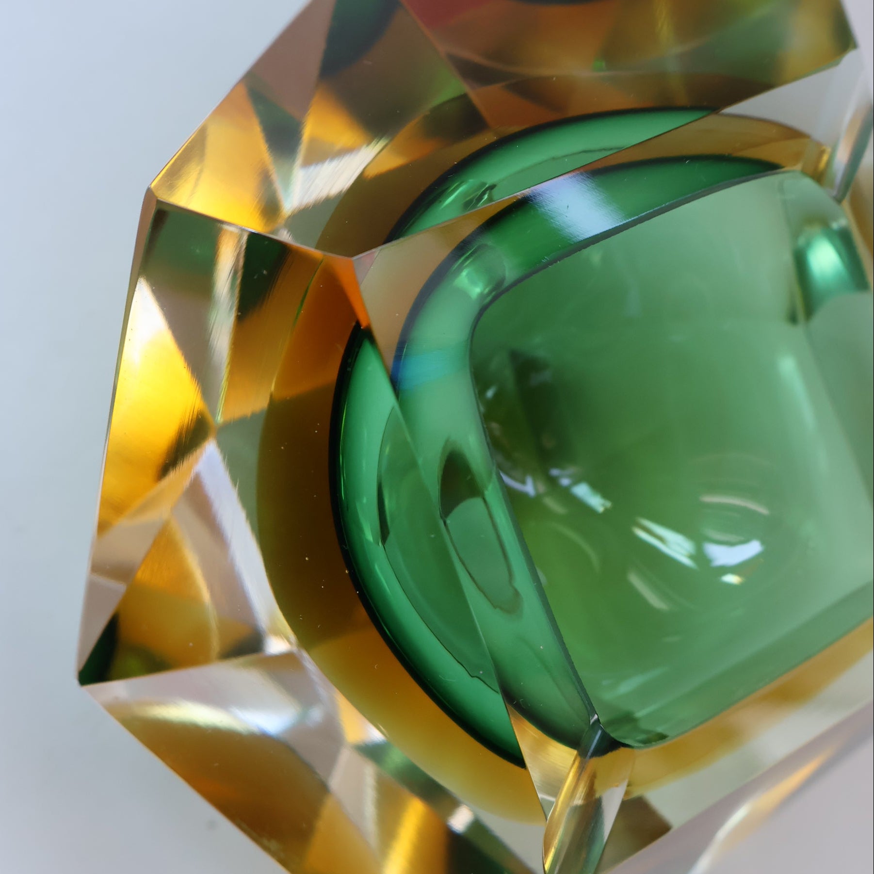 Large 1960s MURANO Faceted Glass Bowl. Vintage Sommerso Geode Green, Yellow and Clear Bowl