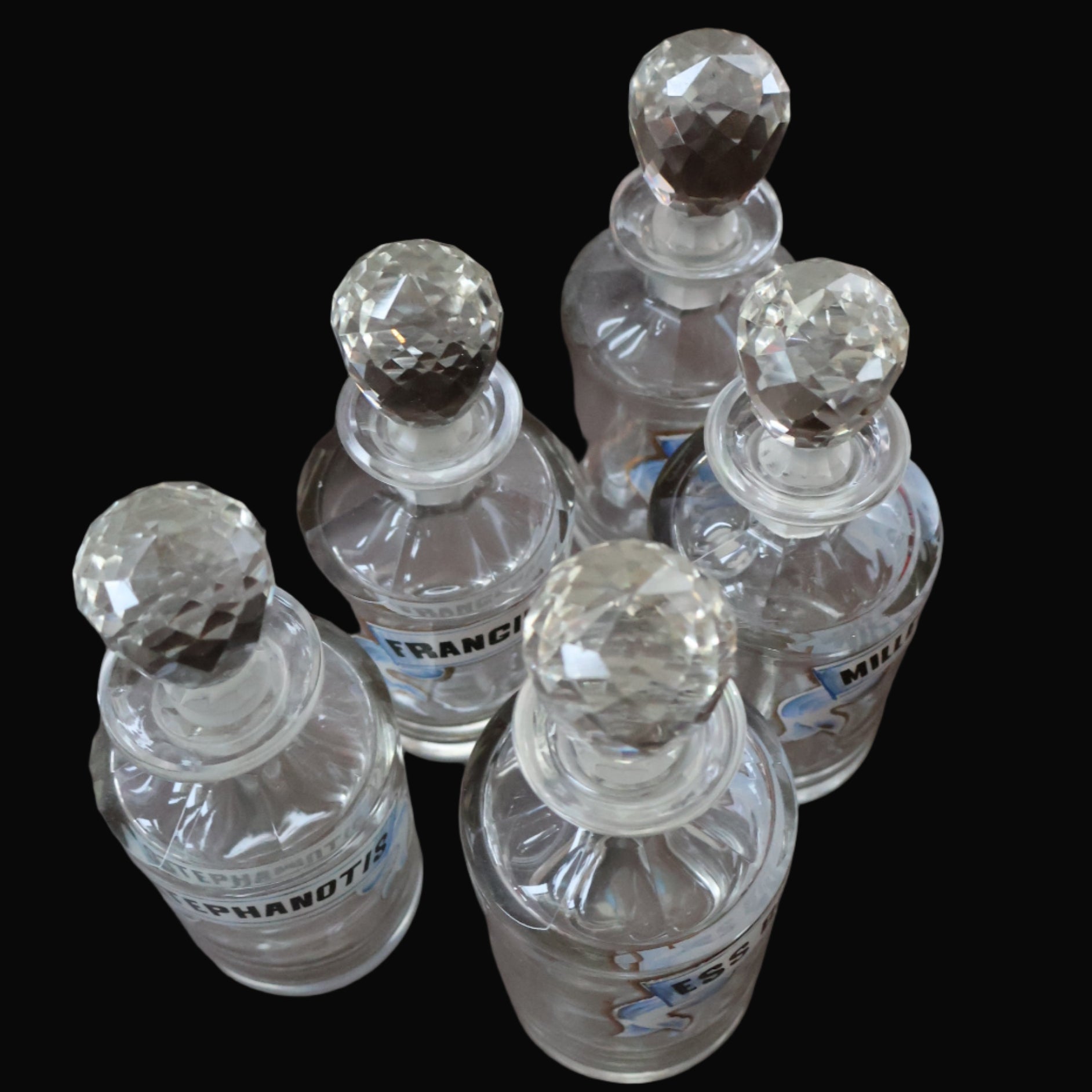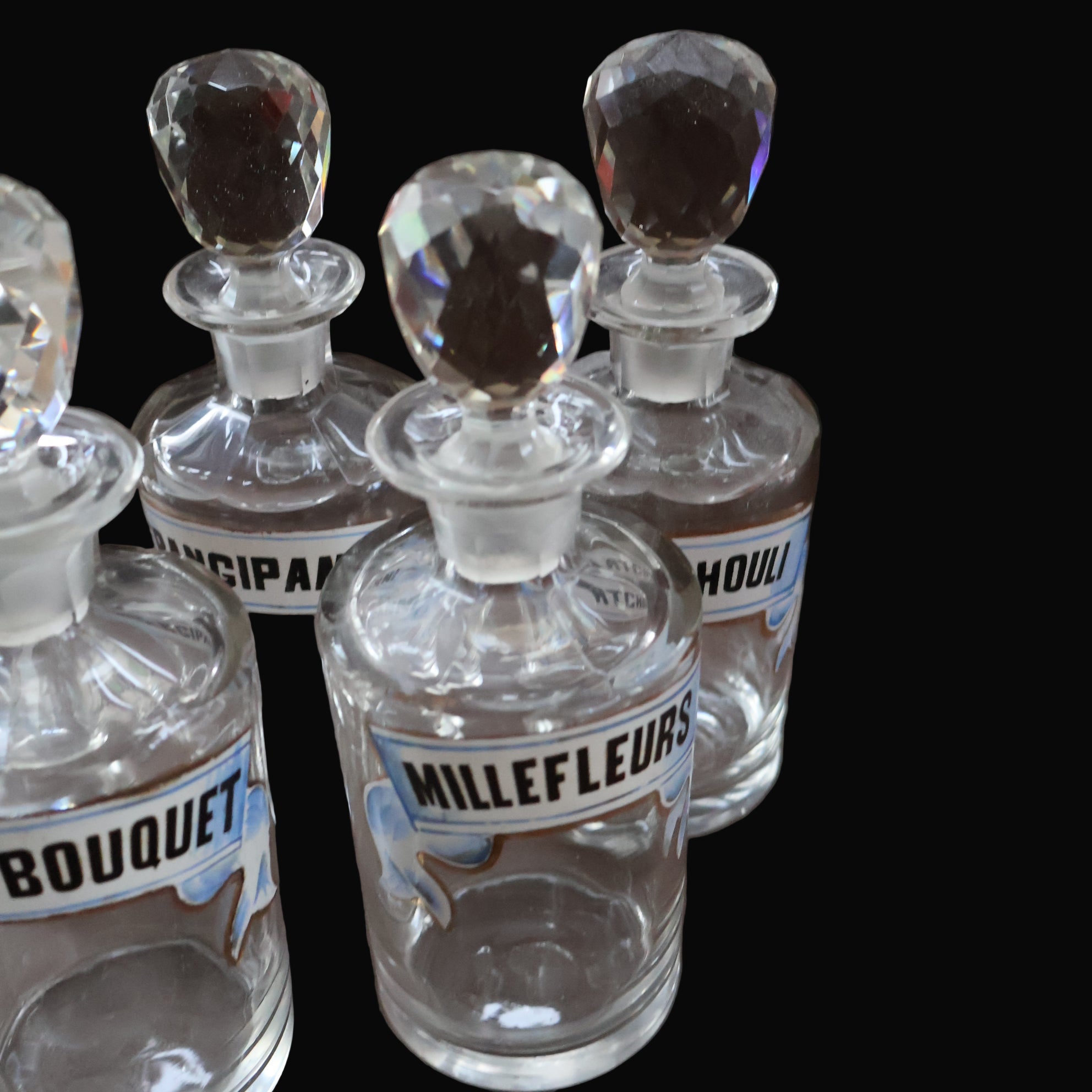 Each bottle must have been produced as a set - perhaps for display in a fancy Parisian shop or in a fine boudoir.
