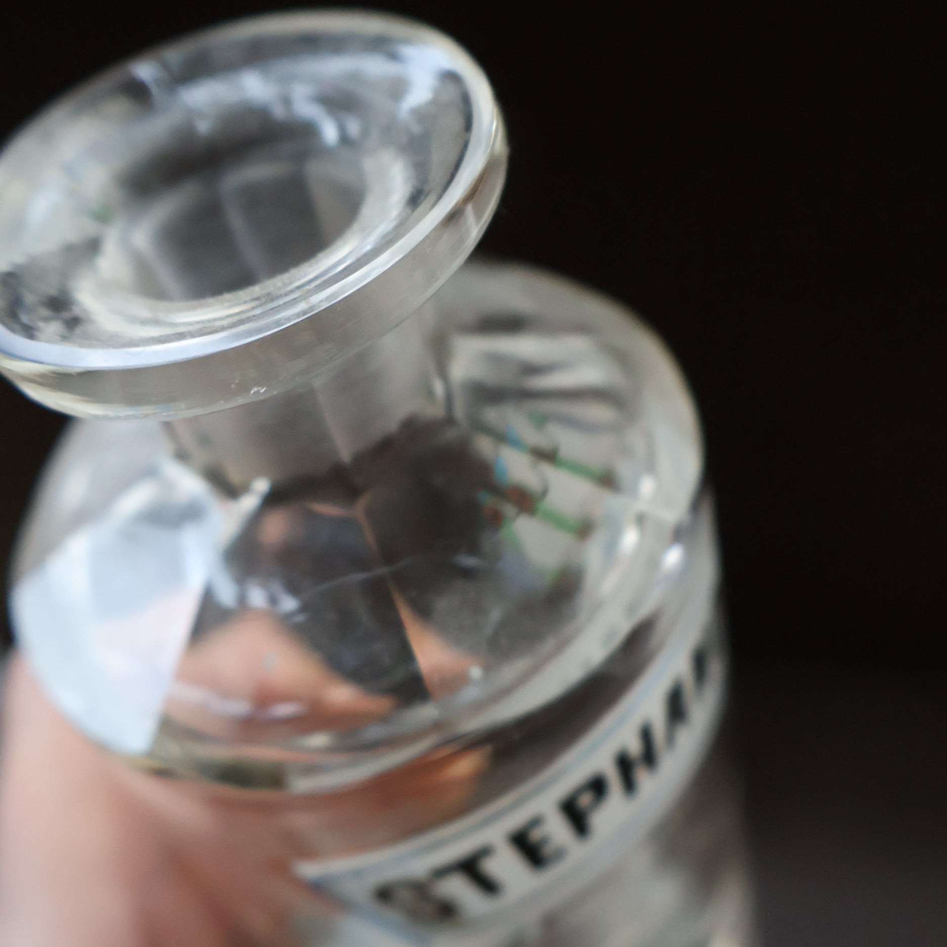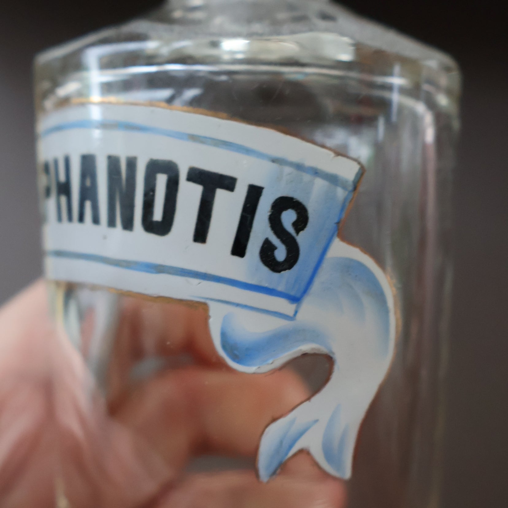 The thing that makes my bottles so special are the matched decorative labels on each of them. The label is original hand painted enamel - it take the form of a little Art Nouveau style ribbon with curling forks to the strip at each end. The name of the contents painted on the ribbon and refers to the inside.
