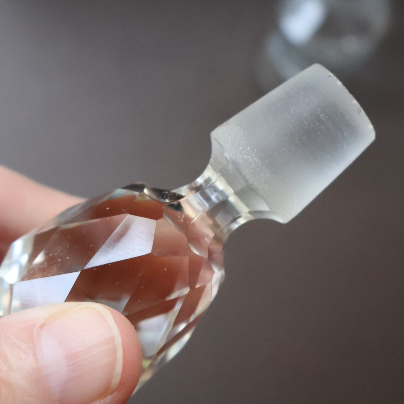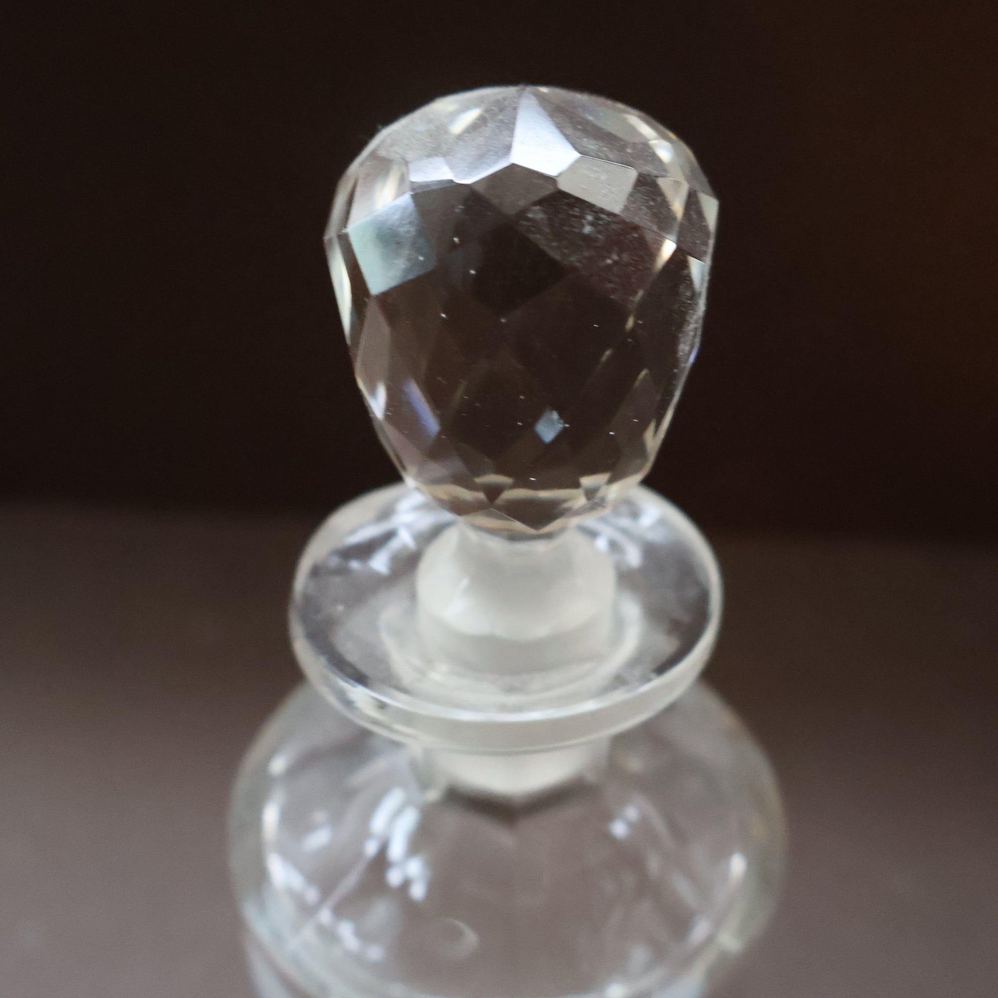 I am attributing these bottles to being by Baccarat. They are of cylindrical form with a fluted collar around the neck and a neck which flares out to the lip. They bottle has been hand-blown and there is a pontil mark on the base. I love the stopper or dropper - which has an egg shaped knop and this is covered all over with a mesh of facets which glitter in the light.
