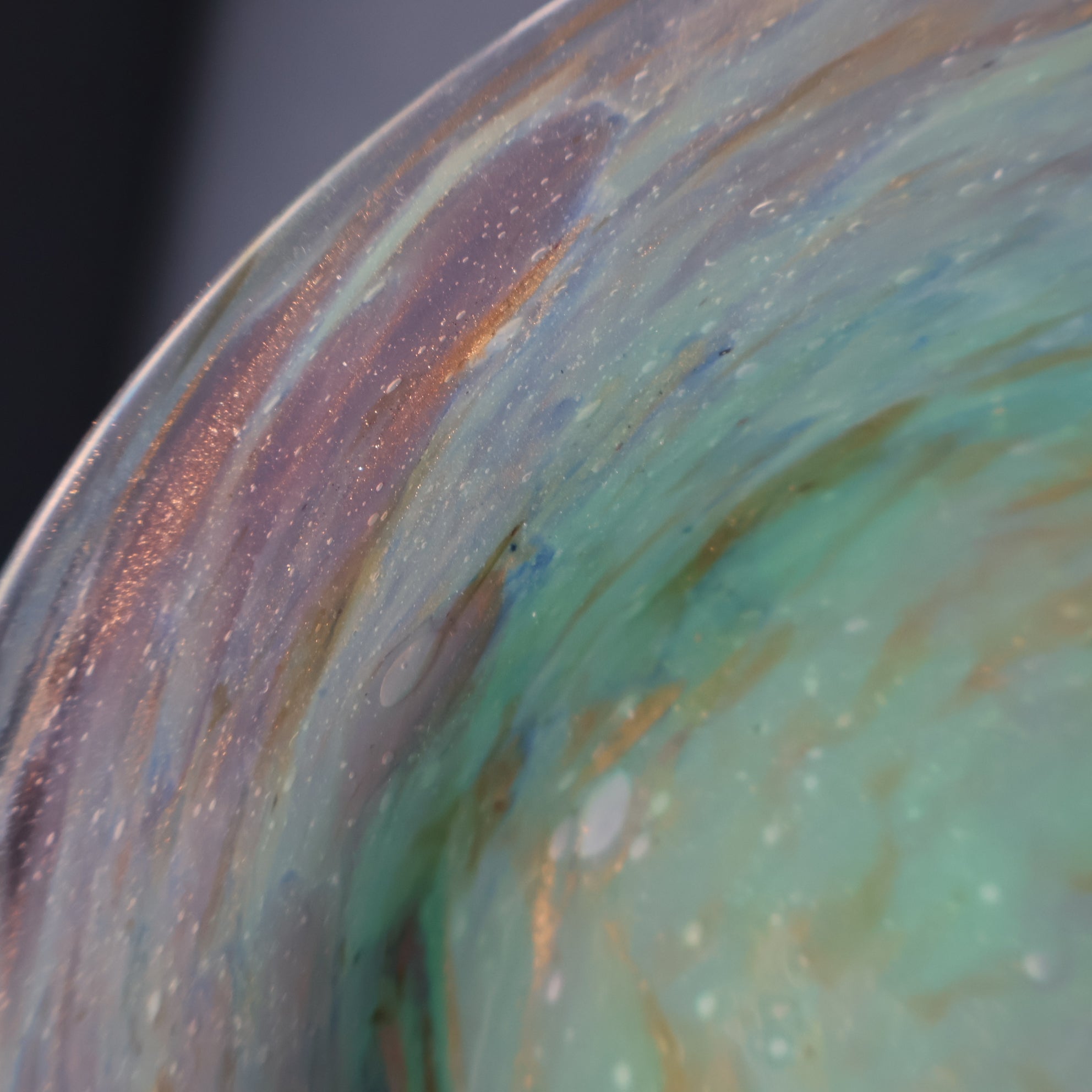 This is a good starter piece for your collection of Monart glass. The body colour is a mottled sea-green glass. Around the rim, there is a clear glass band which is liberally speckled with lots of gold aventurines that twinkle in the light. The base is polished and there is a polished pontil mark. It has no label - but it is definitely an old Monart glass dish and is being sold as such.