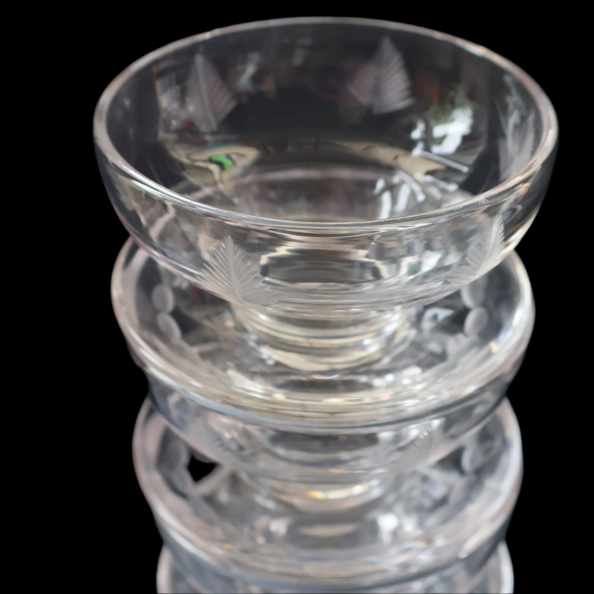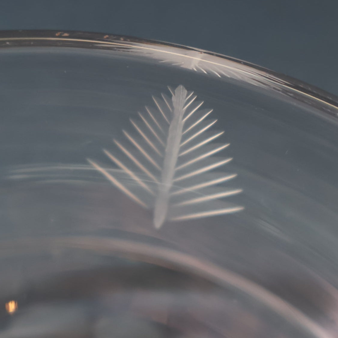 They are decorated with a fabulous mid-century pattern - with stylised feathers. Each glass is marked with an etched mark on the base: Stuart England.
