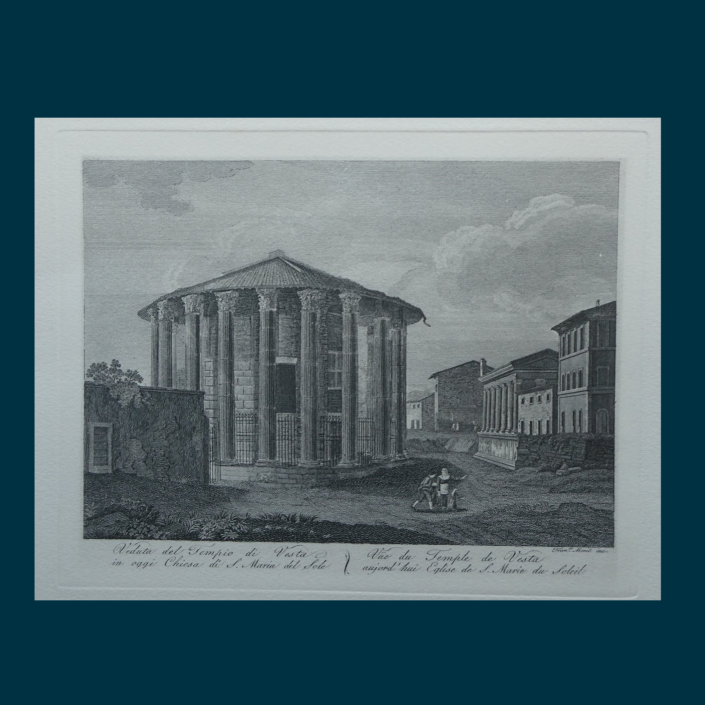 The engraving was made for the tourist market on the Grand Tour as a memento of sites of great importance. The artwork shows The Temple of Vesta in the Ripa area of Rome. It is from a series of views of Rome that he produced around 1800. This one is in fine condition and with great attention to detail. It has no condition issues and has been recently remounted by our picture framer.