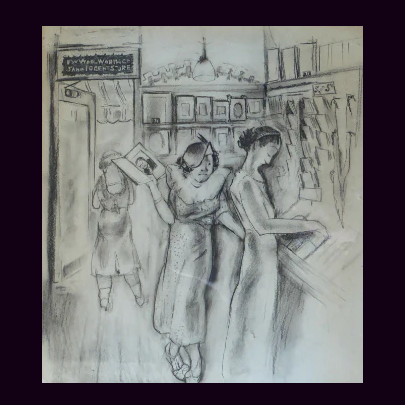 You can see clearly in this fine drawing ladies taking time to look at all the cards and pictures on display. There is a sign above them giving the location as being a Woolworth's store. The drawing must date to the early 1930s - as you can assign from the costumes the ladies are wearing and also from the fact that in the spring of 1932, a 20-cent line of merchandise was added. On November 13, 1935, the company's directors decided to discontinue selling-price limits altogether. So this drawing must date to before this date.