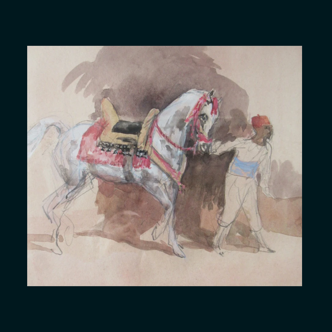 This drawing shows an Oriental Horseman leading a fine Arab Horse. The stallion has a fine saddle and headdress. Although this is a more contemporary work - the execution of it reminds me of 19th-century Orientalist works by artists such as Eugene Delacroix and Sie David Wilkie.