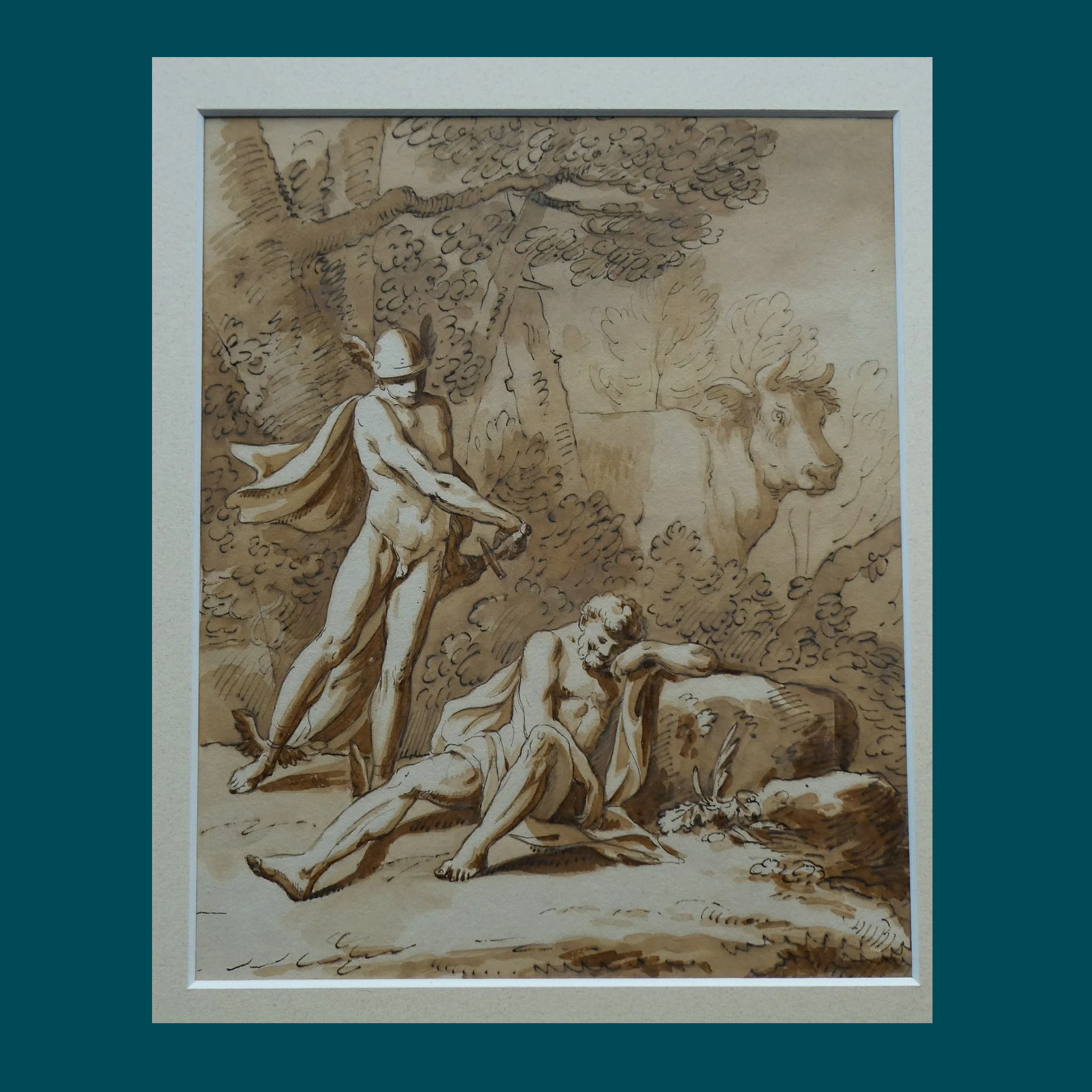 This is a more unusual composition - as the traditional depiction of the scene usually shows Mercury seated playing his pipe and not with the sword unsheathed and raised.