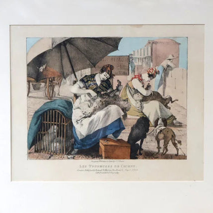 This lithograph is Plate 23 from the series. It shows two women sitting on the Seine Embankment near the Pont Neuf (which appears to be the traditional location for these grooming activities over many years). The Pont Neuf was the first open bridge in Paris, allowing unimpeded crossing of the river. It attracted all manner of traders to the area - and included not only these dog groomers, but also performers, refreshments vendors, street sellers and peddlars.