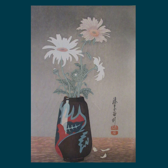 The image shows a little arrangement of three daisy flower heads in an oriental vase - two of the flowers are ice white in shade - the third uppermost flower has a subtle pale grey-pink blush to the petals. It has the artist's Japanese seal to the right of the vase in the image.