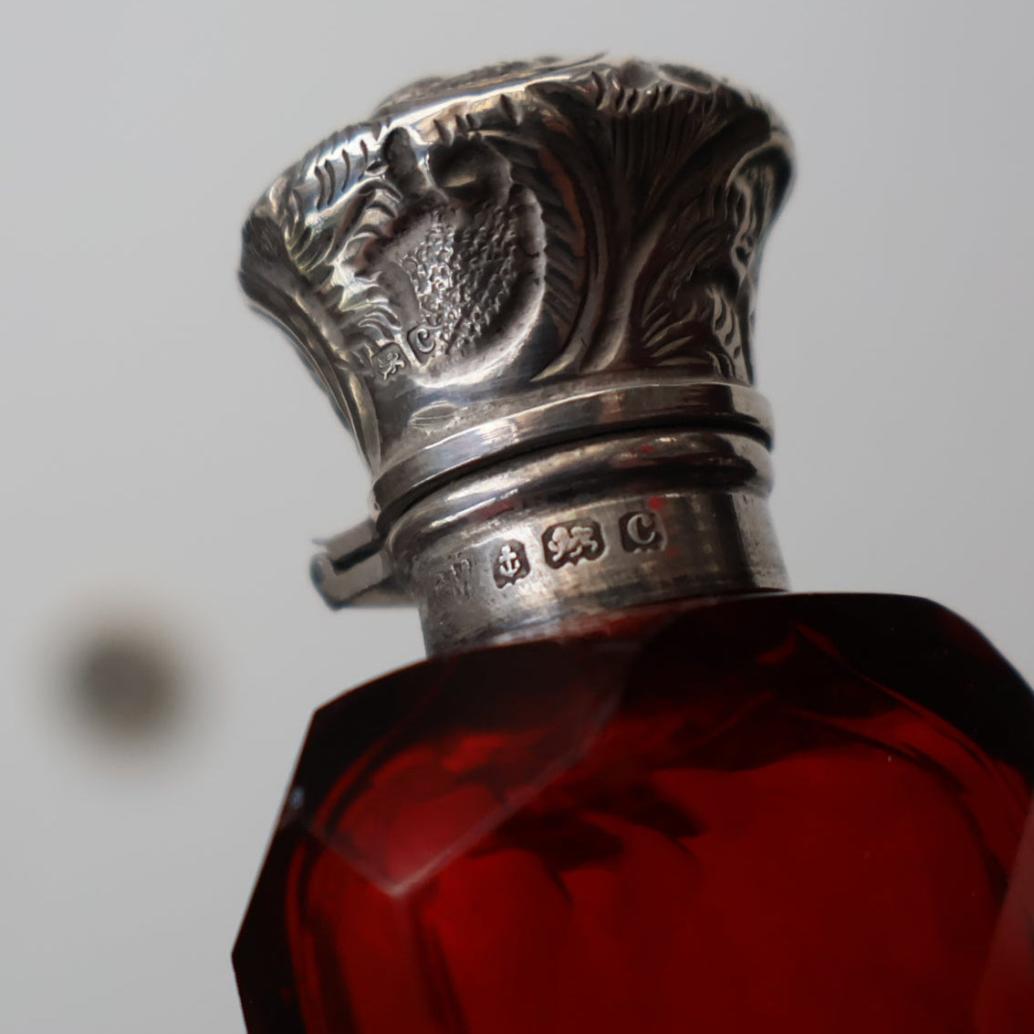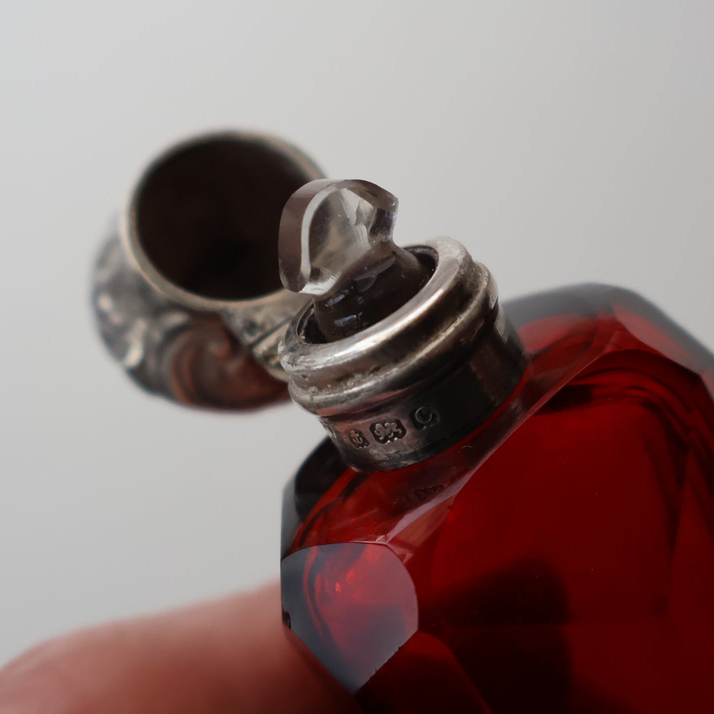 This is a pretty antique perfume bottle. It is very early Edwardian in date - and it is made of ruby glass of an oblong shape - which has been cut into angle facets all around. The interior is nice and clean with no staining from residue perfumes or contents. It also still has its teeny weeny original clear glass stopper inside - these are often lost over the distance of time.