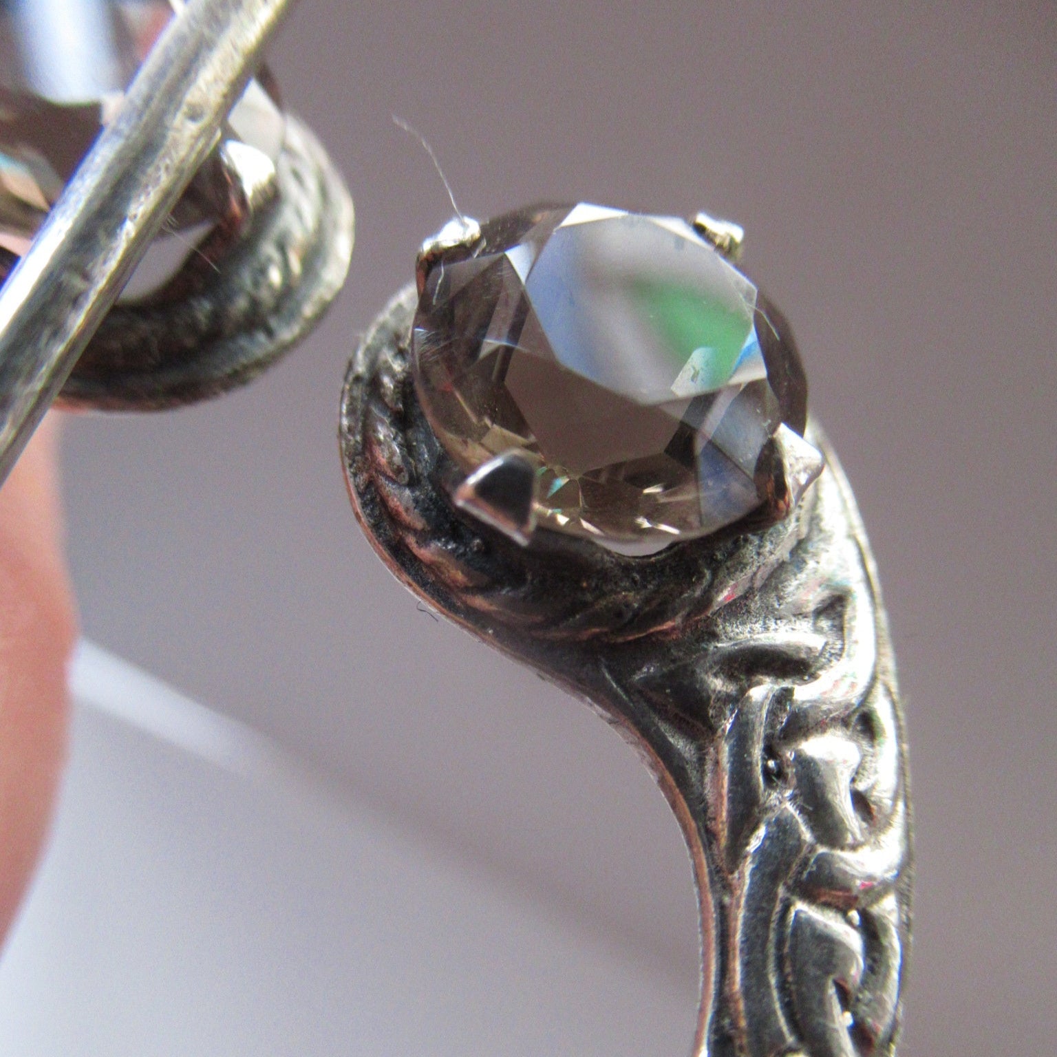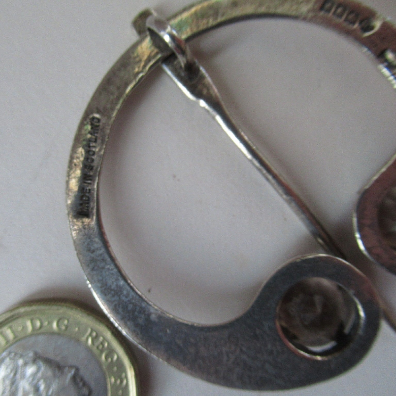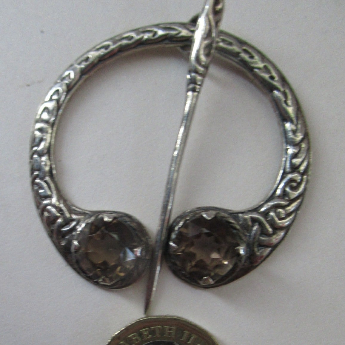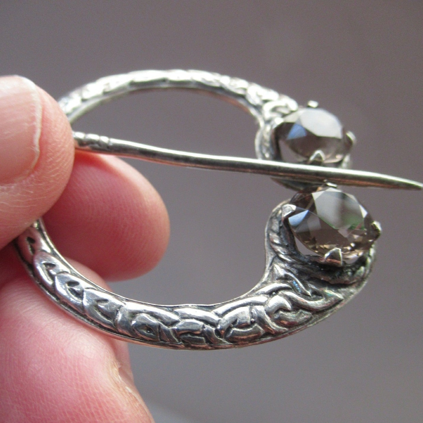 The brooch is decorated with a fine knotwork pattern and is inset with two faceted pale coloured citrines.