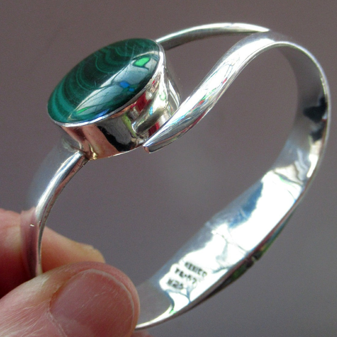 It is 925 Sterling Silver and has a deep-set round polish Malachie stone as a decorative embellishment.