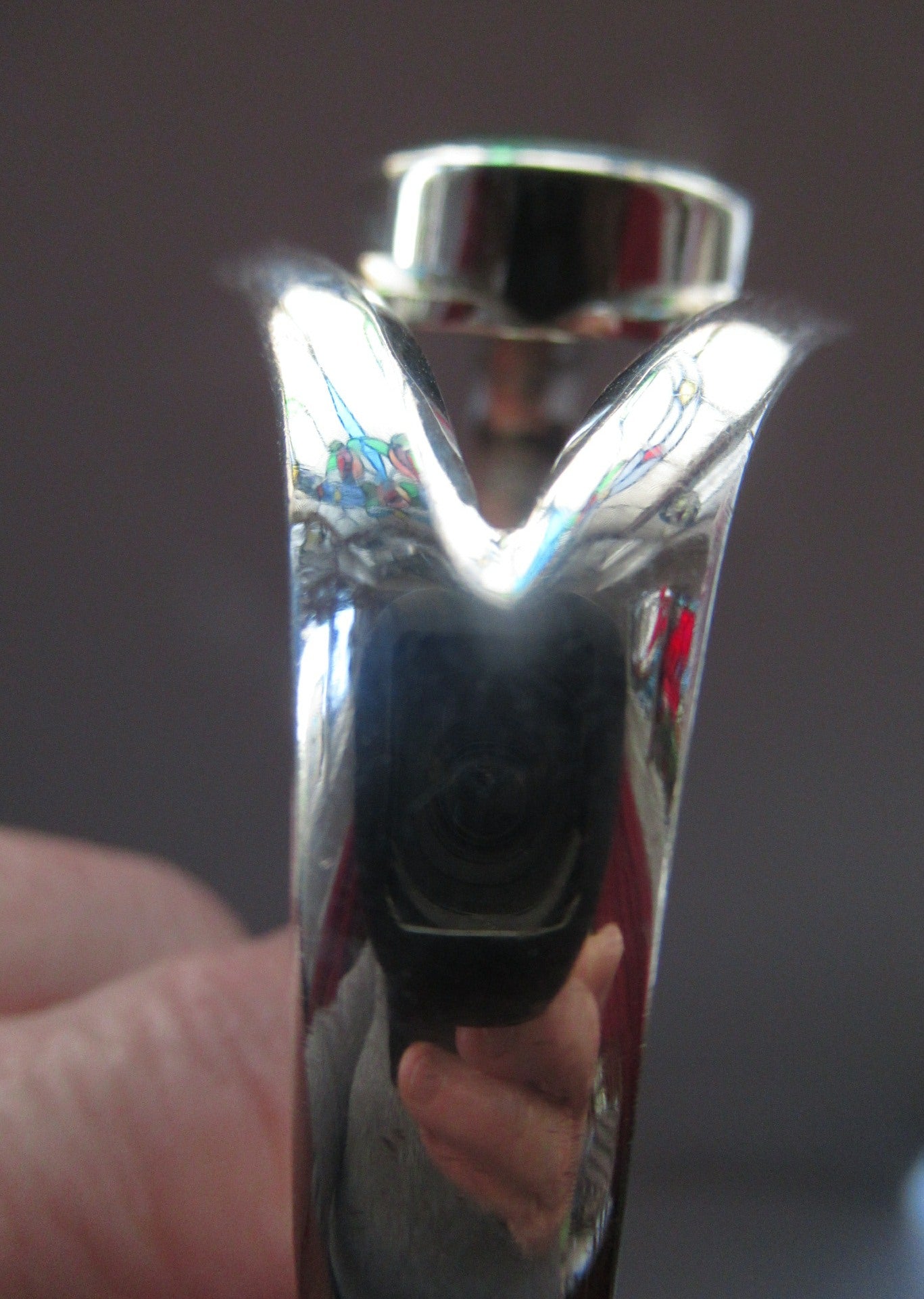 The two ends meet up on the top of your wrist when you are wearing it. One end has the large round lozenge of polished malachite. The other end meets up - and has a wide prong with two tongue sections that hug onto the sides of the round setting part.