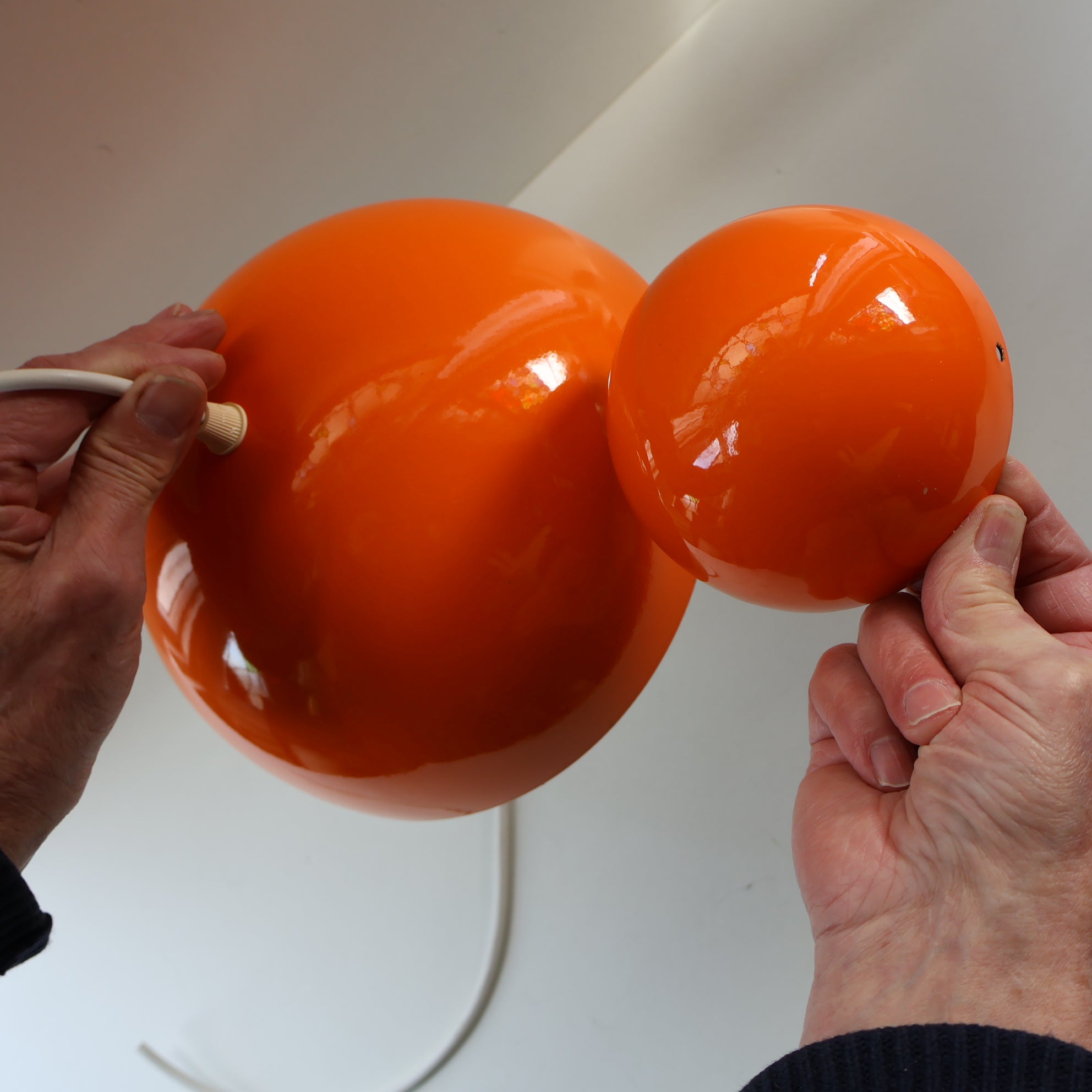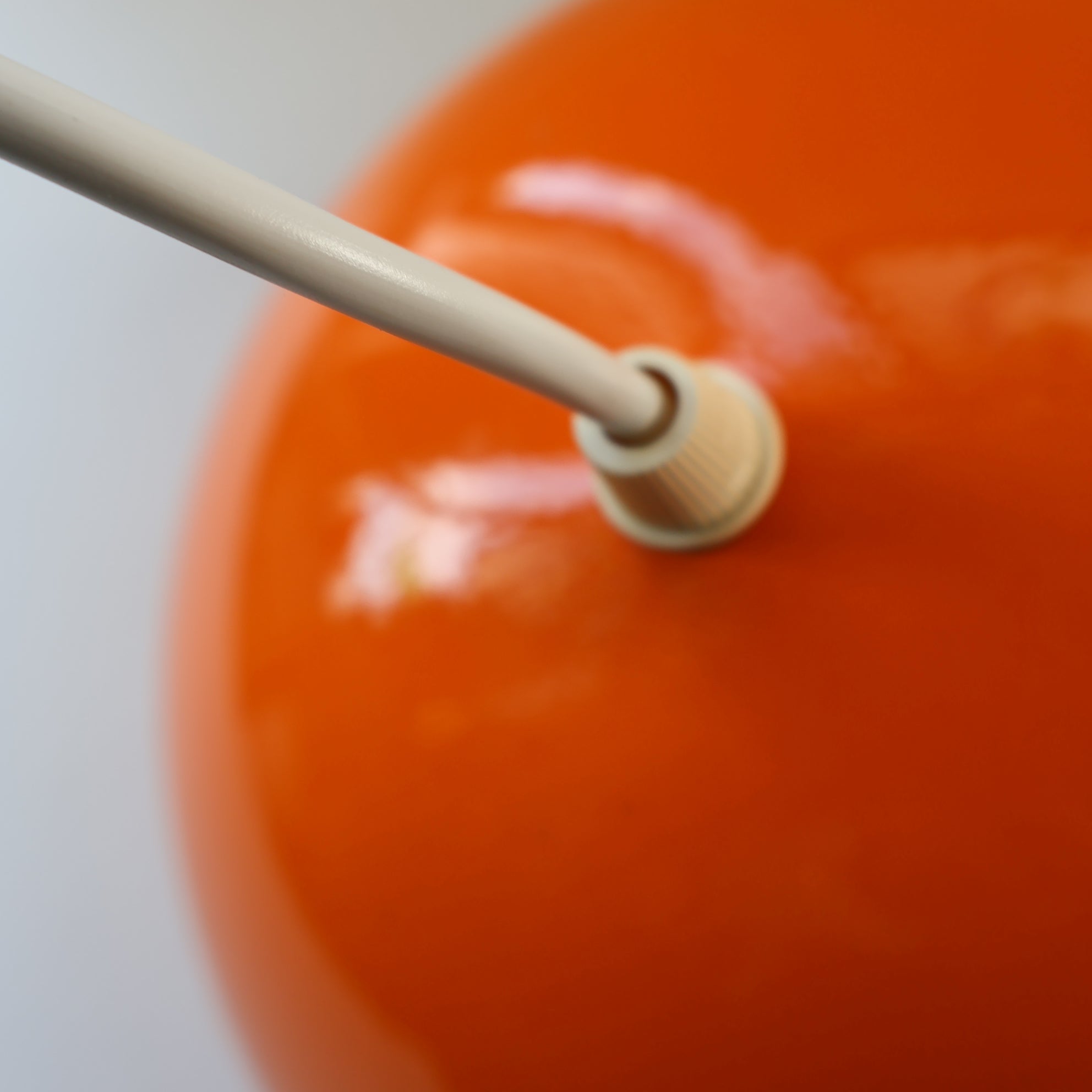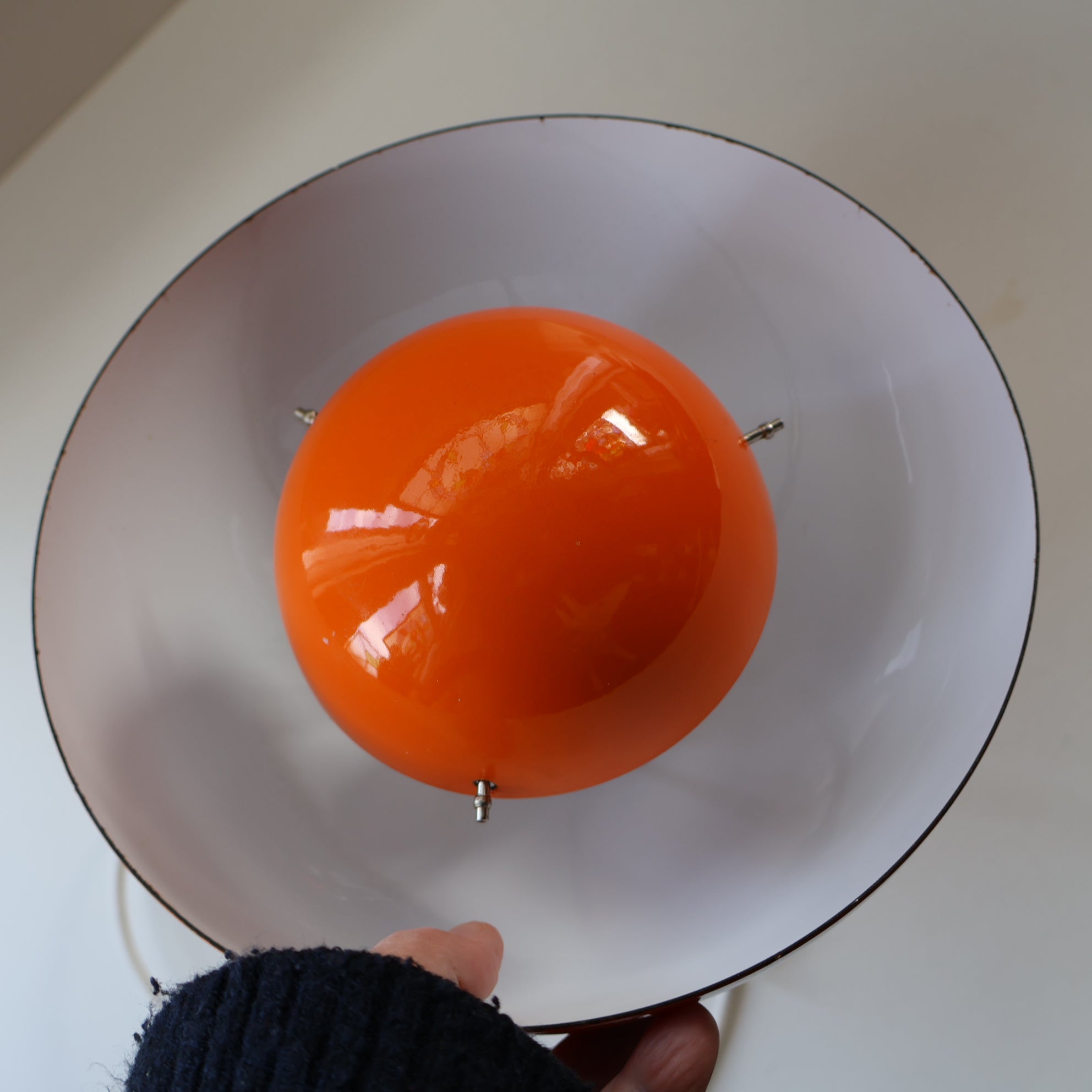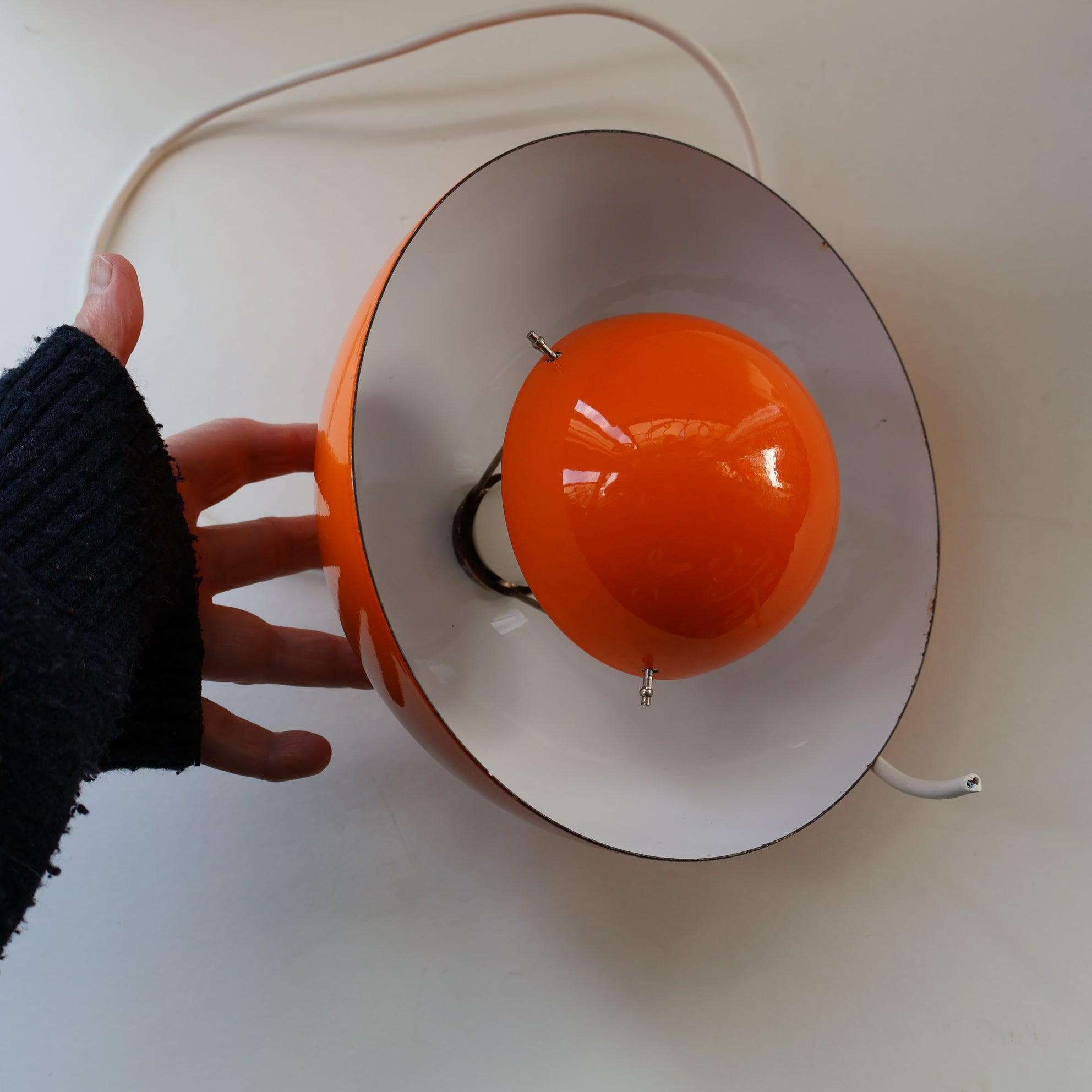 This one is a genuine vintage shade and it dates to the 1960s. The shade is made of lacquered steel with a vibrant tangerine orange enamel finish. It has an upper hemispherical dome and below is another smaller hemispherical dome facing in the other direction which shades the light bulb with it is lit and gives more of a muted accent light. This lamp would be great for an alcove with items on display or hanging over a dining table for more ambient lighting.