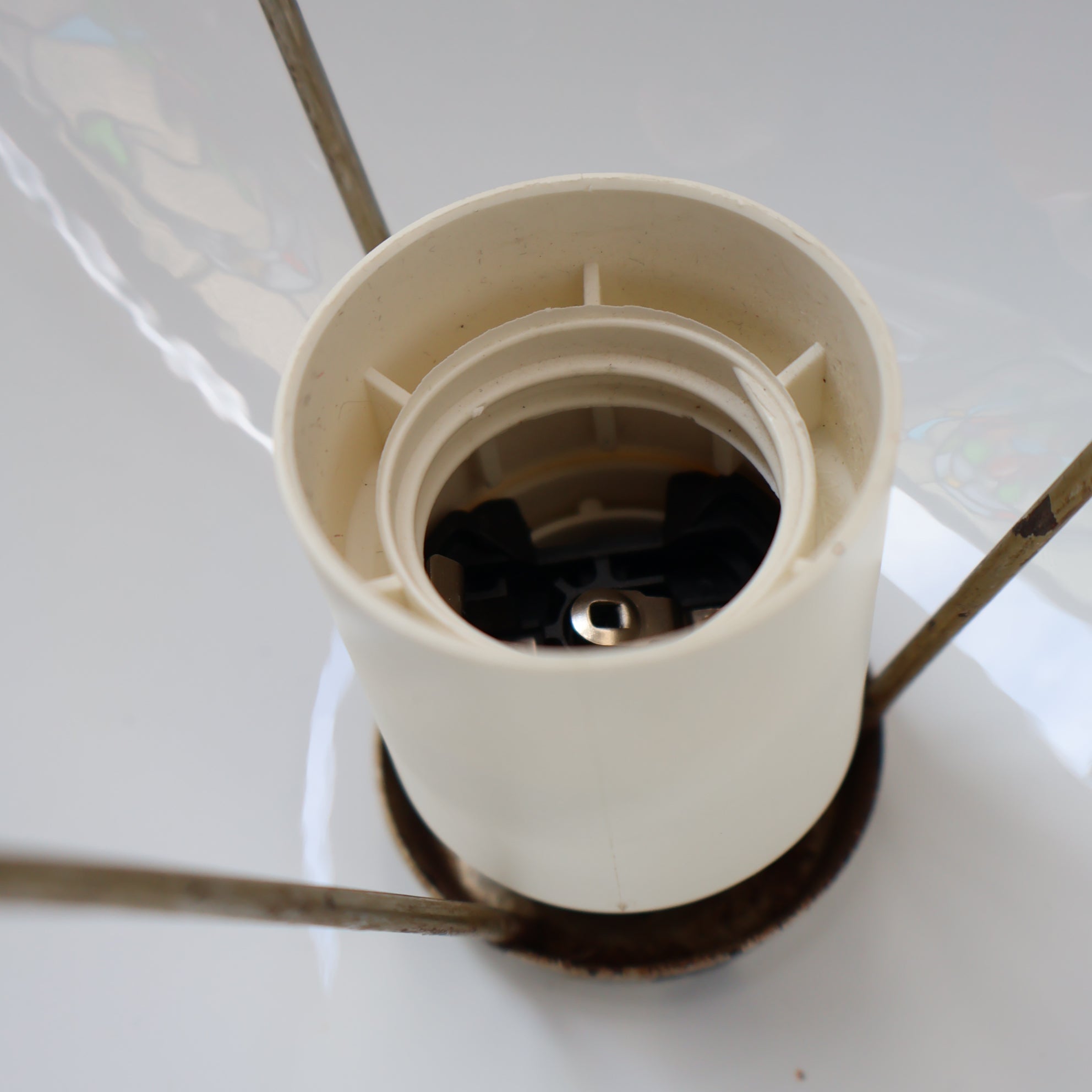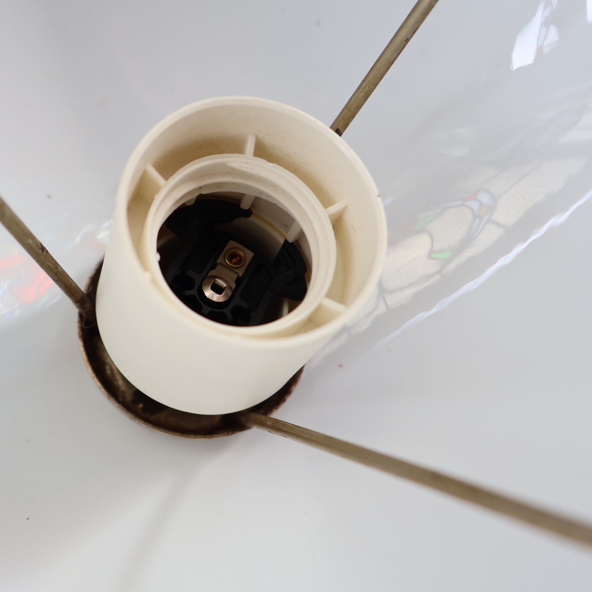 The lamp is in good condition with bright colouring and no nasty chips or scratches. It has been re-wired for your safety.  There are the most minute of nibbles to the edge of the top dome - you cant see these but can feel them with your finger tip - look at the images to make sure you are happy with this - it is a vintage piece and this is totally acceptable!