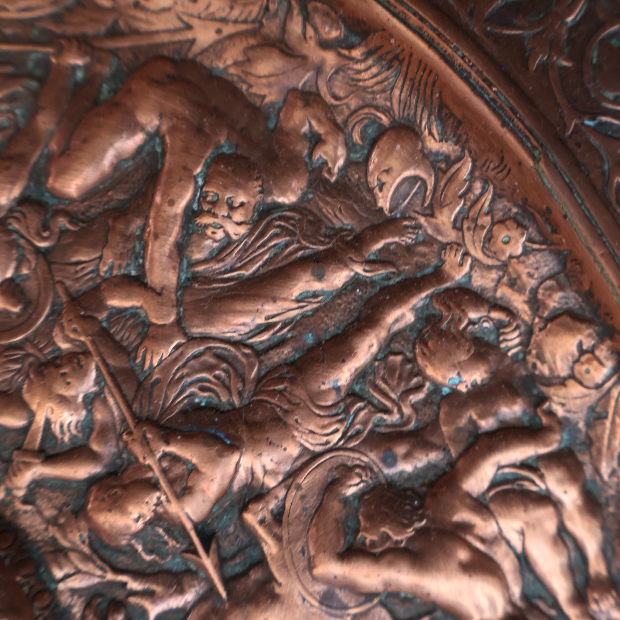 This is a another decorative Victorian cast copper platter dating to the 1850s. It is a reduced antique copy of the original large charger made by Antoine Vechte (1799 - 1868) for Elkington & Co. The busy design covering the whole of plate depicts the Battle of the Amazons.
