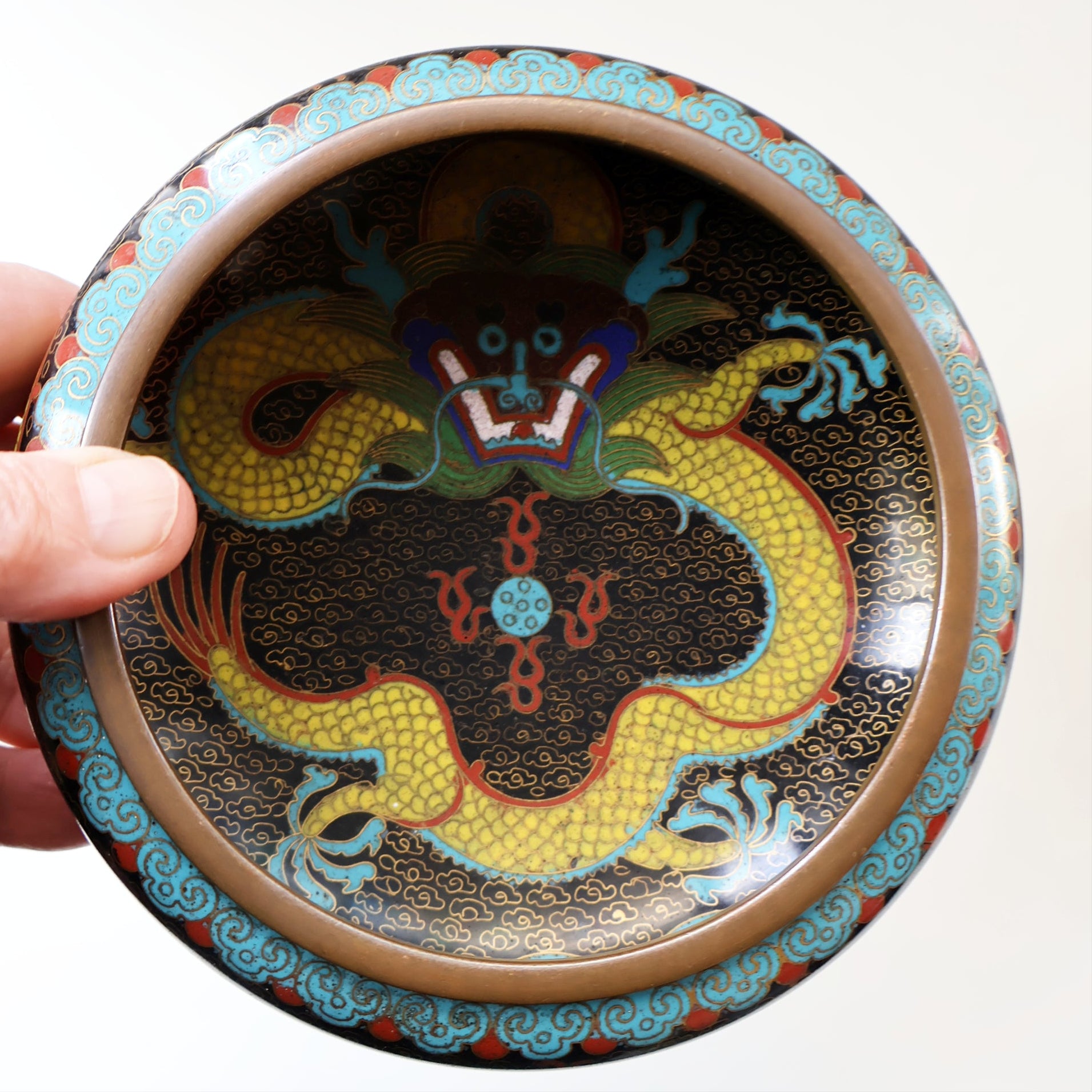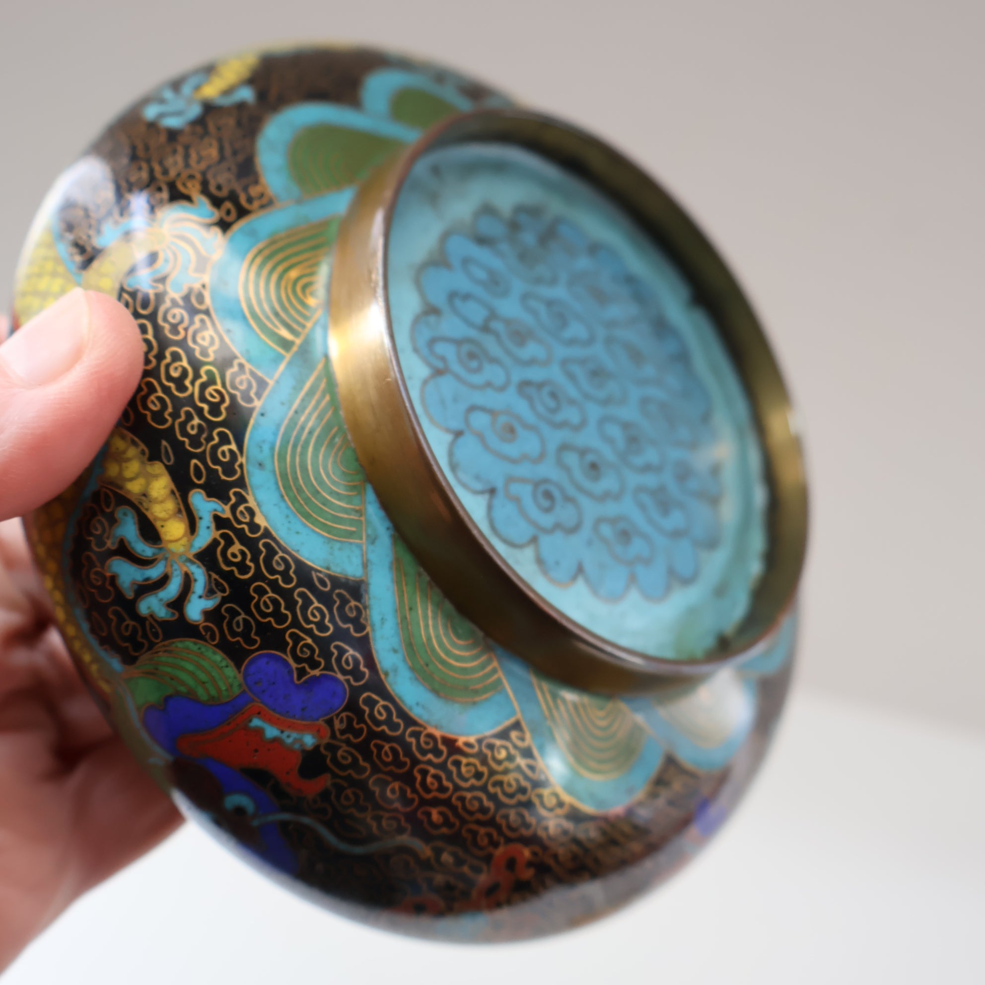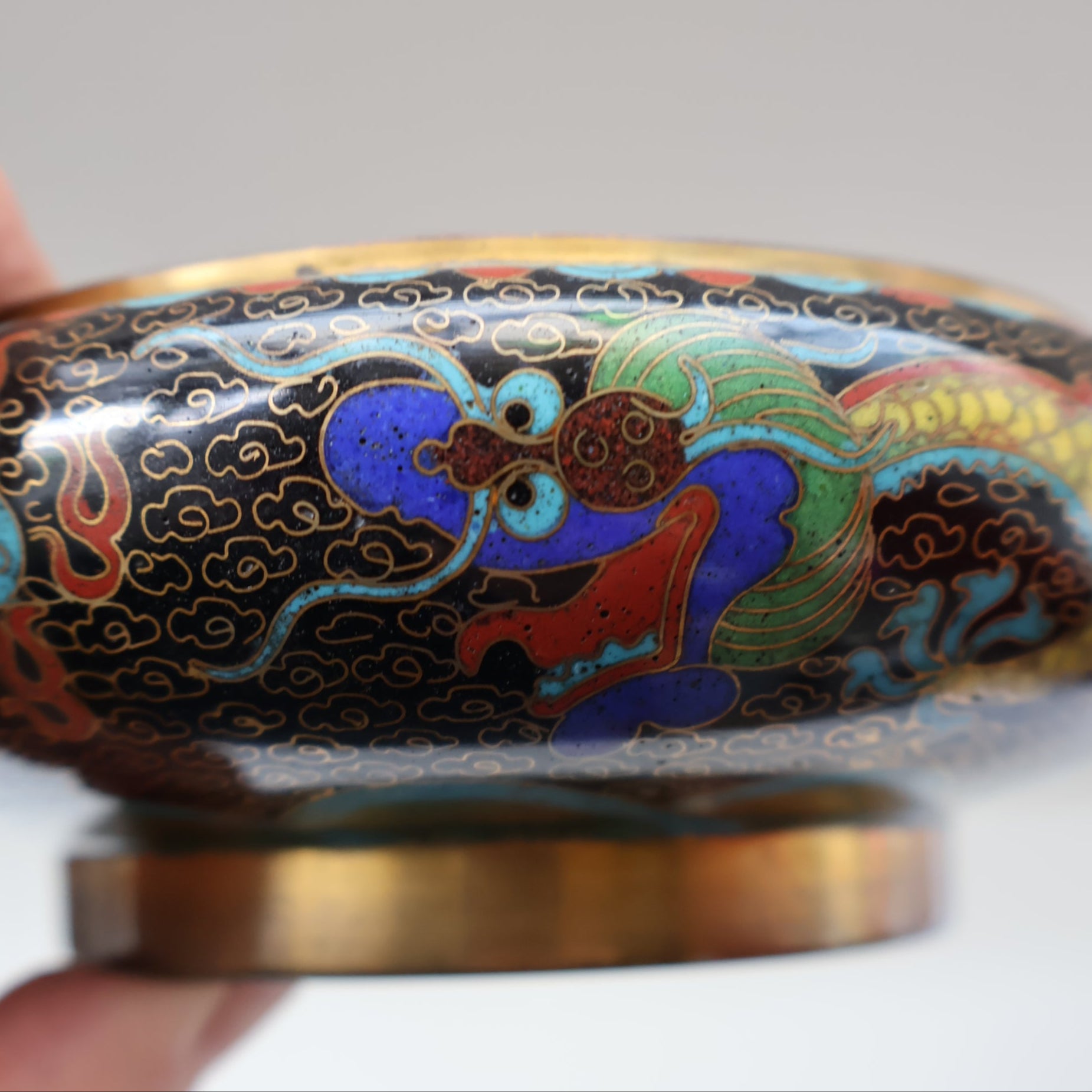 This is a sweet little antique Chinese Cloisonne Bowl it has a black ground covered all over with a cloud pattern. It also has a total of three colourful decorations of dragons.