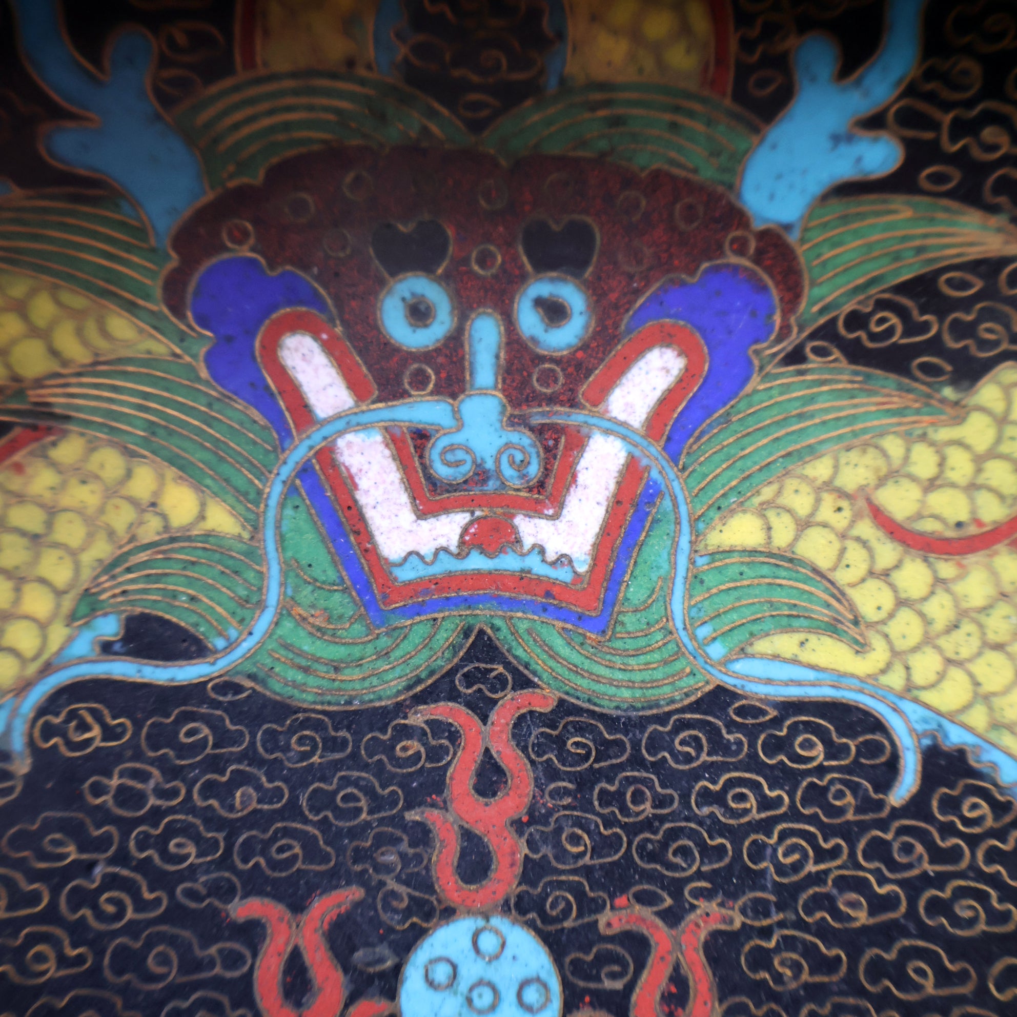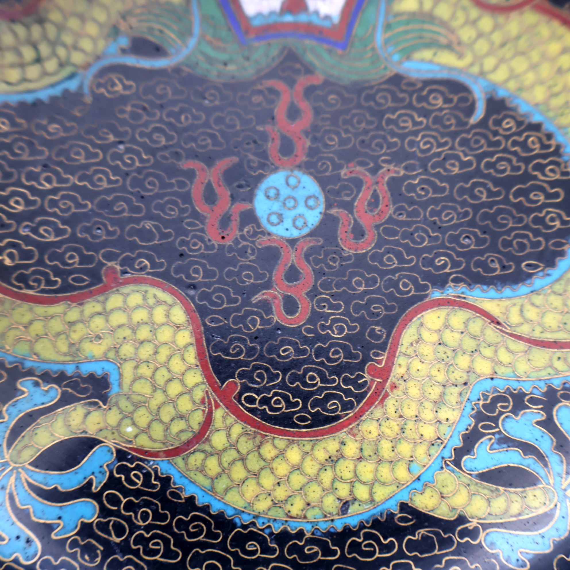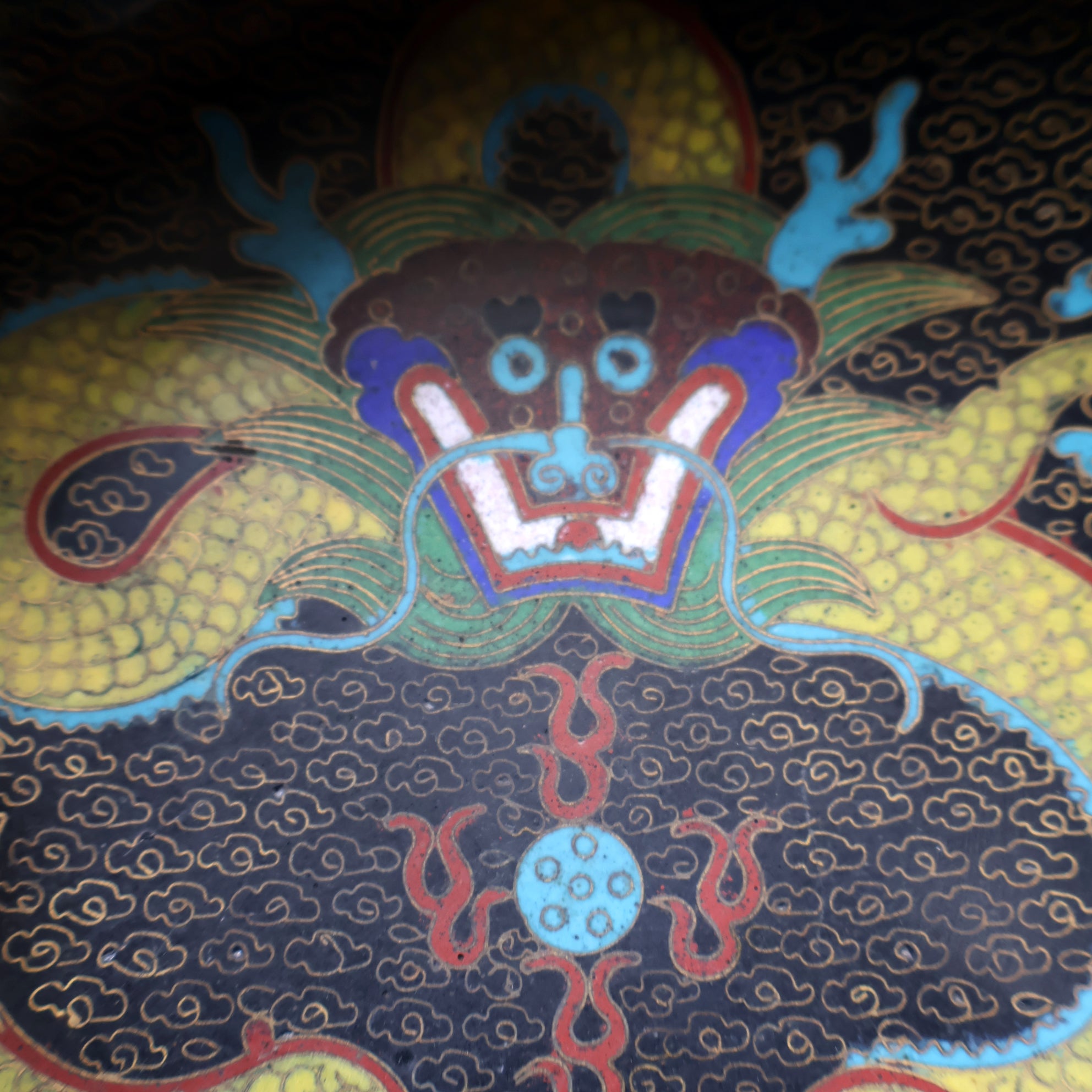 This is a sweet little antique Chinese Cloisonne Bowl it has a black ground covered all over with a cloud pattern. It also has a total of three colourful decorations of dragons.