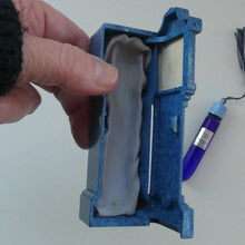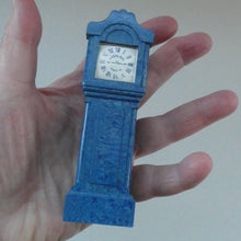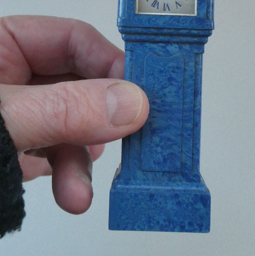 This vintage Bourjois perfume holder in the shape of a Grandfather Clock is made of mottled blue Bakelite. It comes complete with its cobalt blue bottle for Evening in Paris perfume. The perfume bottle is empty. It is such a fine bottle - of long lozenge form and faceted all around is harder to find these bottles with near complete contents. It has a pale blue screw on bakelite cap with a silk white and blue tassel. I love this wee bottle!
