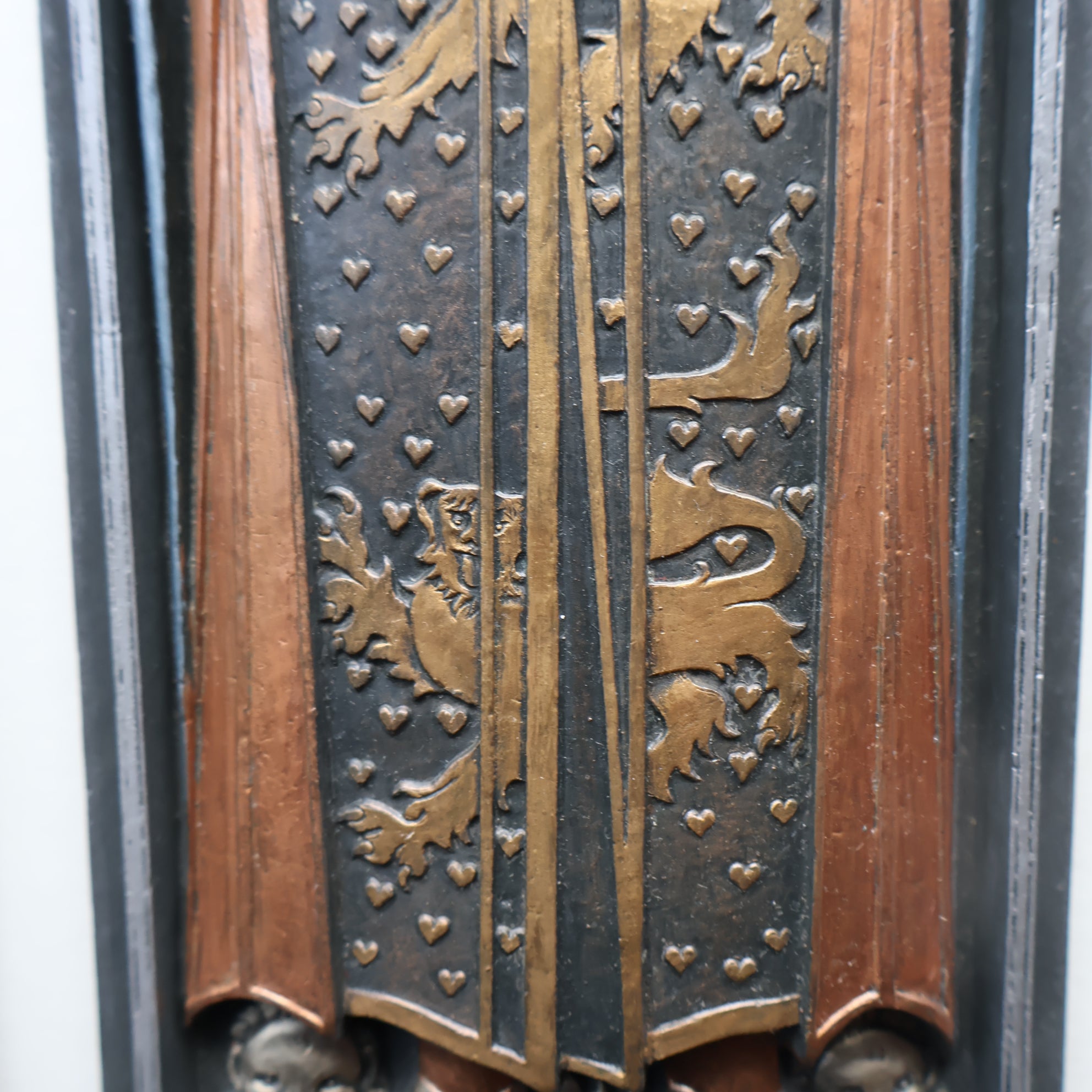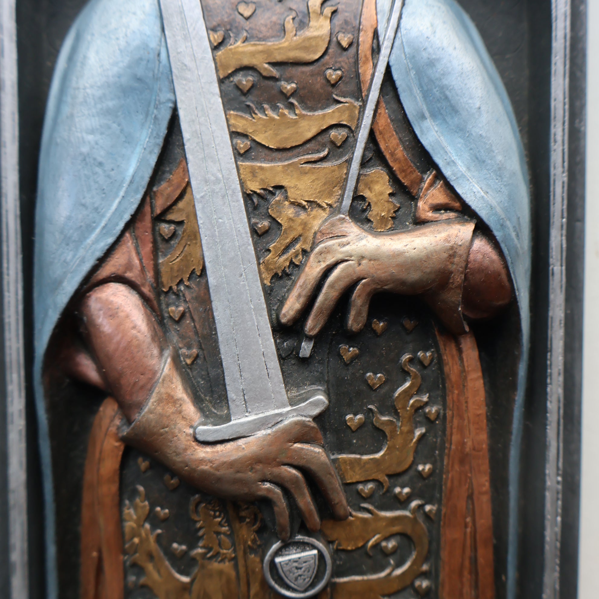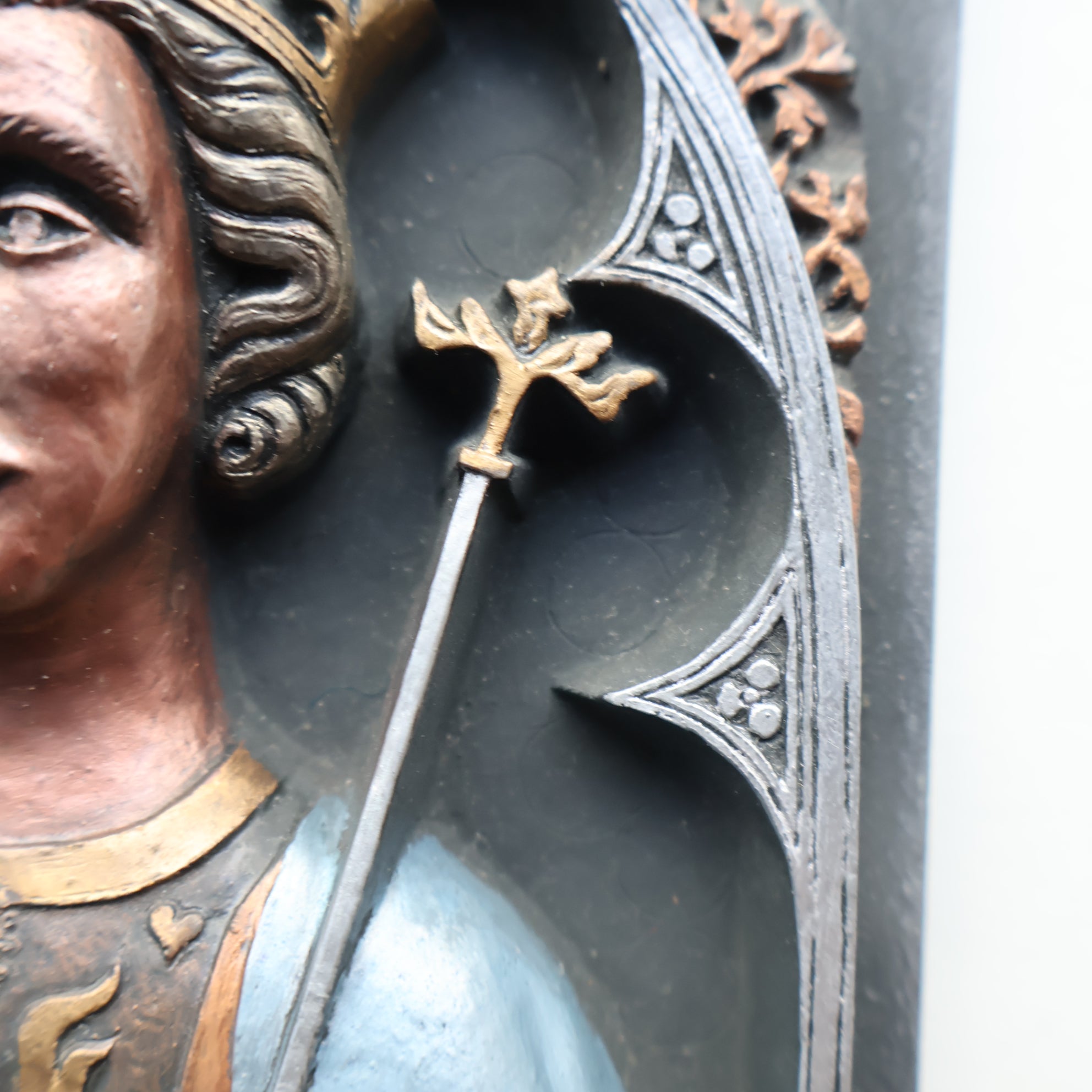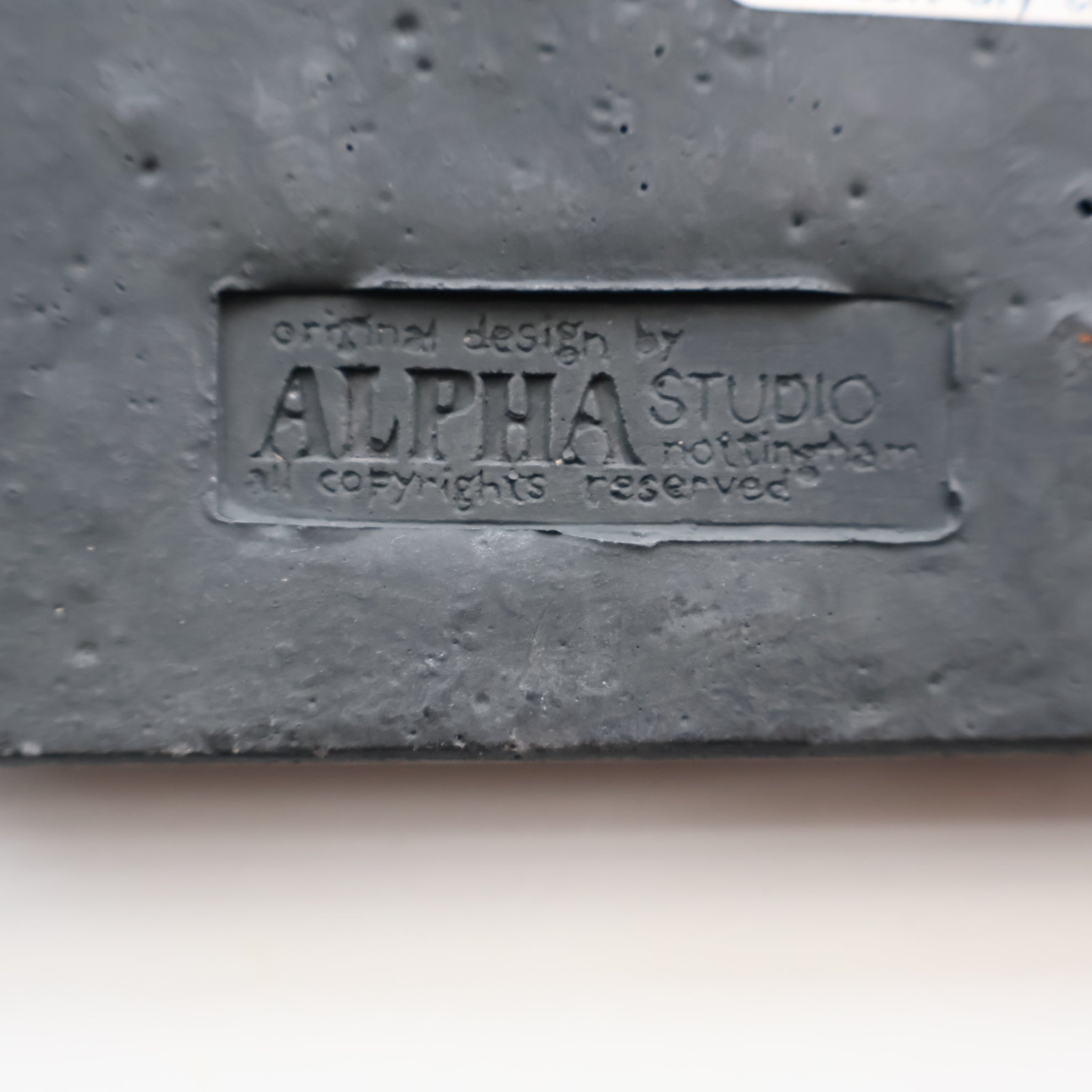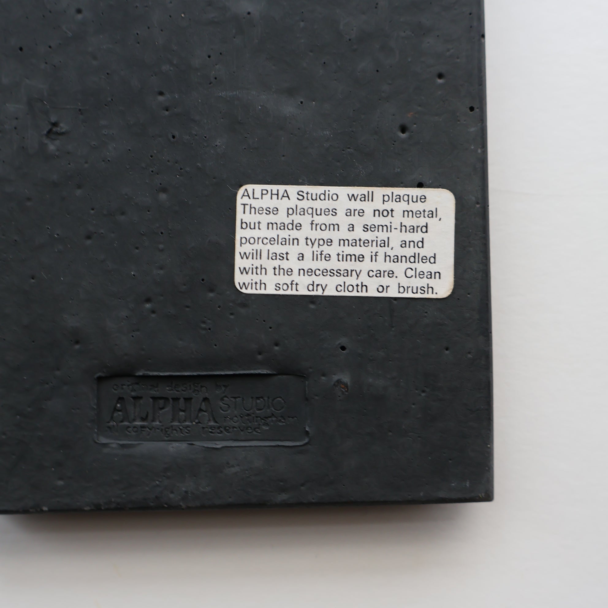 Each plaque is made of a richly painted resin-plaster and probably dates to the 1970s. There is a maker’s mark on the back which reads: “original design by / Alpha Studio / Nottingham / all copyrights reserved”.