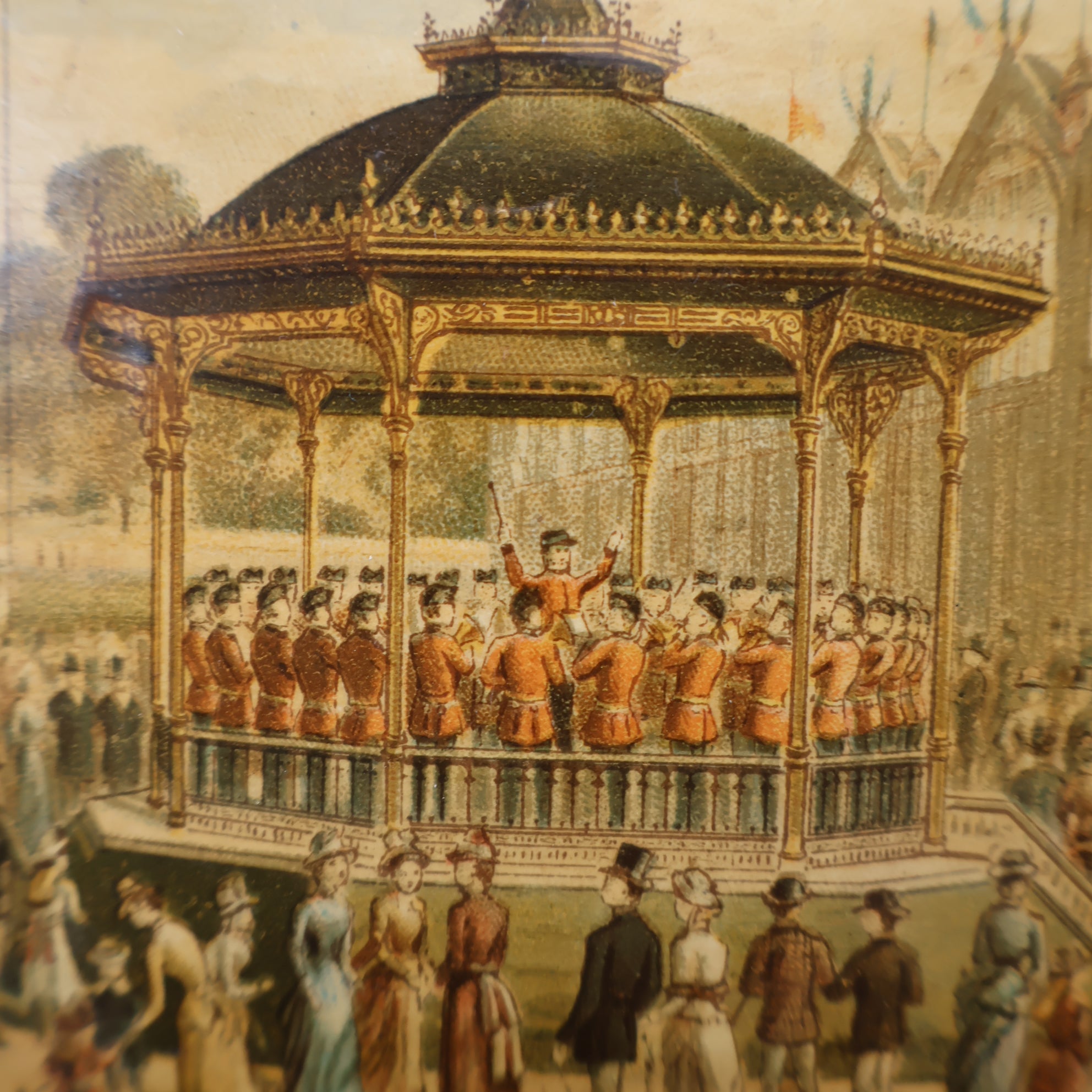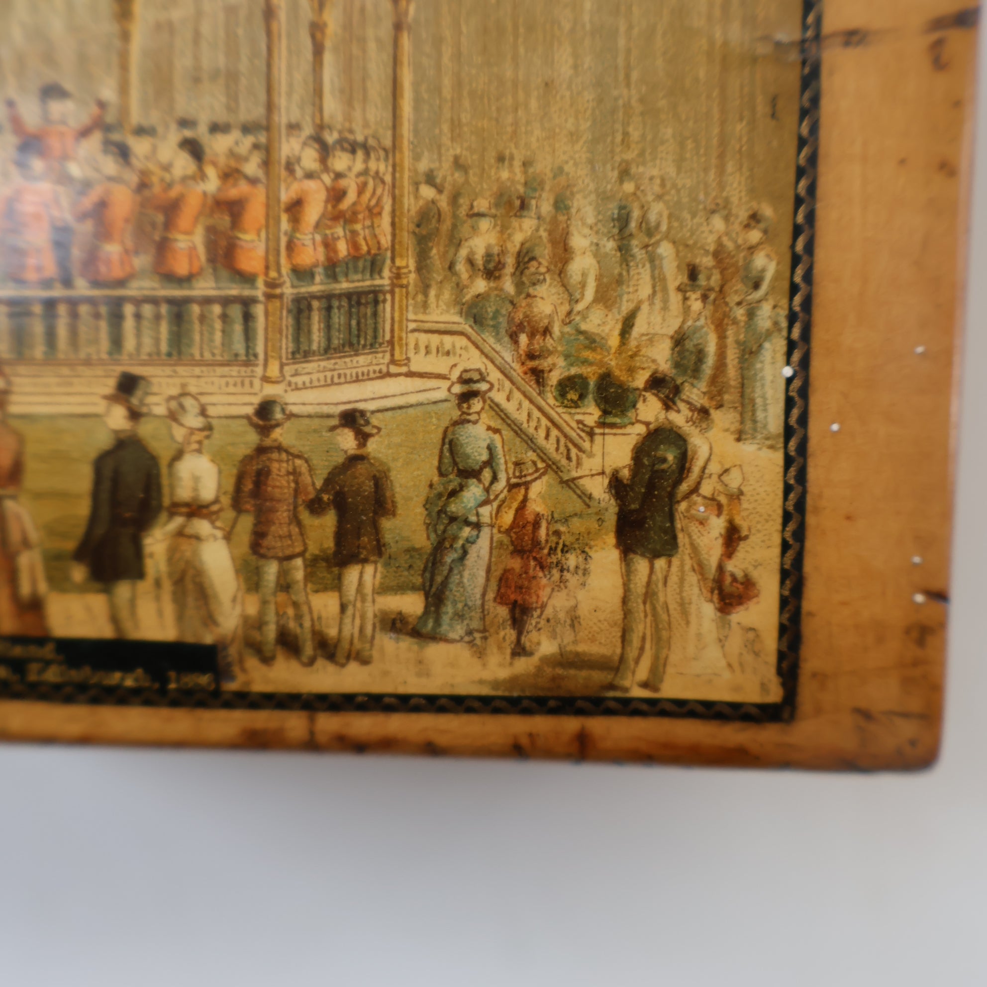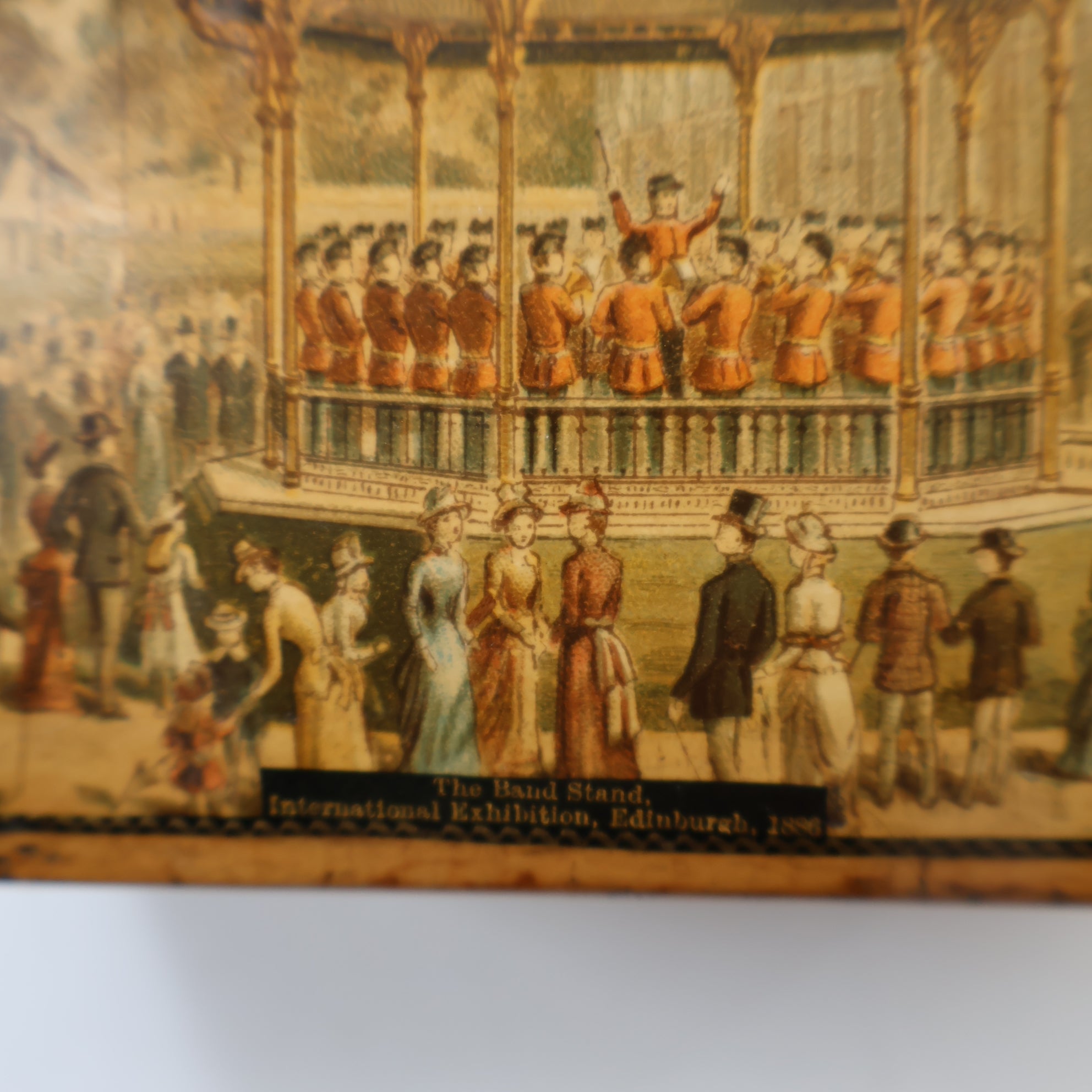 It is very interesting historically. The front of the box has an applied print of the Bandstand at the exhibition. The image was originally published in the Pictorial Souvenir of The International Exhibition and Old Edinburgh (Banks & Co, Edinburgh, 1886). The image on my box was printed especially to be added as decoration to these souvenir boxes.