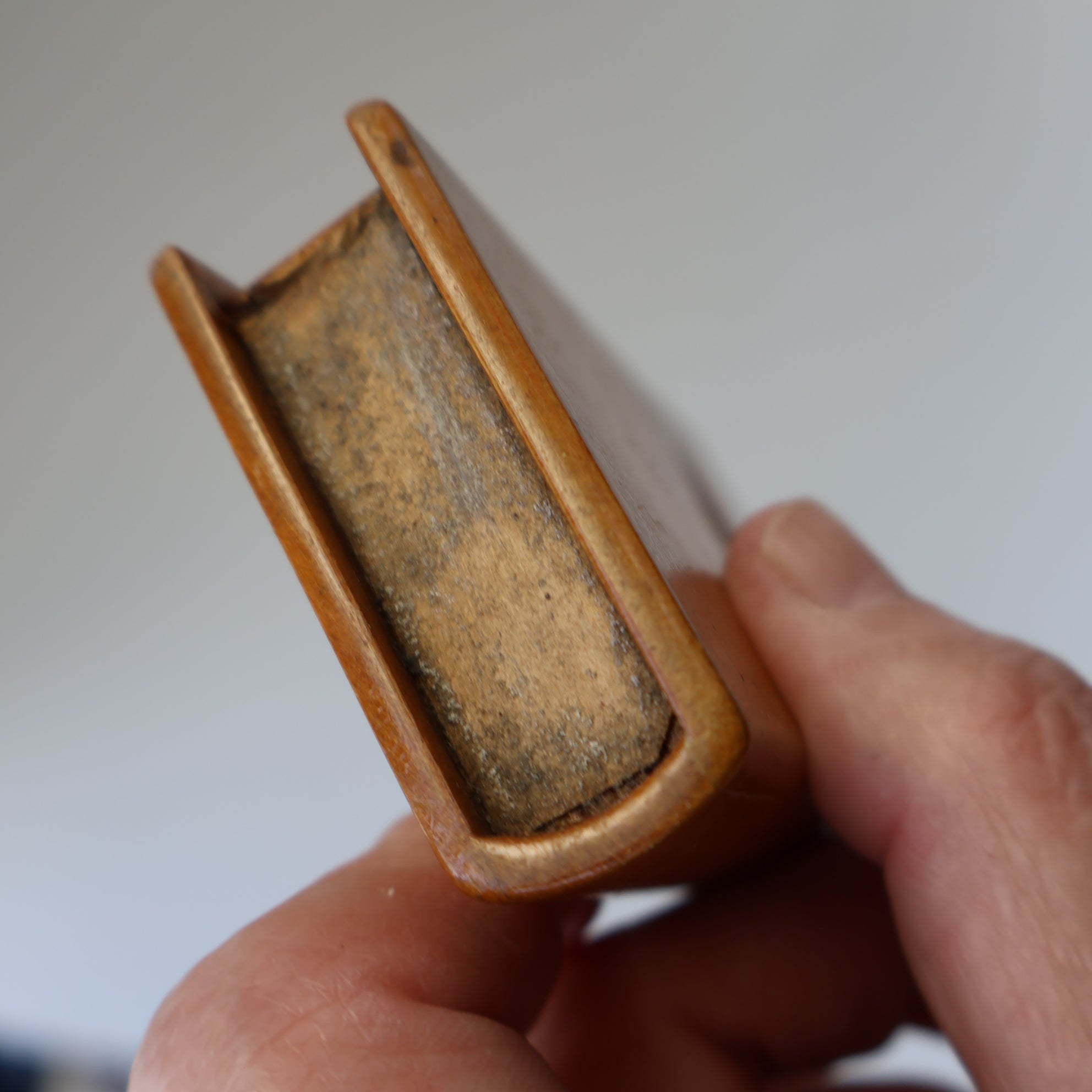 On offer here is a little honey-toned wooden box. It has a lift off lid to allow you to access the contents inside. I think that this was probably designed as a little vesta case - as there are remnants of of old worn down sandpaper on the base. The box takes the form of a little book. It would have been a sweet little Victorian souvenir that you would have purchased on your travels in Scotland.