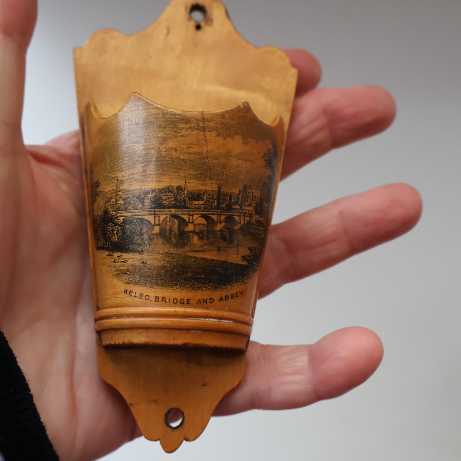 The spill holder features images an image of Kelso Bridge and the Abbey in the distance. I love the shapes used in this wee Scottish Victorian household item.