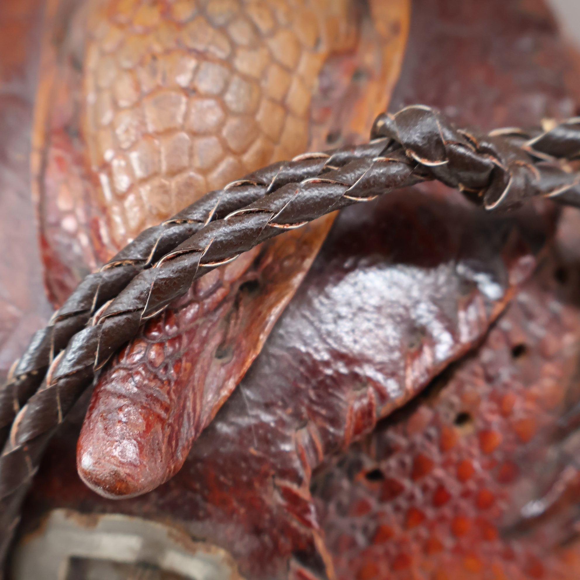 Condition: the lid or flap with the head has in the past been more firmly stitched to the main body of the bag - they have done with with a coloured wool. I am sure that this could be stitched over with a dark brown wool so it was not so obvious. The lid is firmly attached to the main body of the bag. There is also a little loose part of the lining - but nothing major or of great worry. I have photographed these areas for your inspection and price the bag to take this into account.