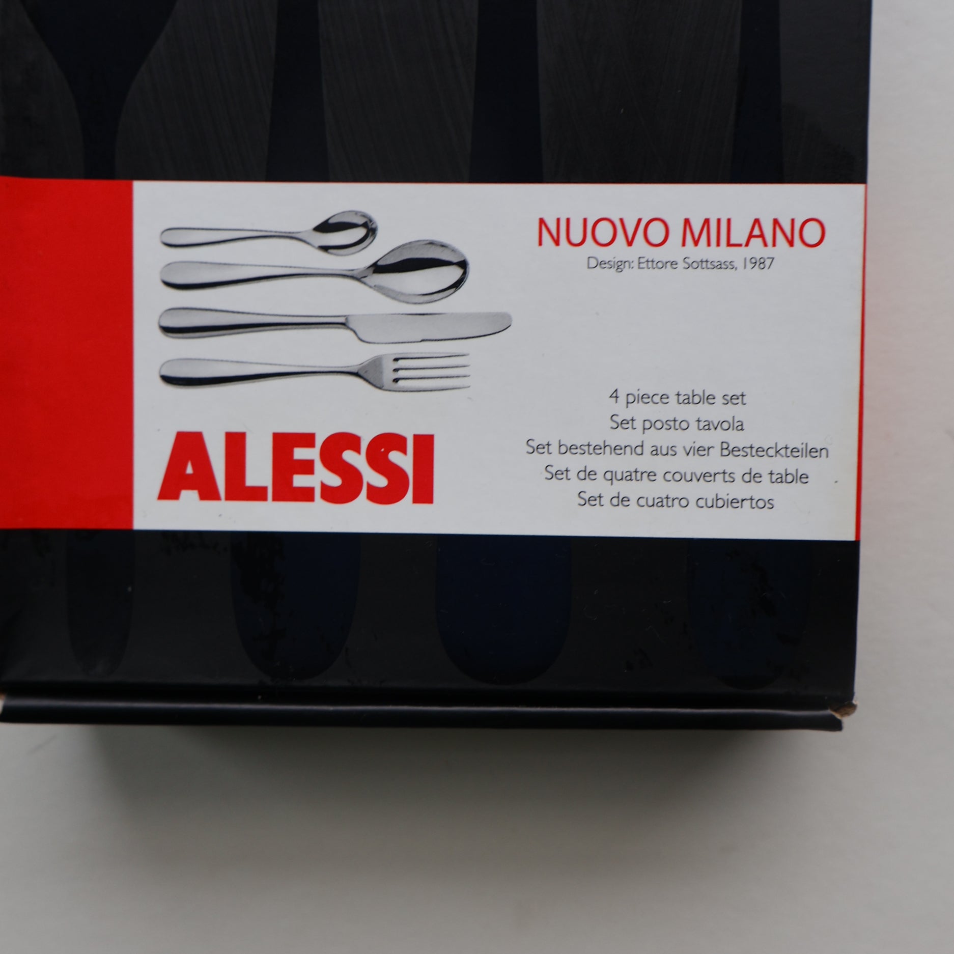 These is a contemporary 4 piece set of fine Alessi cutlery. It is the "Nuovo Milano" range which was designed by Ettore Sottsass. It is a design classic. Sottsass wanted the pieces to be “smooth as an ocean rock”, with a soft and rounded shape. The Design won the XVIth Compasso d'oro award.
