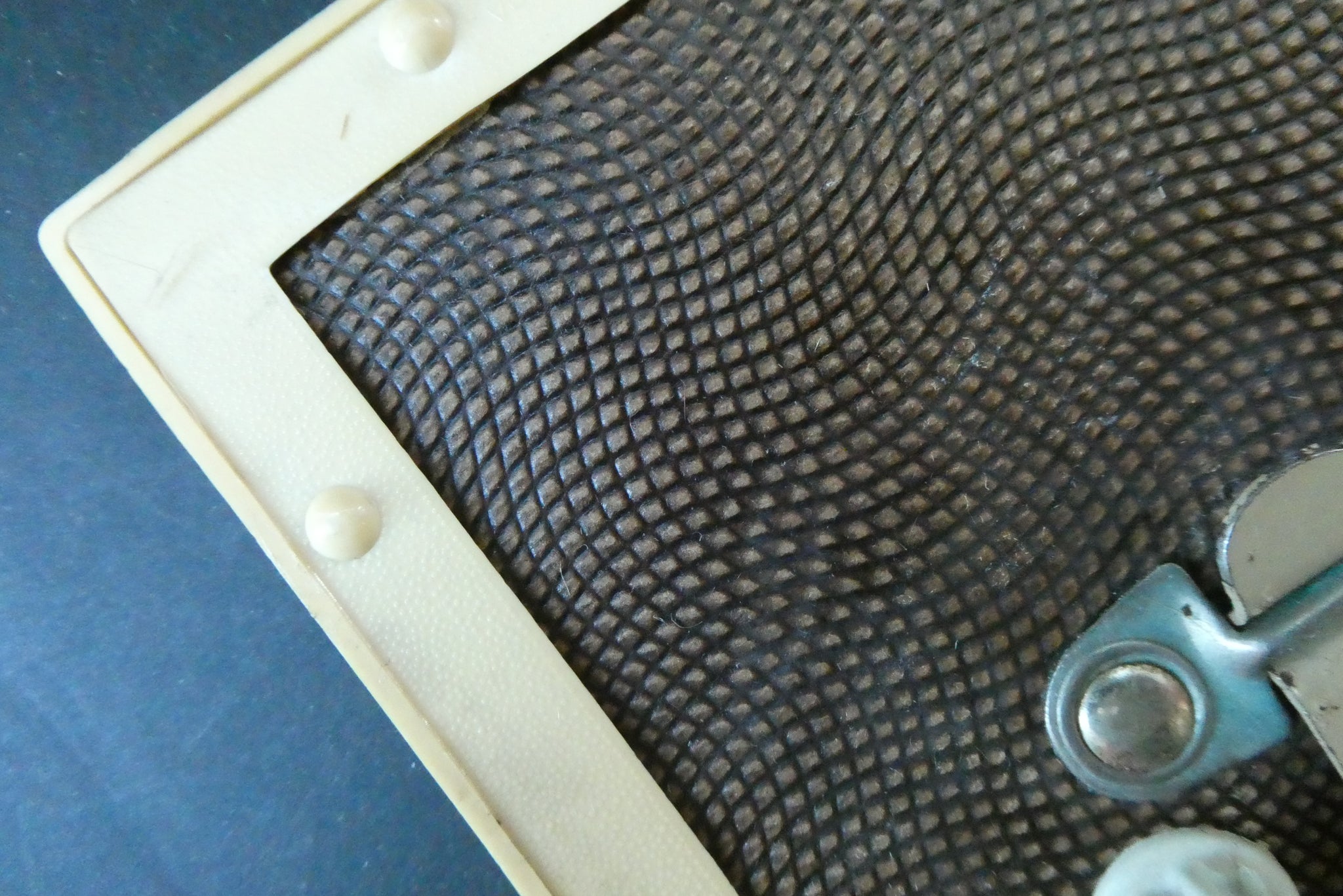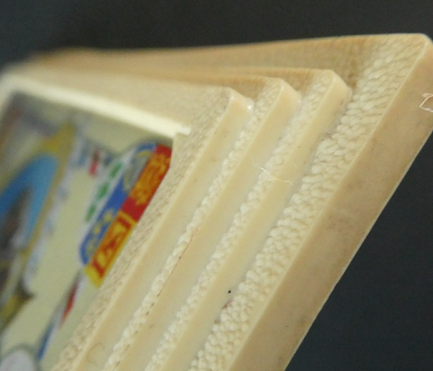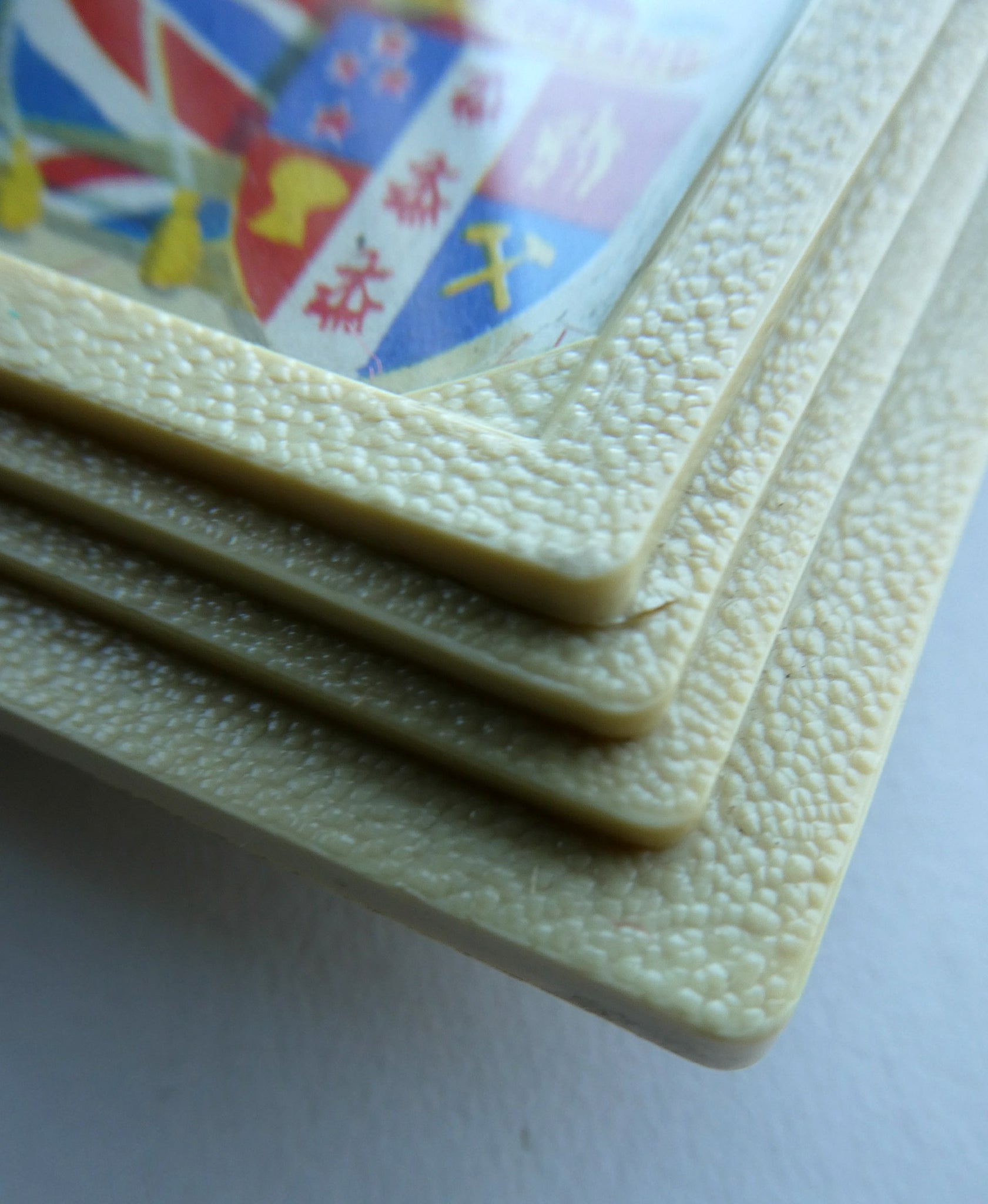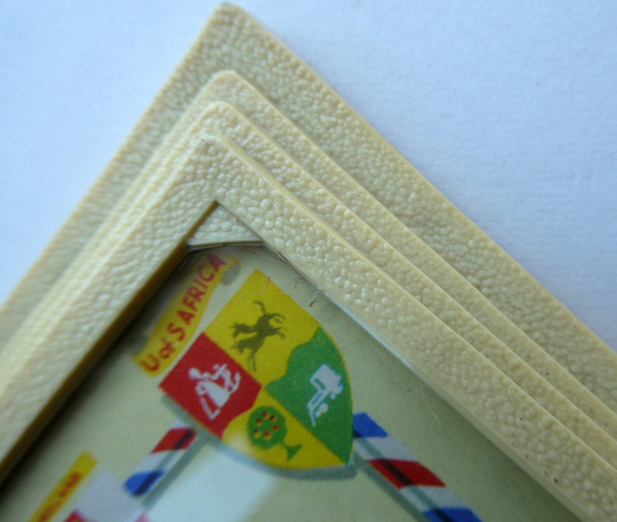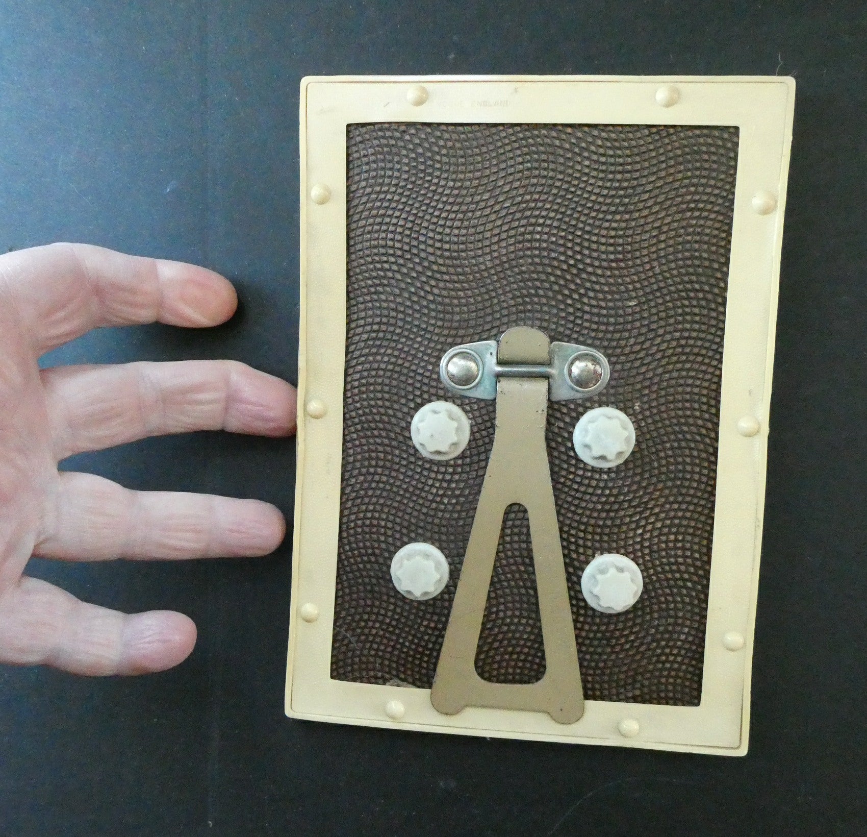 It is just over 6 1/2 inches in height. The calendar is made of cream-coloured textured bakelite-type plastic and the front of it is covered with glass to keep it clean. Any white marks in my photographs - are reflections caused by the glass.