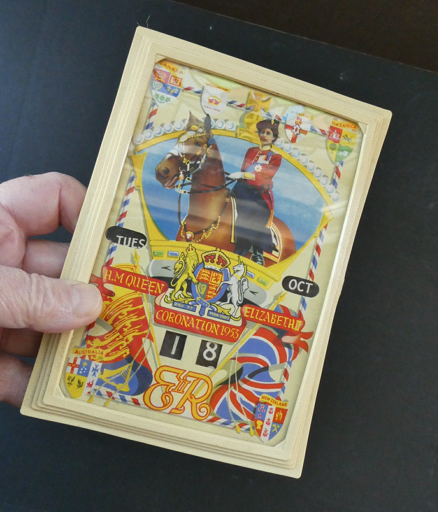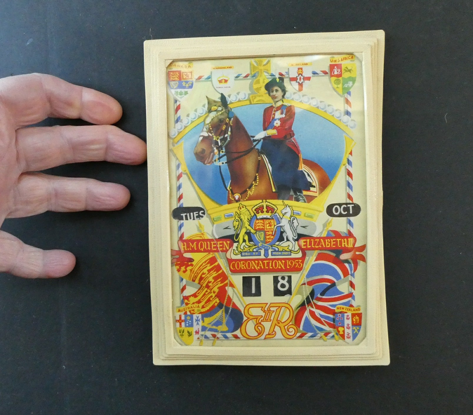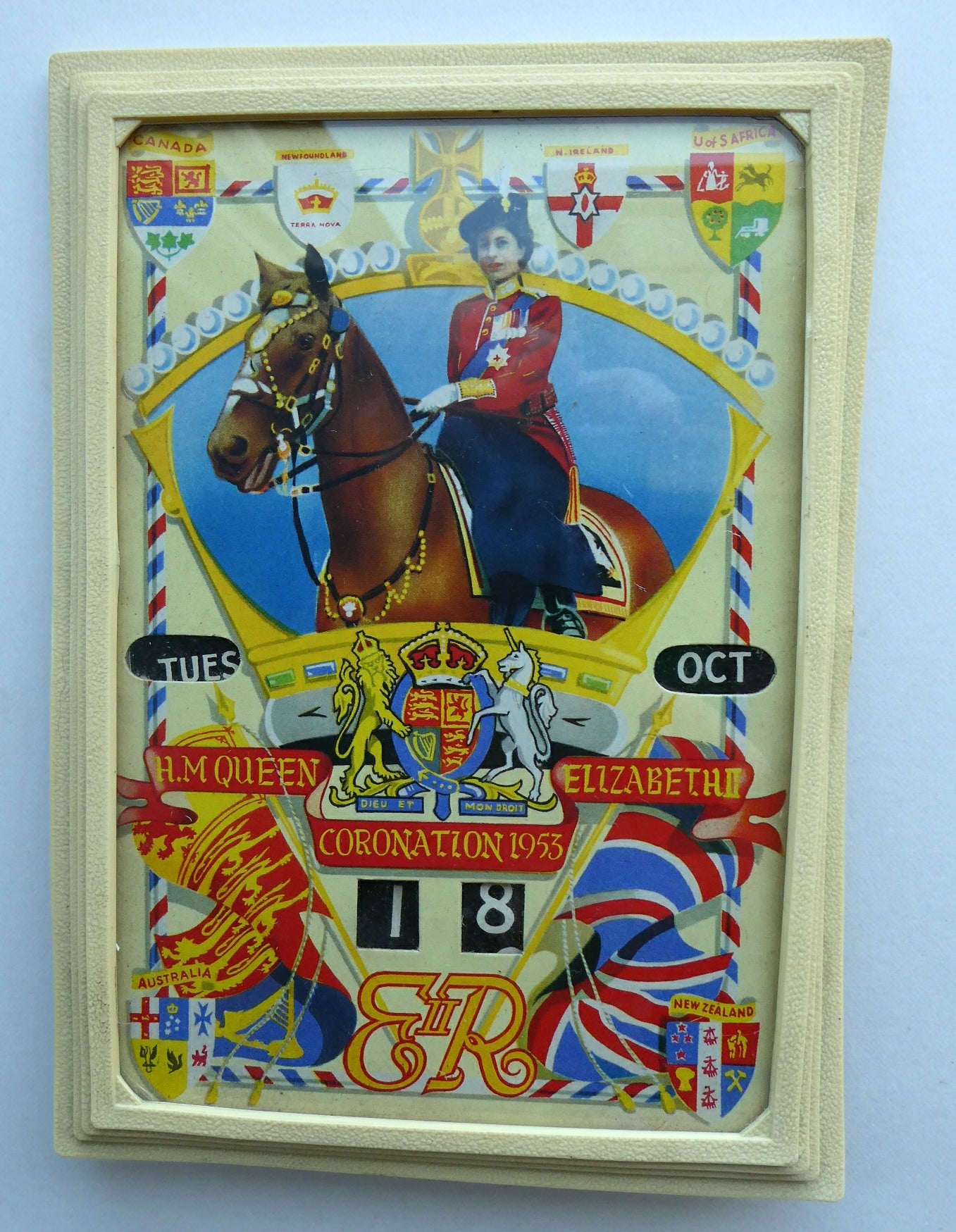 It dates to 1953 and was made to commemorate the Coronation of Queen Elizabeth. The calendar features an image of the Queen on horseback - riding side-saddle. Around her are a selection of flags and patriotic crests and shields.