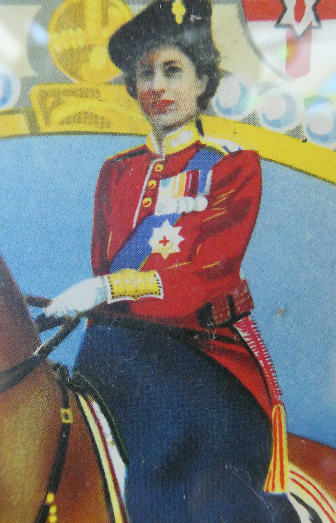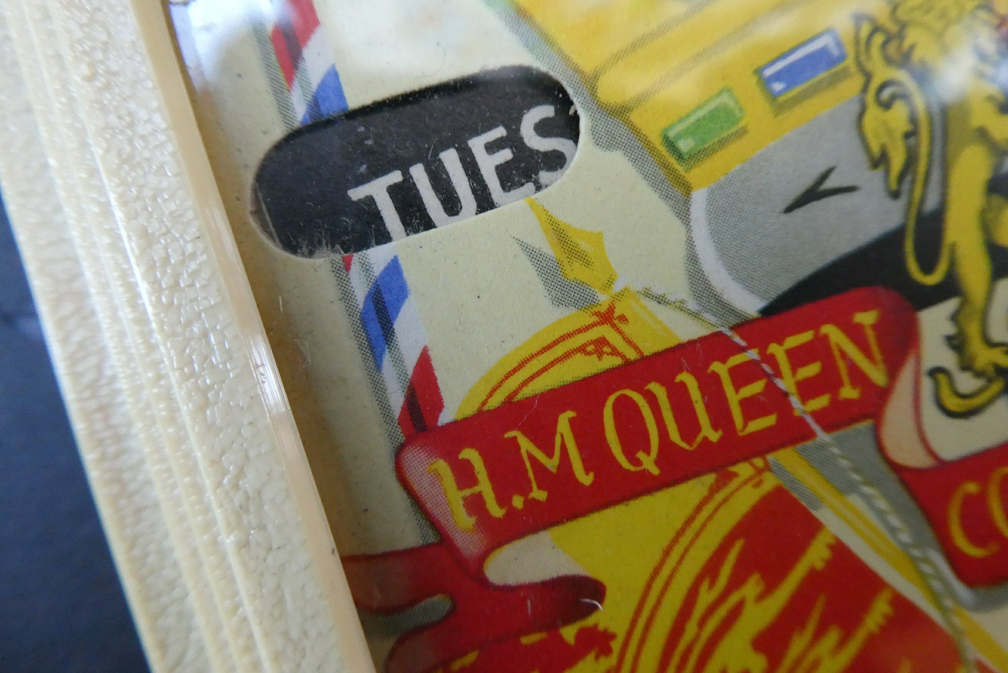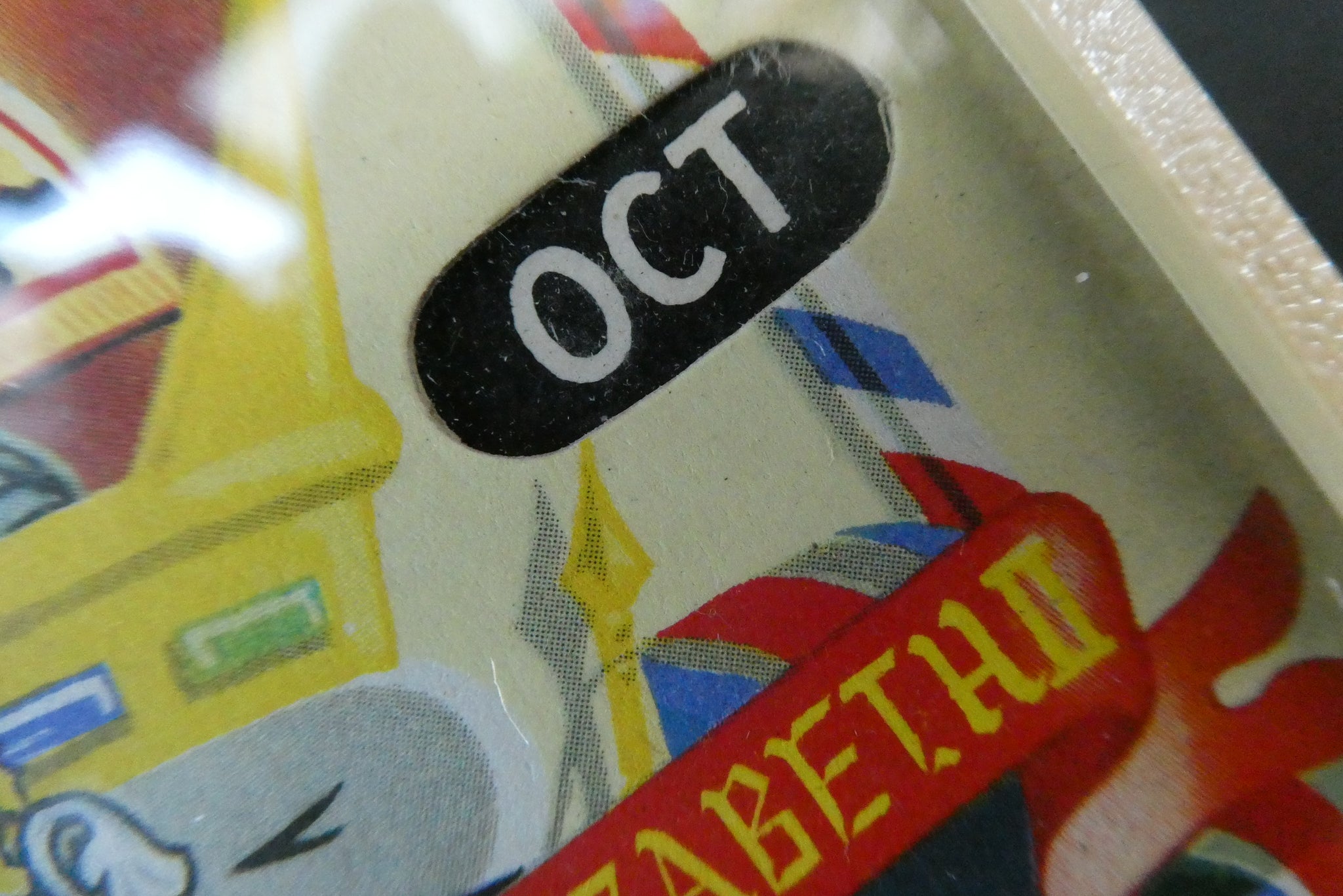 It dates to 1953 and was made to commemorate the Coronation of Queen Elizabeth. The calendar features an image of the Queen on horseback - riding side-saddle. Around her are a selection of flags and patriotic crests and shields.