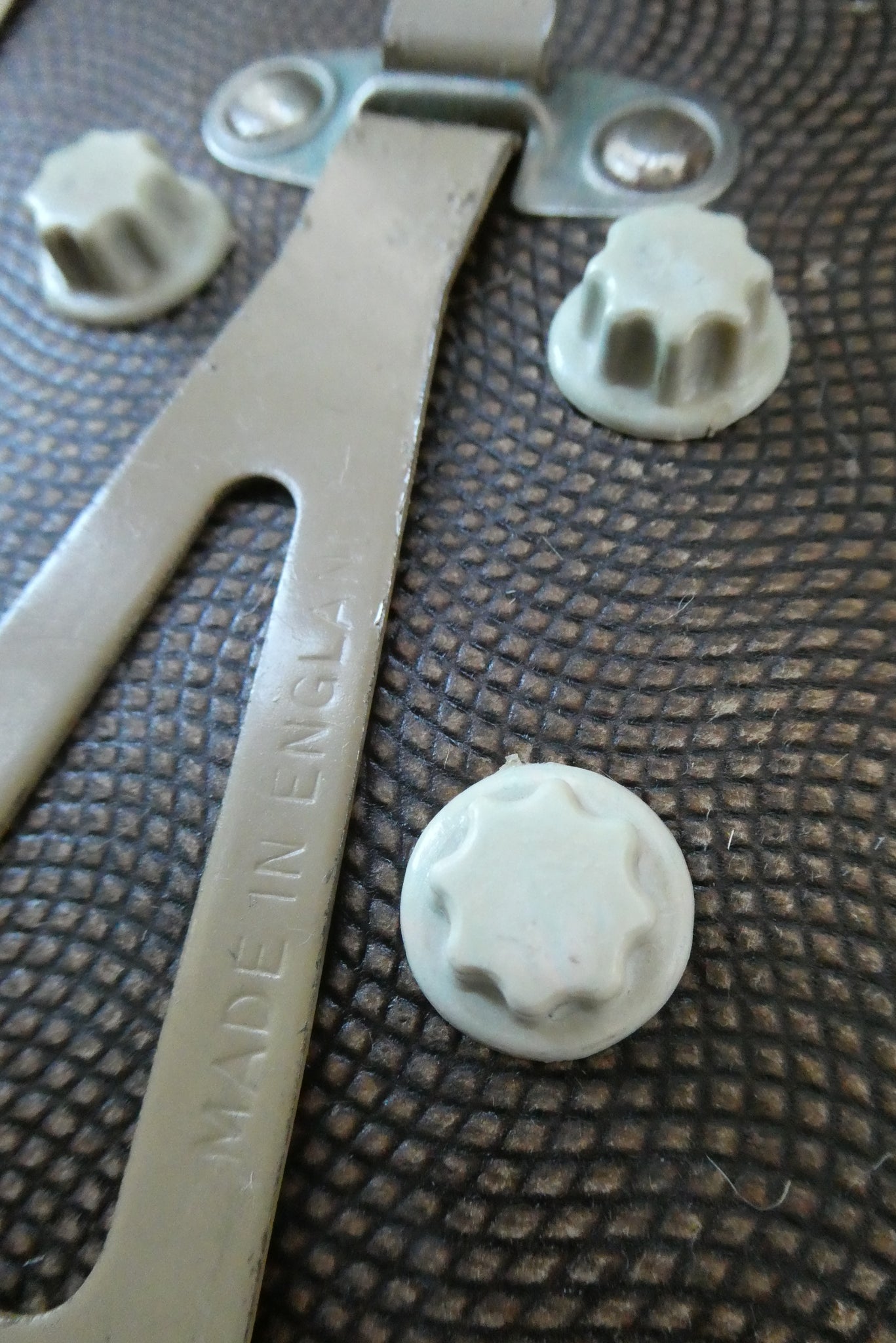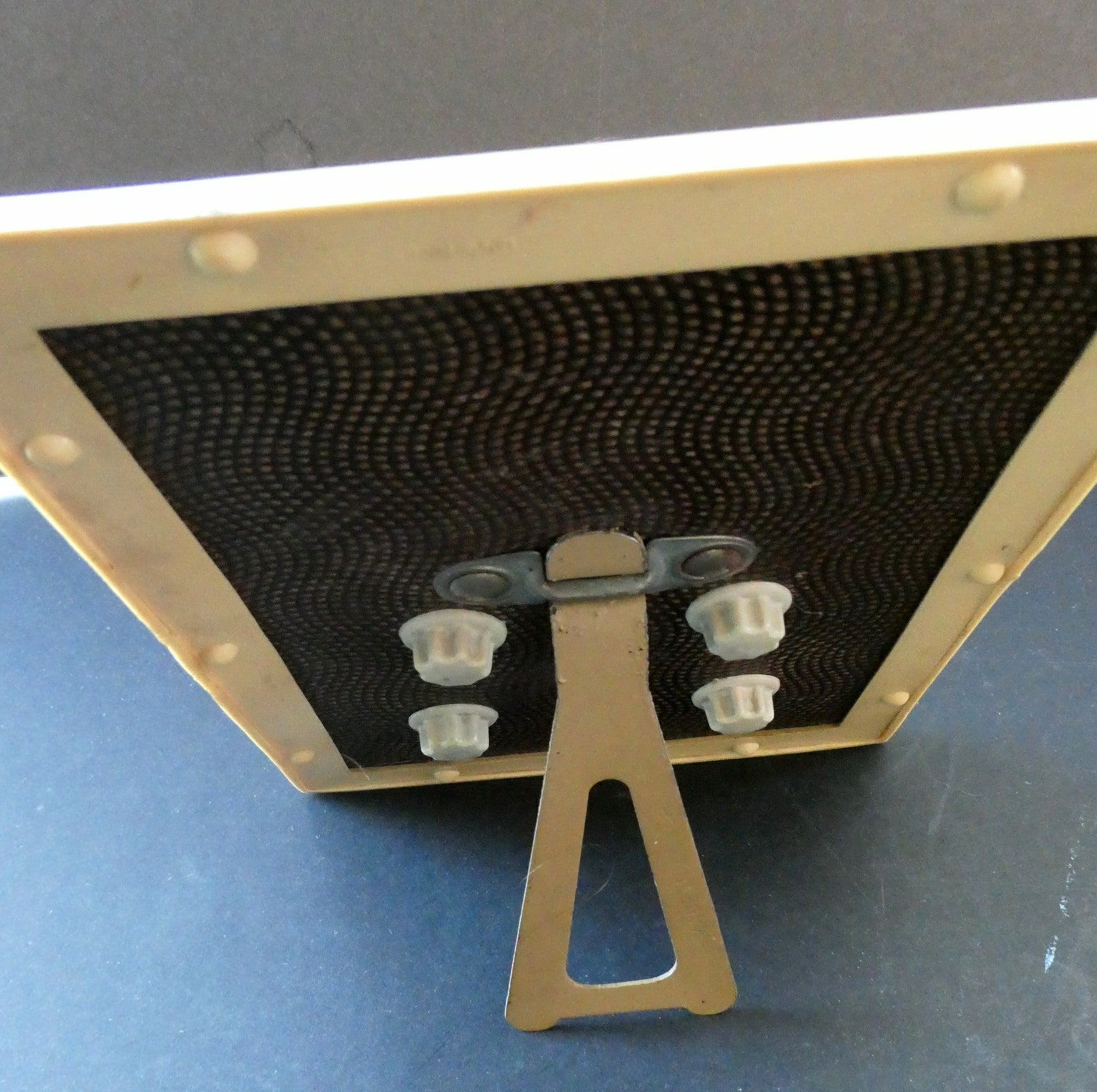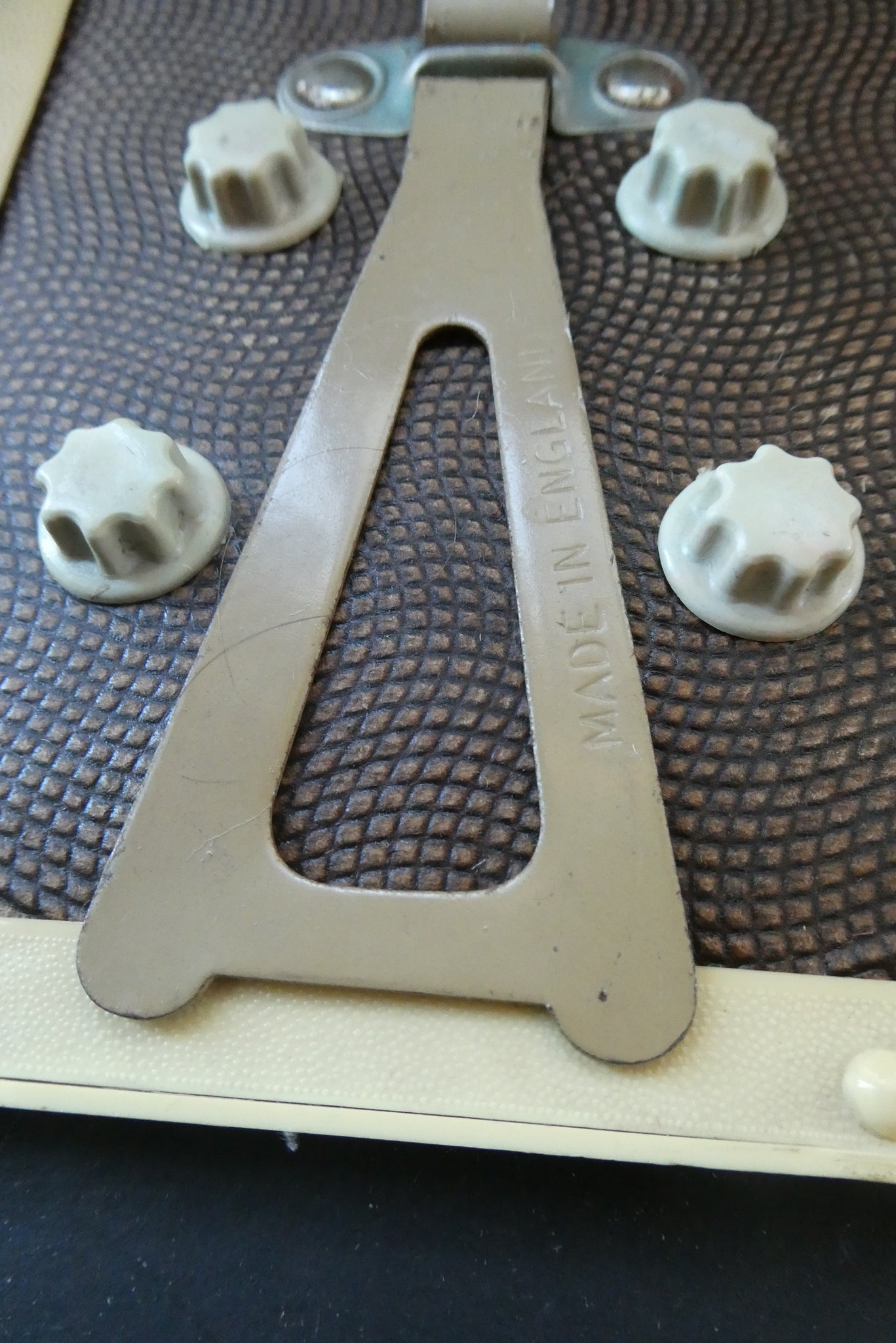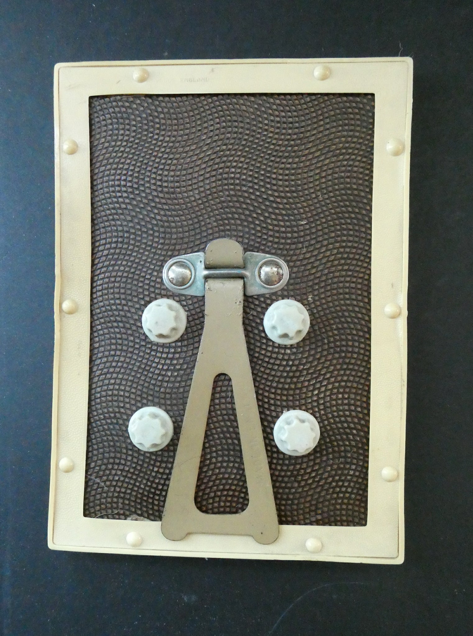 As you can see from my photographs - it is in good, clean vintage condition and all the dials to control the windows on the front of the calendar are present. The stand for popping on your desk is also present and it stays upright and firm. The dates are changed by four knobs on the back of the calendar which moves a wheel to the desired day, date, and month.