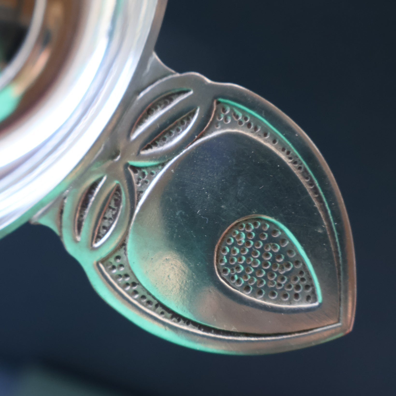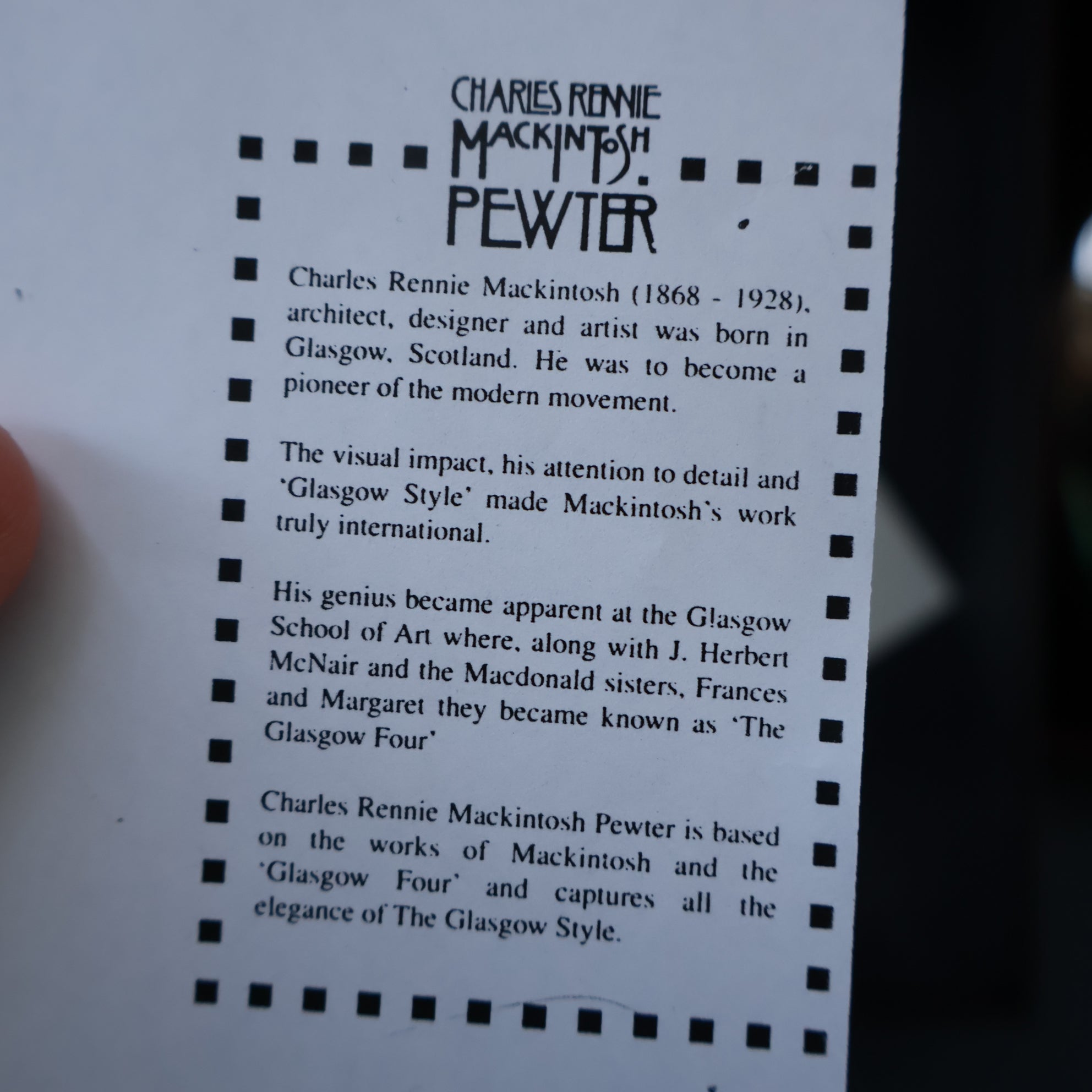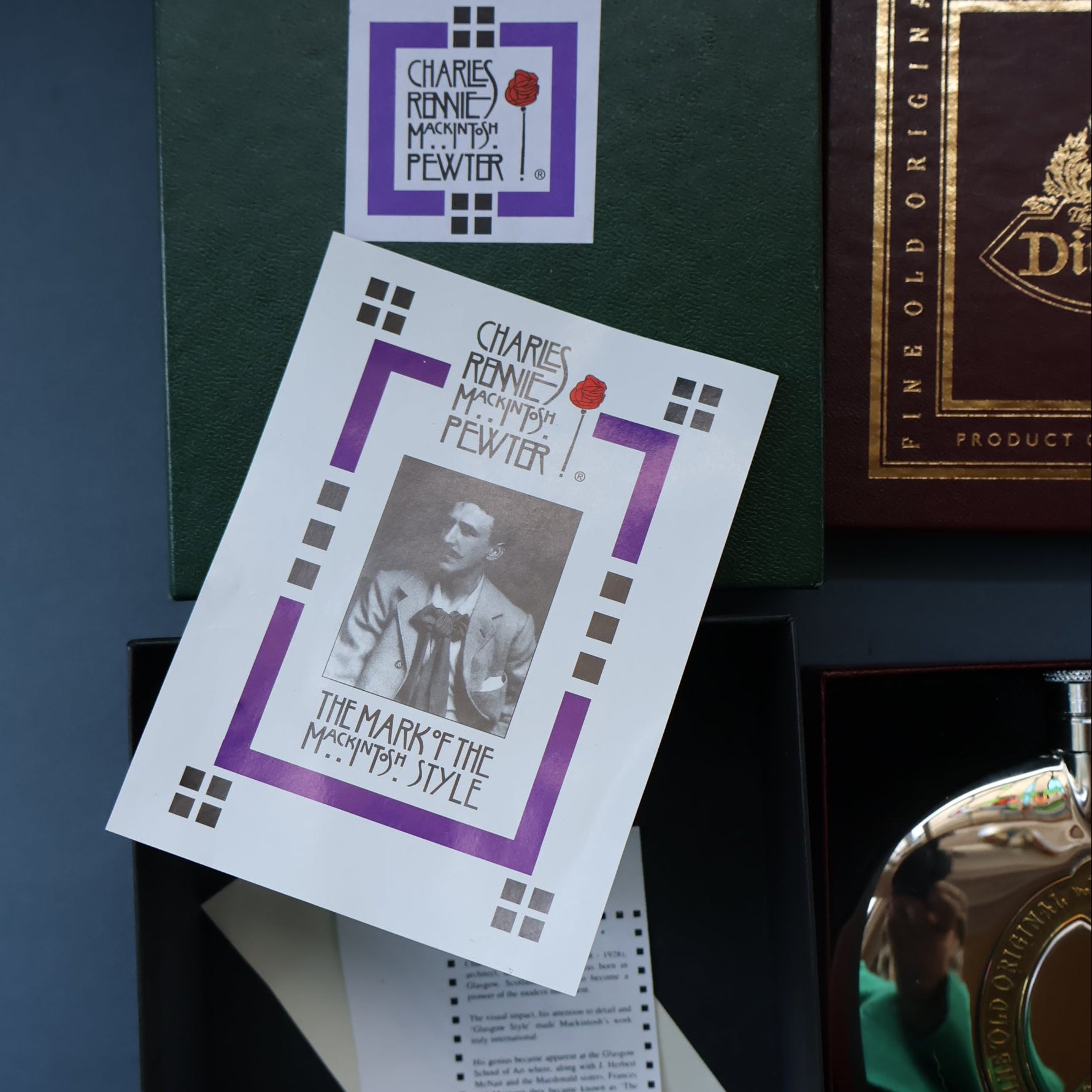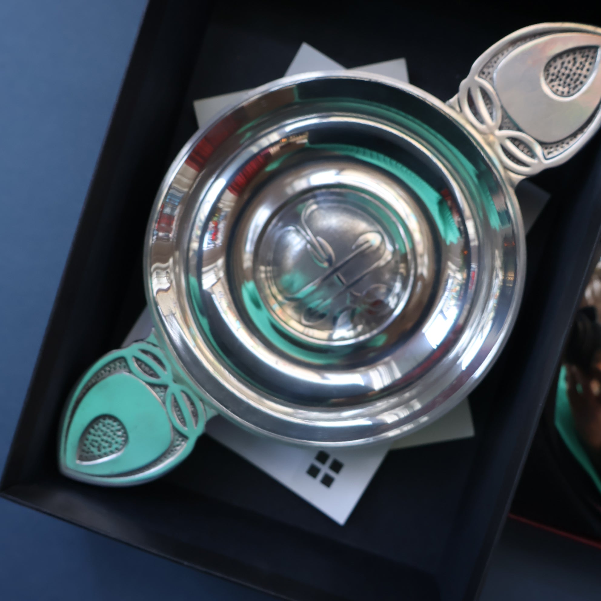 The first item is the pewter quaich inspired by designs by Charles Rennie Mackintosh. The quaich has an attractive art nouveau design on each handle and this is repeated on the design in the center of the bowl section. It comes with its original box, as photographed and has never been used. The quaich measures 4 3/4 inches in diameter and has a height of 1 1/4 inches. From handle to handle it is 8 inches. The box is 7 1/2 x 5 1/4 x 2 1/4 inches. I am listing it at a bargain £25.