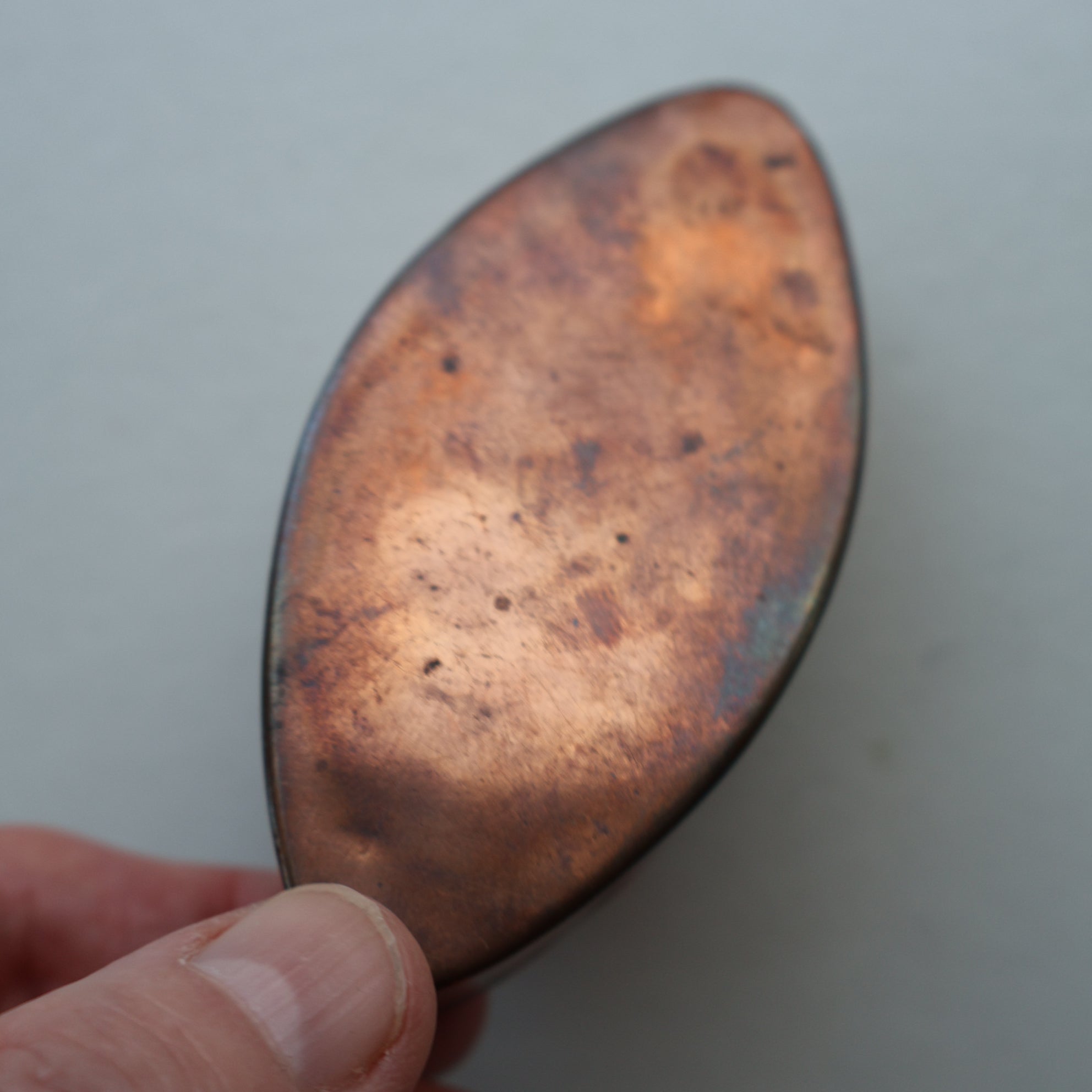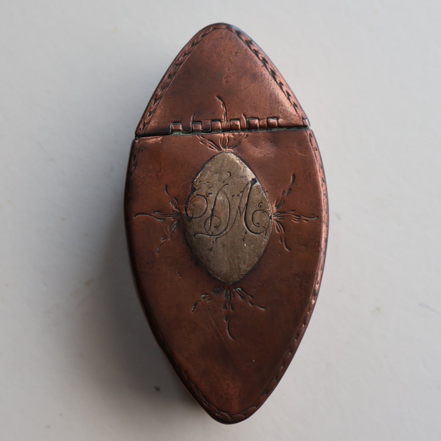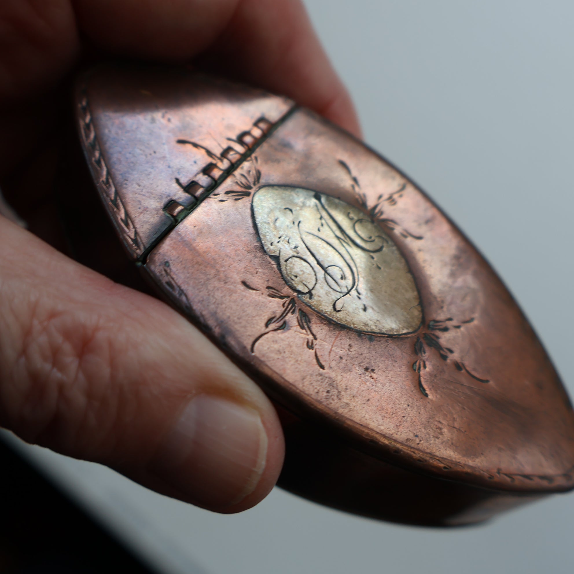The little snuff box is made of copper with a silver-coloured (probably silver) lozenge on the top with the initials of the previous owner engraved on it in old copperplate script. It looks like it has been hand-made. Around the silver lozenge are little engraved decoration which look like sprigs of foliage.
