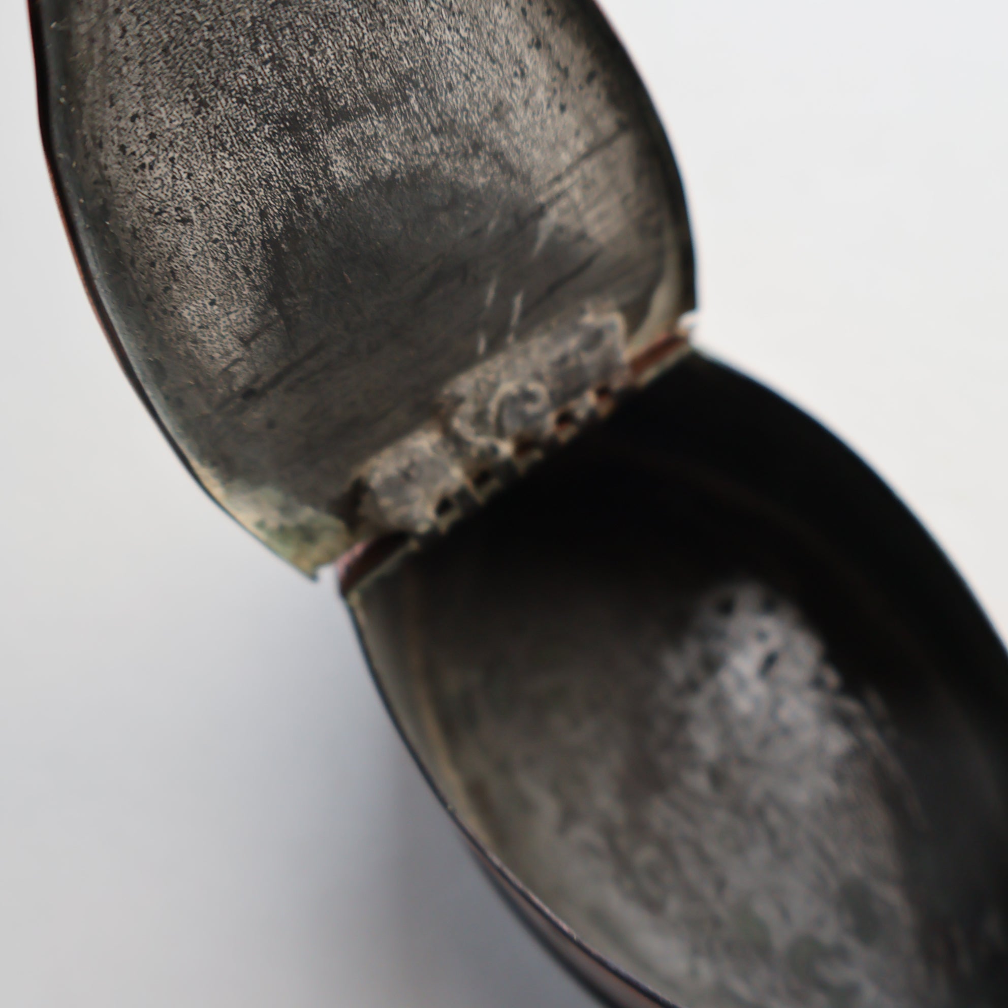 The box is hinged on the top, three quarters along the length. This hinge lifts upwards to allow you to get easy access to the contents inside. It closes nicely to form a tight closure. There has been an issue in the distant past with the hinge inside as it looks like it has some solder added to give more strength. The inside of the box has been tinned when created to allow the snuff to be kept in it all nice and fresh.