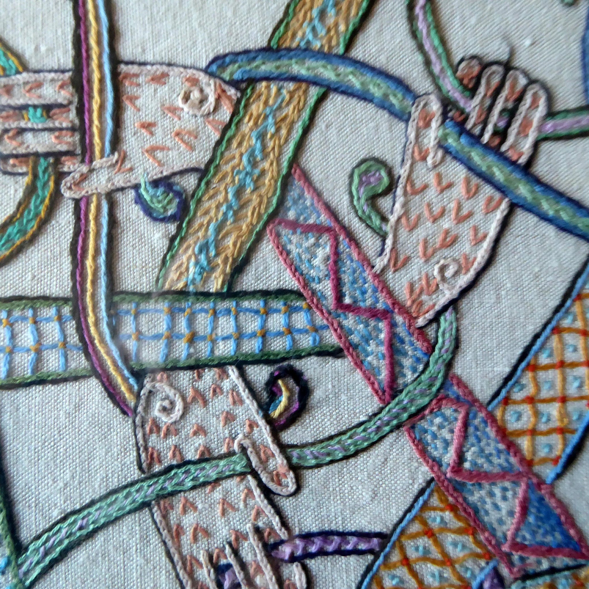 This is a very interesting vintage Celtic embroidery and shows three entwined men - it is embroidered on a thick weave buff cotton material. The colours are nice and bright. It is very nicely embroidered with thick embroidery threads in a myriad of subtle colours - and obviously relates to Bain's Book of Kells design work.