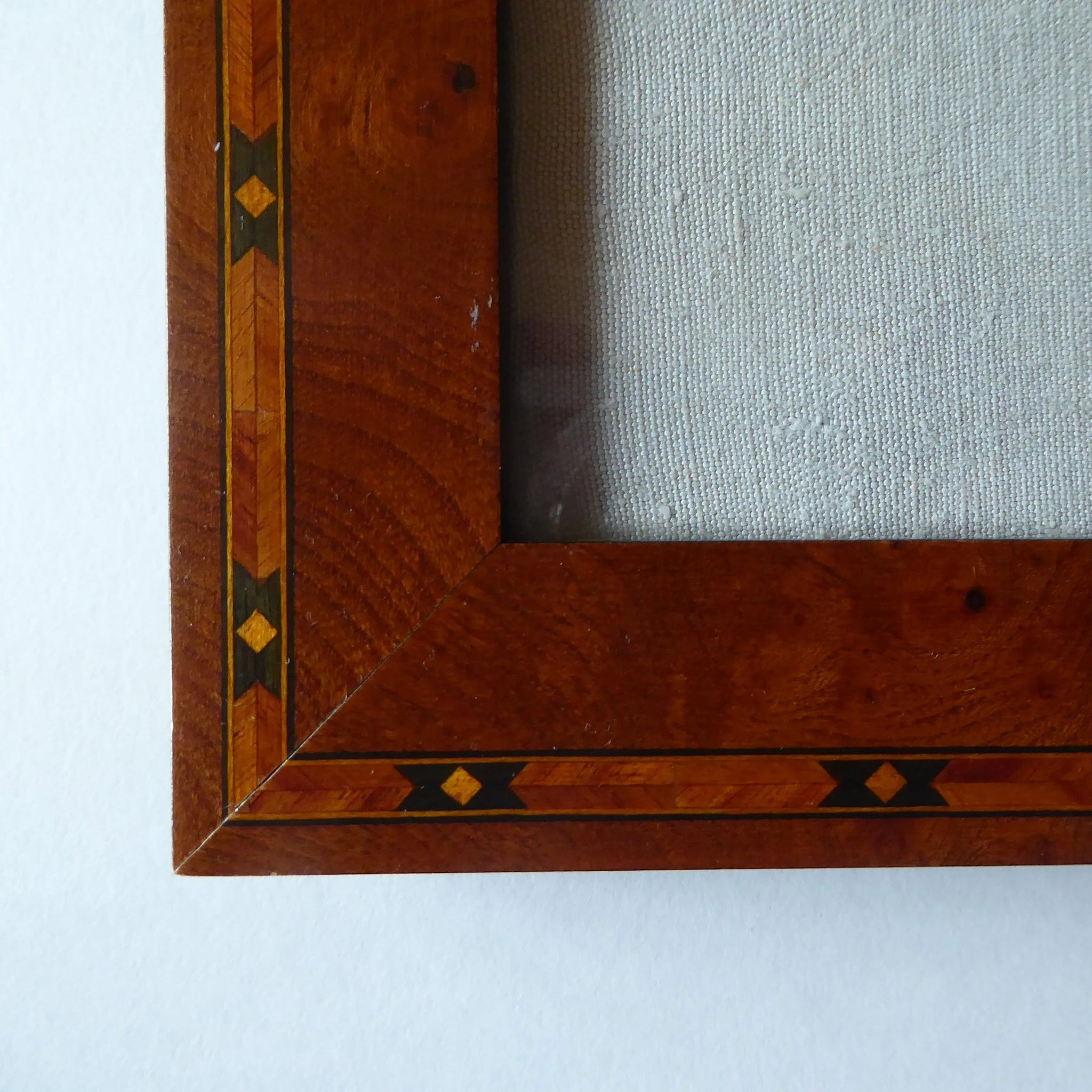 The frame is just lovely and was an expensive one and a most special choice - it is made of bird's eye maple with a decorative Art Deco inlay all around - which would suggest a probable date of around the 1930s - which would fit in with the Coates exhibition, as mentioned above. However, this would have to remain speculative.