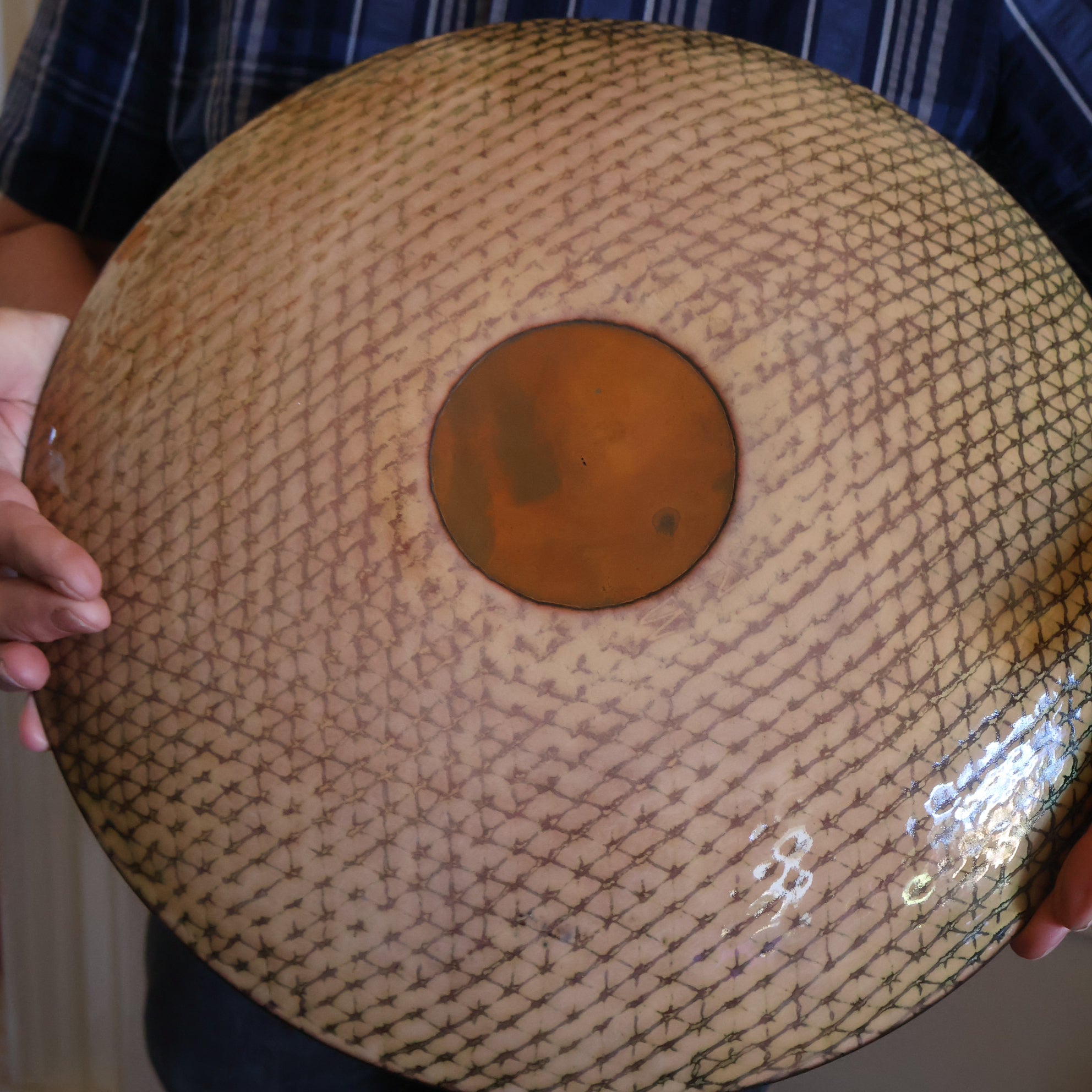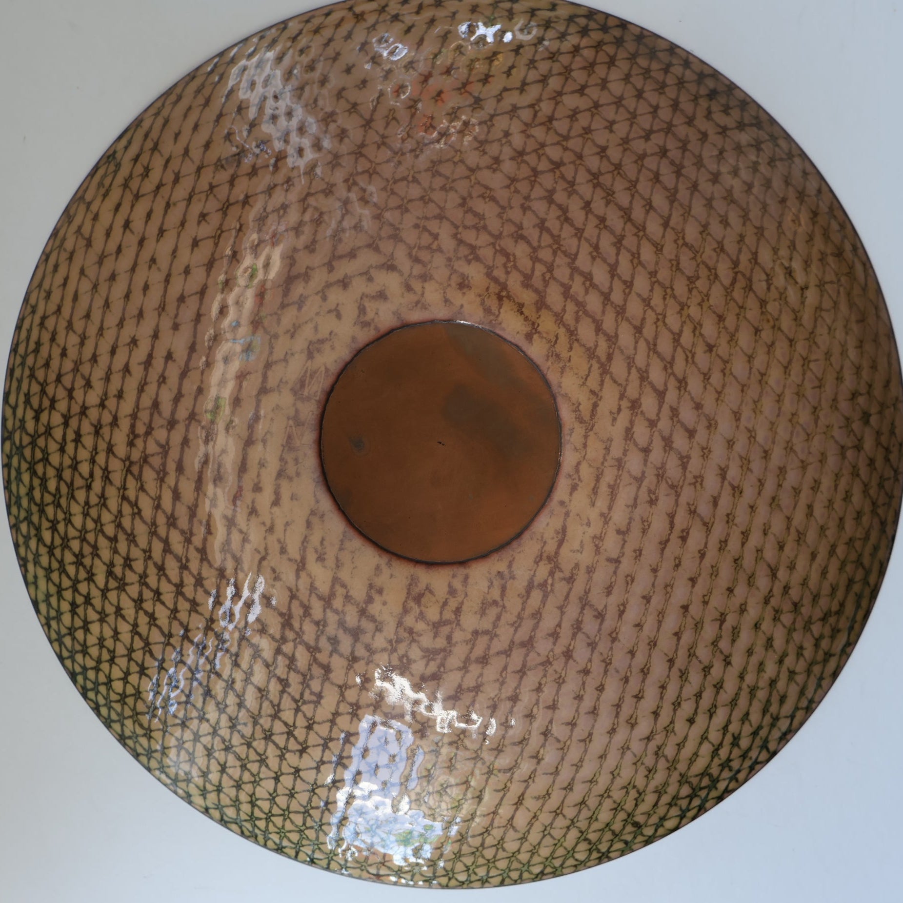 This is a large copper charger designed and made by Ann Robin Banks.