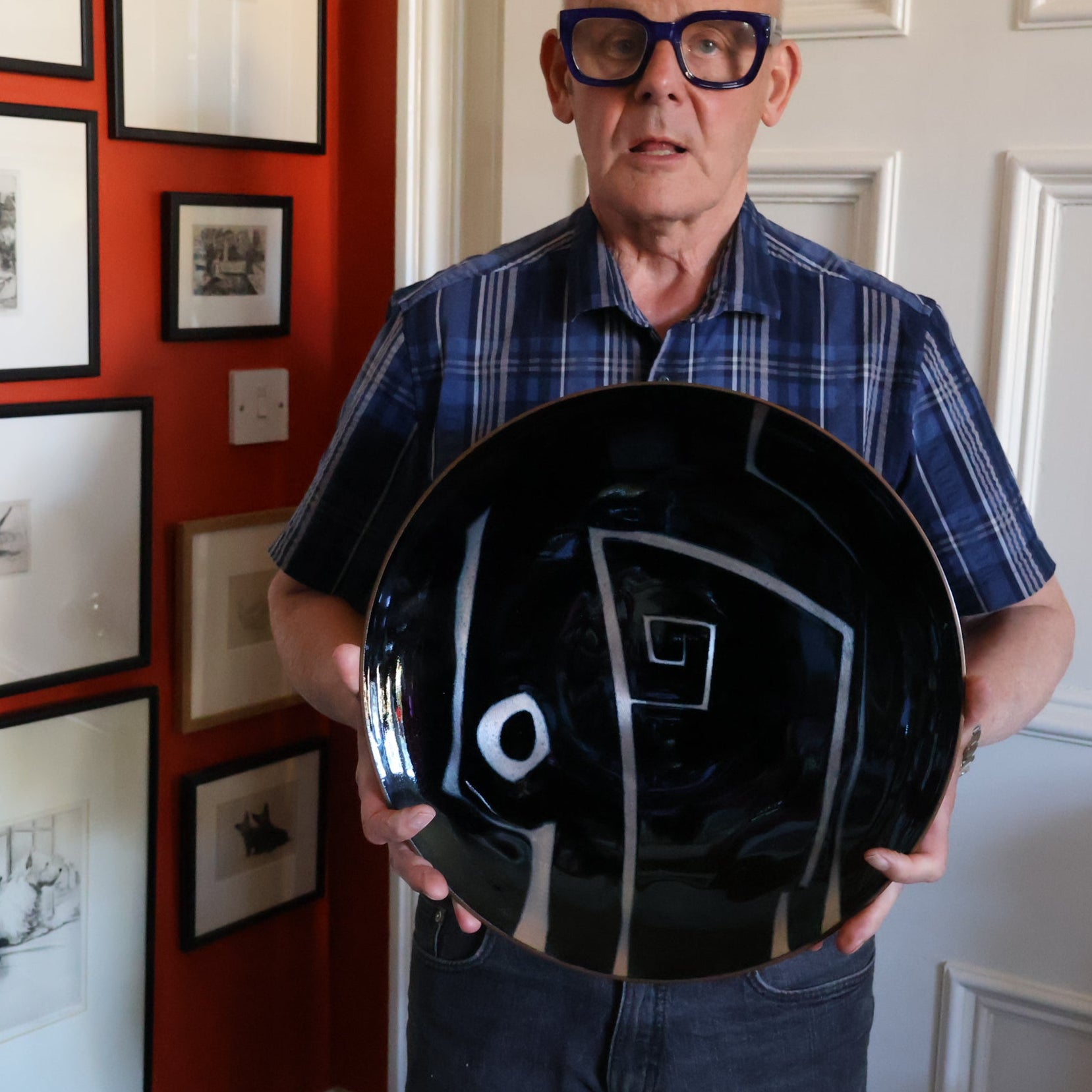 Ann never had any formal training, going straight from school to work. She began working life as a photographer in the 1950s and worked with Anthony Armstrong Jones. Bit her interest soon turned to creating murals and these large glass fused enamel copper dishes. She worked on a large scale on sculptural pieces and large dishes – until the price of copper made it to expensive an art form to pursue.