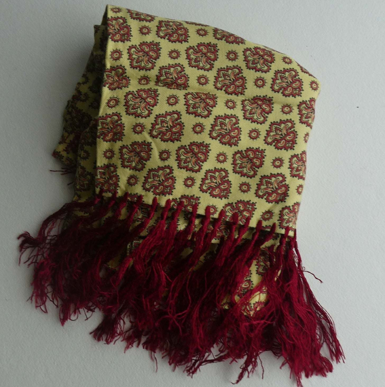 This one has no damage to it. It has a bright yellow ground colour and a red Paisley-style pattern. It has long red fringes at each end.
