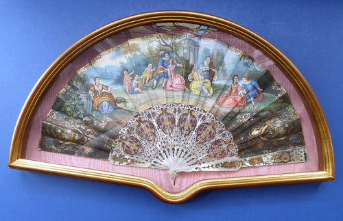 Antique FRAMED Hand Painted Fan with mother of pearl sticks and guards: shaped, carved, pierced and gilt. FETE GALANTE design
