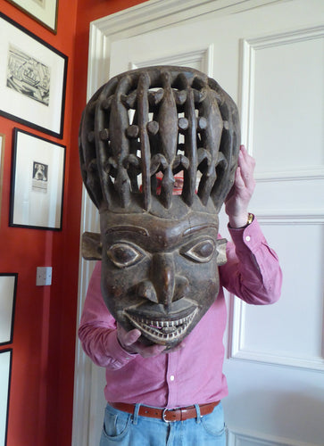 MASSIVE SIZE. Vintage Early / Mid 20th Century Cameroon Bamileke Wooden Helmet Mask with Carved Crocodile Headress