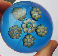 It is a medium millefiori weight with five cane clusters surrounding a central cluster on a translucent Kingfisher blue base (with a slight green tinge on the table surface). Each cluster contains six or seven canes in a ring or rosette around a central cane. The paperweight has a flat polished star-cut base. It is unsigned - it dates from 1969 - 1973.