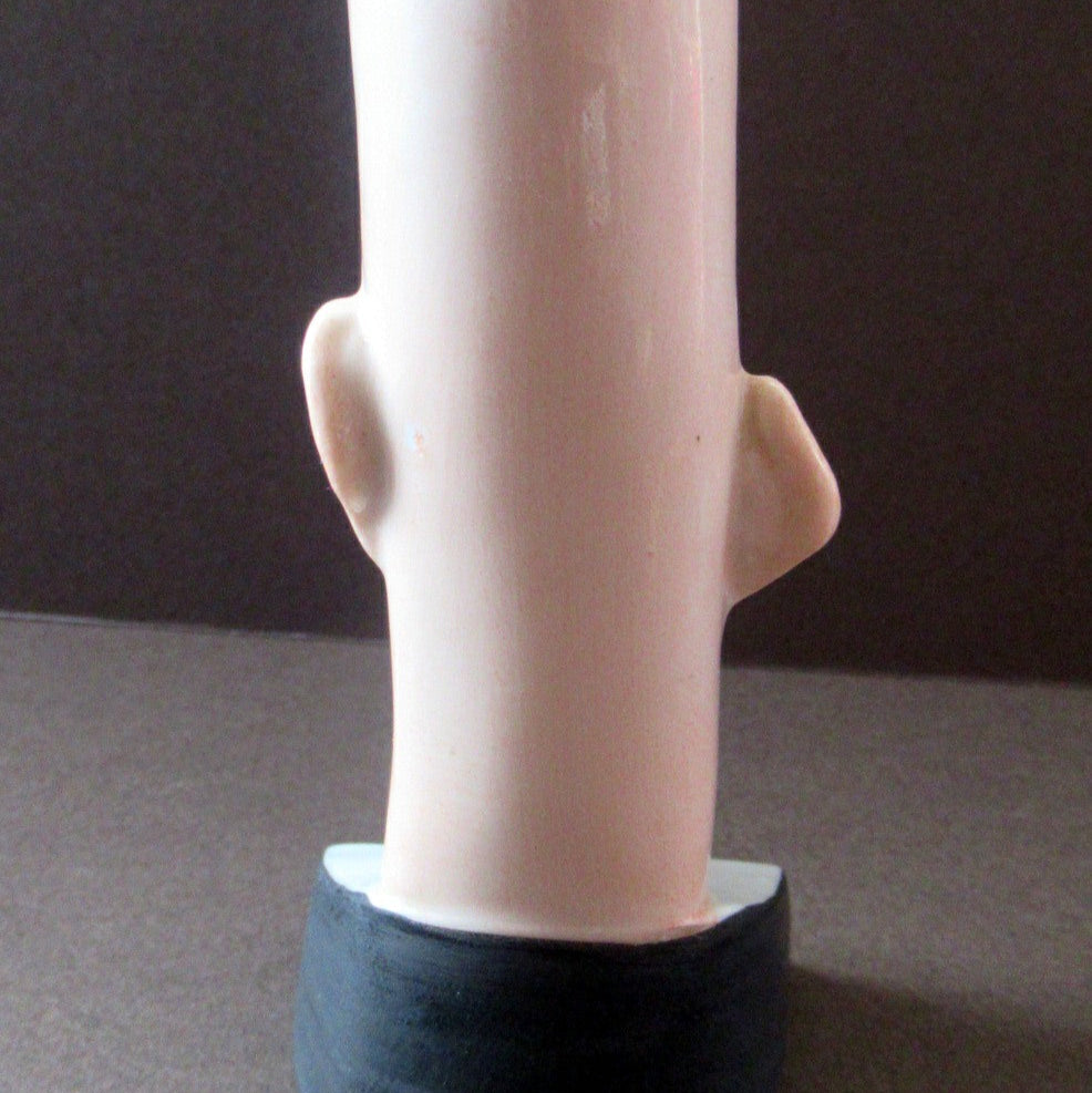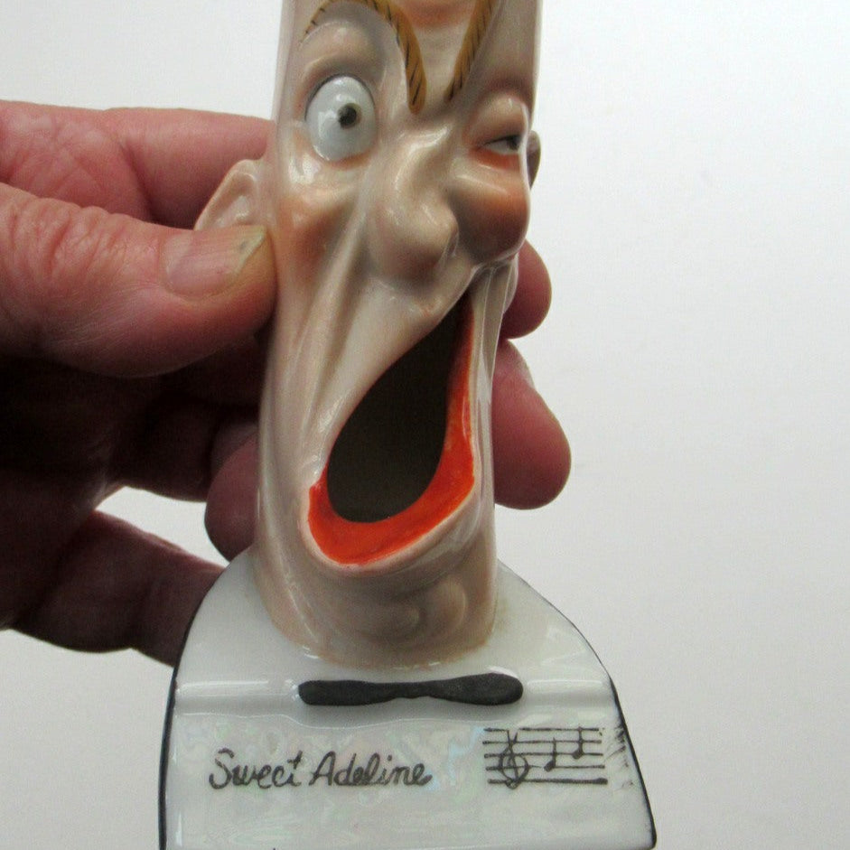 This little figure is known as a smoking head. It is an ashtray in the form of an exaggerated, elongated head of a bald gentleman. Your cigarette would rest in the head's mouth - and the smoke would come out of his ears.