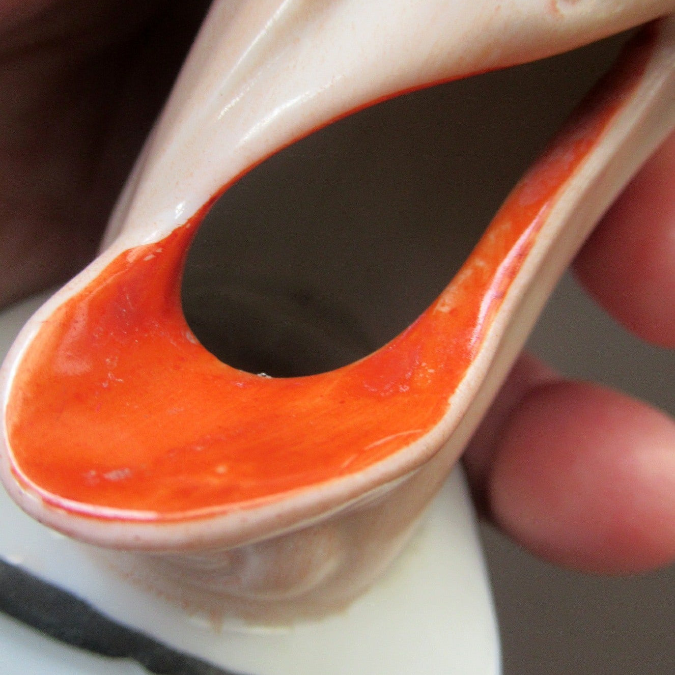 Schafer & Vater were better known for their comical and figural items. They manufactured these in teapots, jugs, creamers, bottles, match strikers, and planters, with a backstamp impressed with a crown above an 'R' in a star. 'Made in Germany' was sometimes stamped in black. Occasionally, Schafer & Vater pieces appear without any stamps or reference to their origin, but they are easy to recognise due to their characteristics and unique craftsmanship and unusual design.