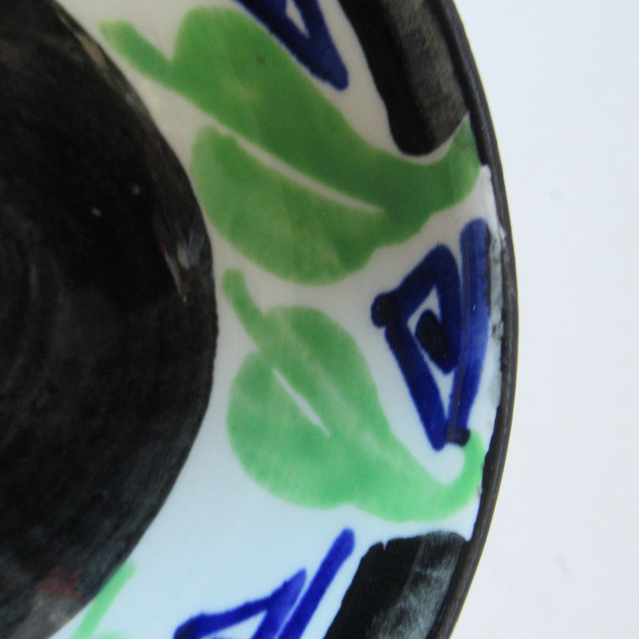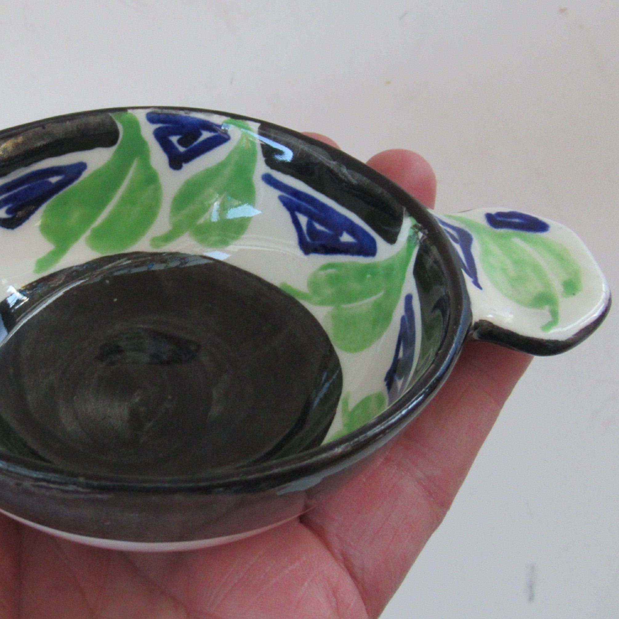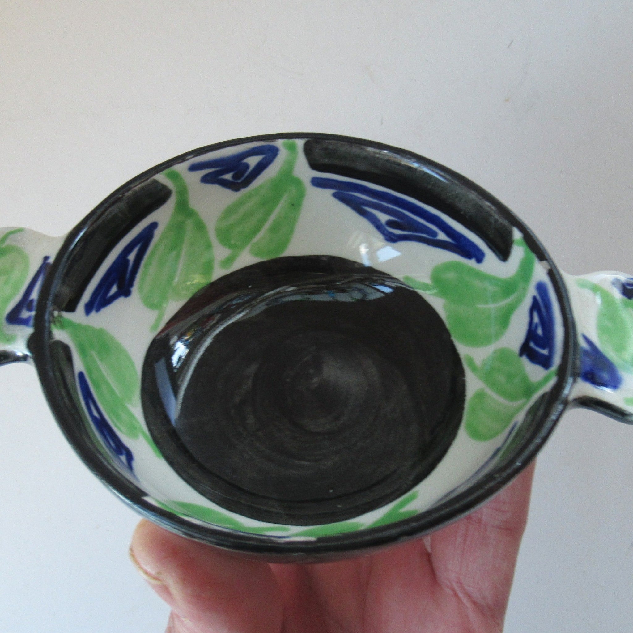This fine ceramic quaich is rare and has a much sought-after Art Deco pattern. It has a black central reserve inside - with a decorative band at the top with black, blue, and green patterns. These repeat on the lug handles. The exterior has a plain black band at the rim.