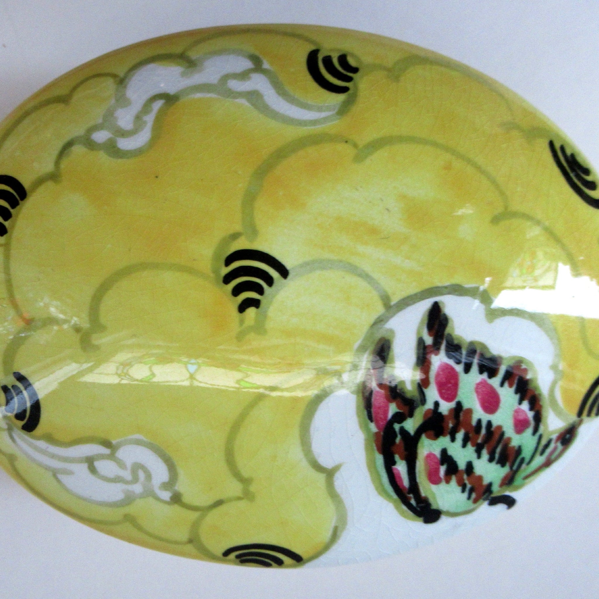 It is a glorious vibrant canary yellow colour (even more vibrant in "real life" than in my photos). It is hand-painted in abstract patterns - which I think the decorator must have borrowed from Japanese works.