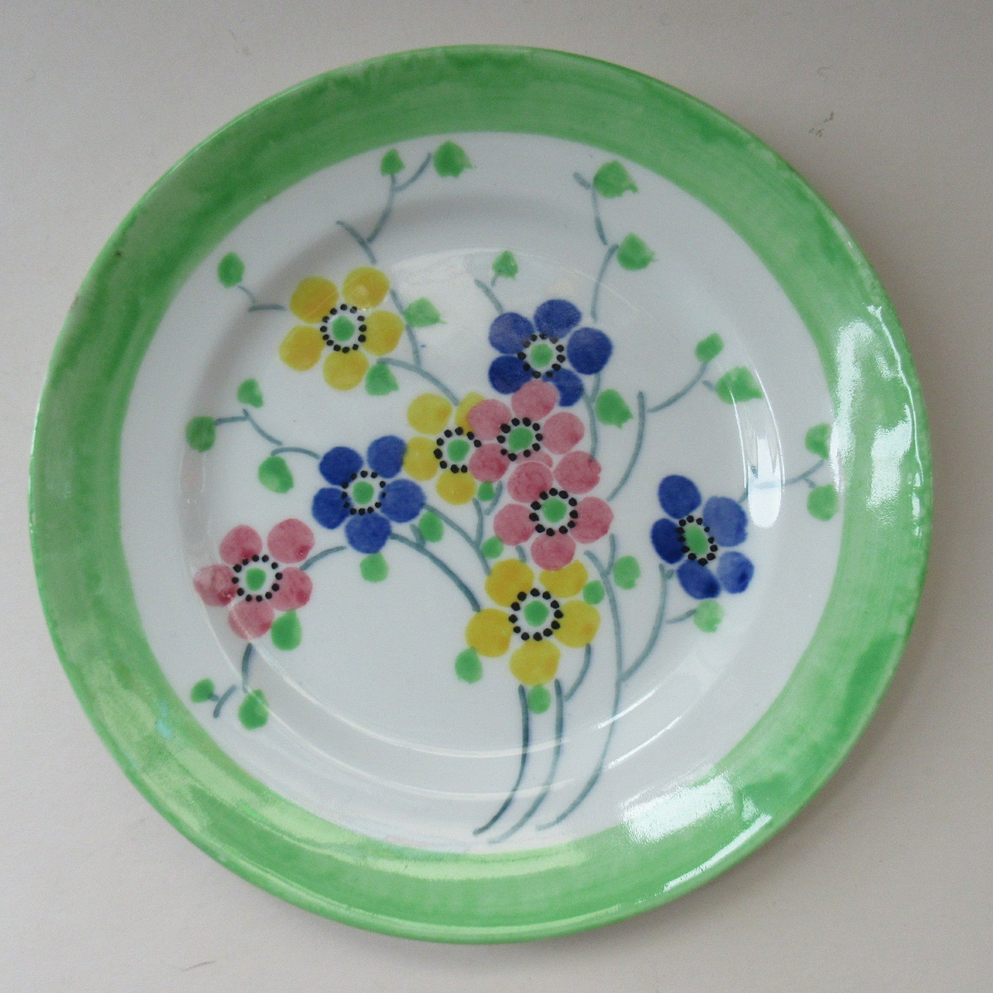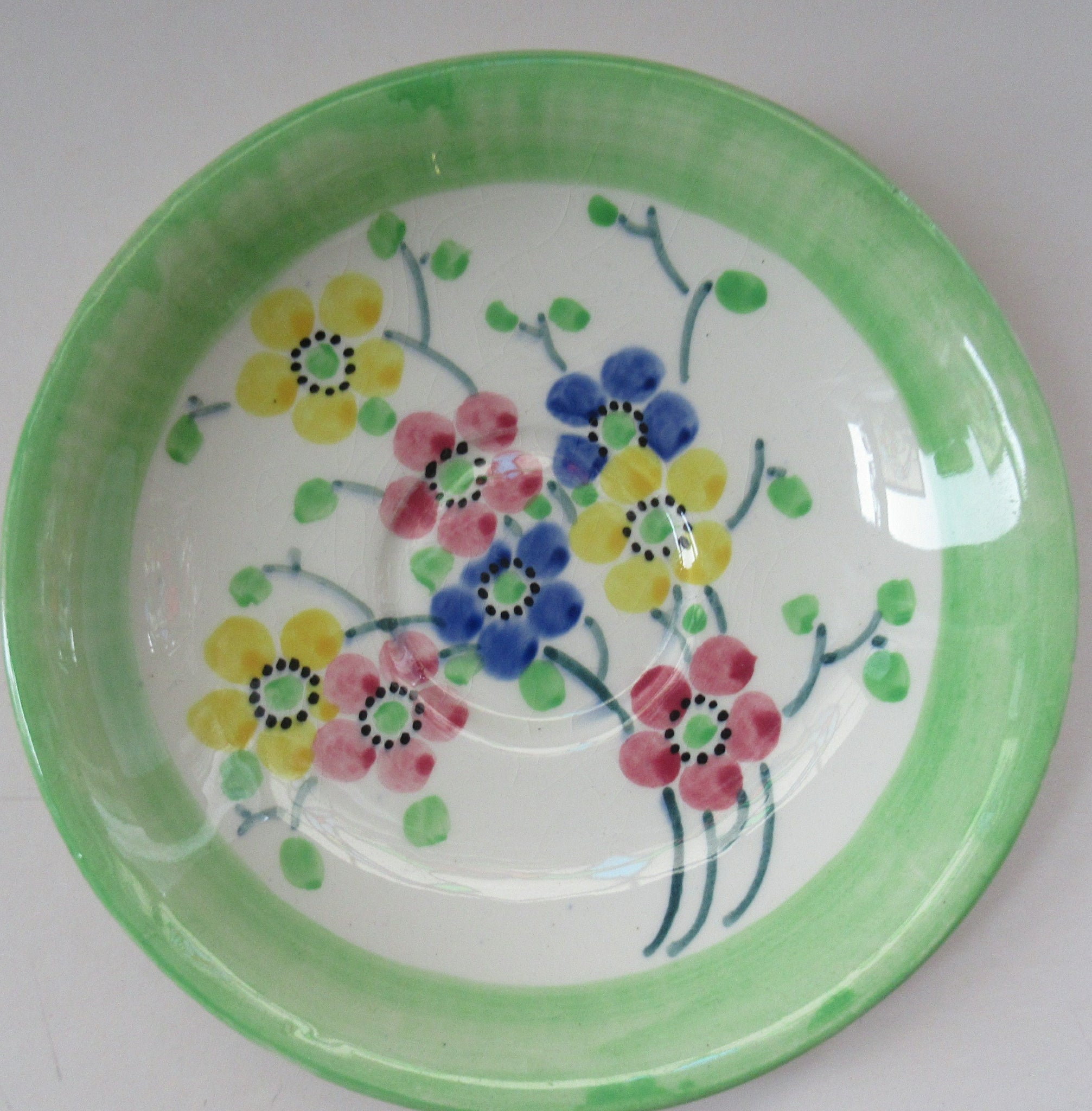 This is a cute little hand-painted trio of early 20th century Bough pottery pieces. They are more cabinet pieces for display rather than functional.