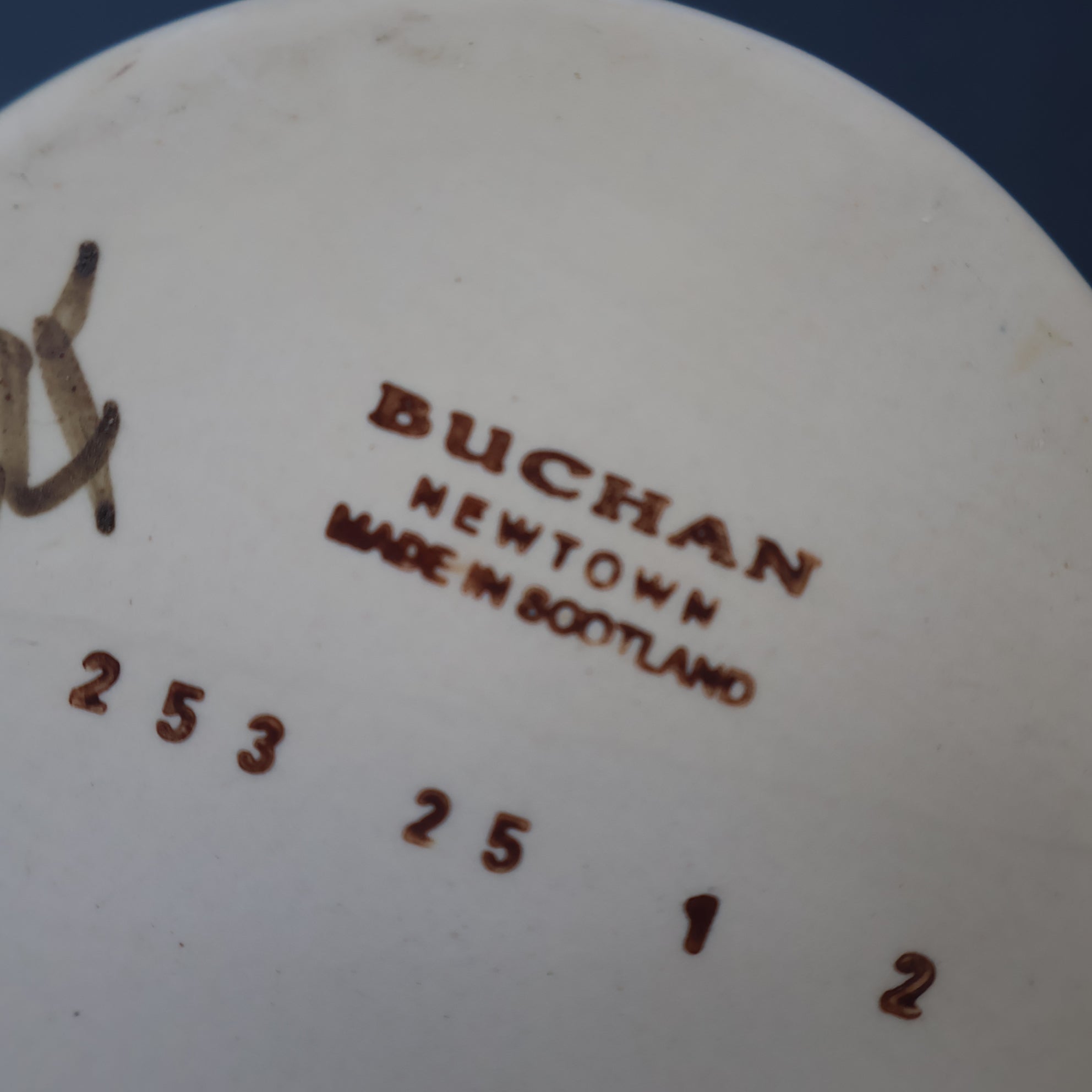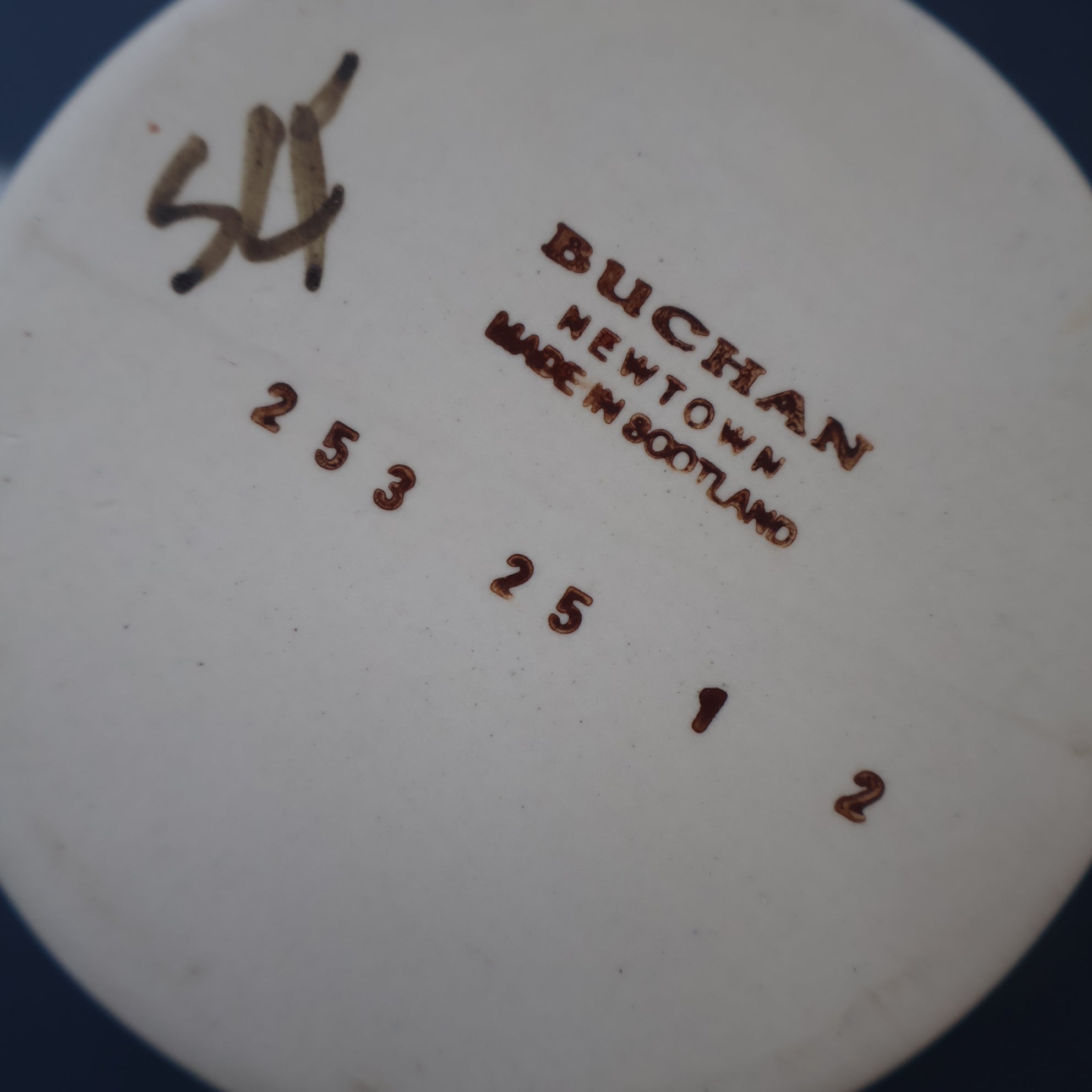The pattern is a late one, probably produced after the Portobello factory closed in 1972 and manufacturing moved to Crieff. The backstamp as no reference to it being made at Portobello or the factory being A. W. Buchan & Co. Also the style of the decoration seems to suggest a date of around the mid 1980s which would fit with it being made at Crieff. (Just to confuse things Buchan did continue of use a backstamp with Portobello on it when they were at Crieff!).